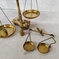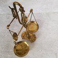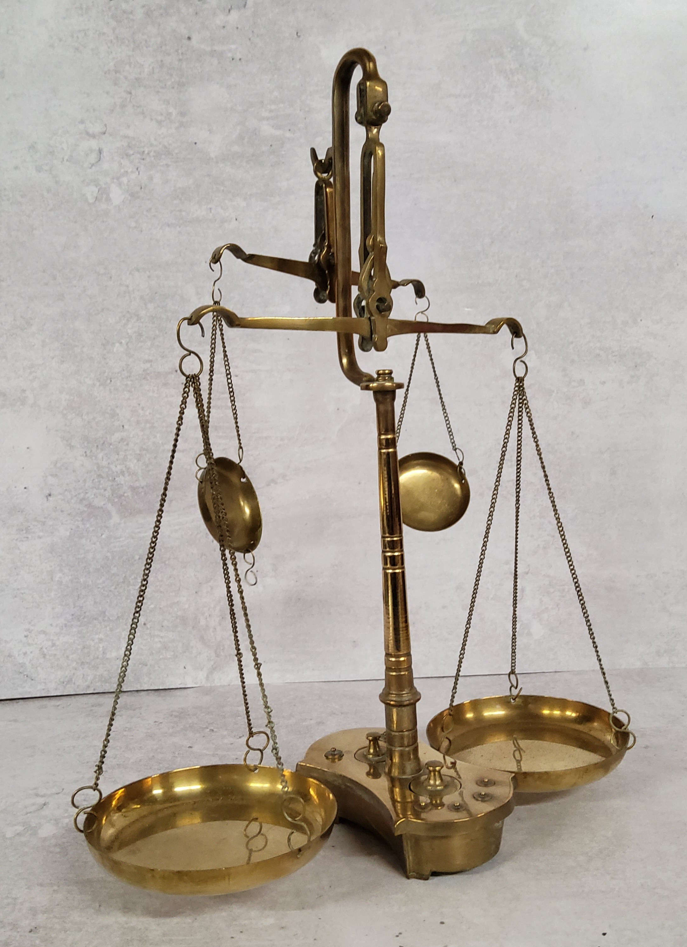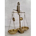 A late Victorian brass double beam weighing scales base holding 8 weights, (AF)