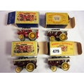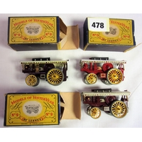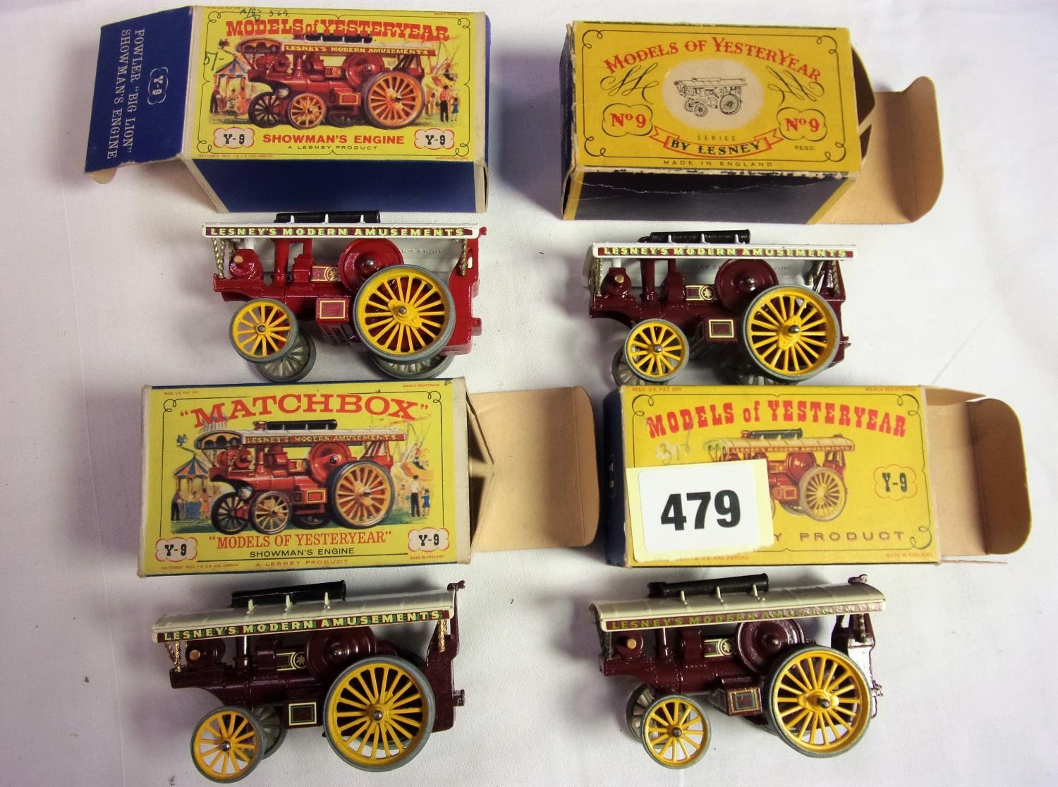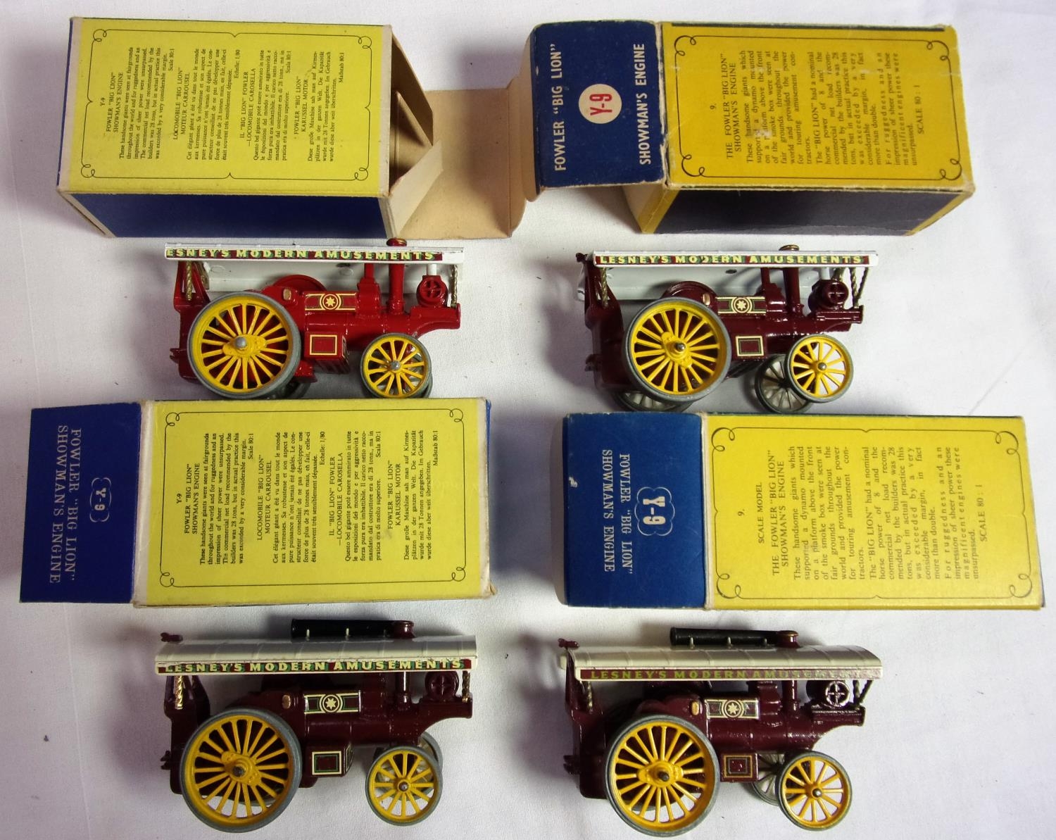LESNEY MODELS OF YESTERYEAR, EARLY Y SERIES COMPRISING 4 MODELS WITH DIFFERENT BOX STYLES, NUMBER 9 Y9, Y9 MODEL YESTERYEAR SHOWMANS ENGINE AND Y9 SHOWMANS ENGINE ALL IN GOOD BOXED CONDITION DIFFERENT SHADES OF RED AND MAROONS