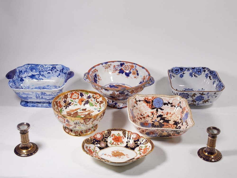 A group of British ceramic decorative bowls and centrepieces, 19th - 20th centuries, comprising: a pair of Spode porcelain columnar candlesticks of dark blue ground with gilt caillouté and line decoration, red SPODE and impressed numbers, 10.5 cm high; a Spode New Stone chinoiserie square deep bowl decorated with flowering rockwork in underglaze blue with gilt and dark blue highlights, impressed and painted marks, 11cm high, 24cm wide; a porcelain square deep bowl decorated in Imari palette with gilt highlights, unmarked, probably Staffordshire, 9cm high, 25cm wide; a Minton New Stone circular two-handled footed bowl, c.1859, impressed marks, date code, and printed marks, decorated in the 'Oriental Japan' pattern, 13cm high. 32cm wide; a Leeds pottery salad bowl with a view of St Rosalie, Don Factory, c.1880, with lion mask handles, 12.5cm high, 30.5cm wide; an Aynsley porcelain lozenge-shaped dish decorated in the Imari palette with gilt highlights, green printed mark, 25.4cm wide; and an Amhurst ironstone porcelain fruit bowl, in the Japan pattern with gilt highlights, 11.4cm high, 21.5cm diameter (8)