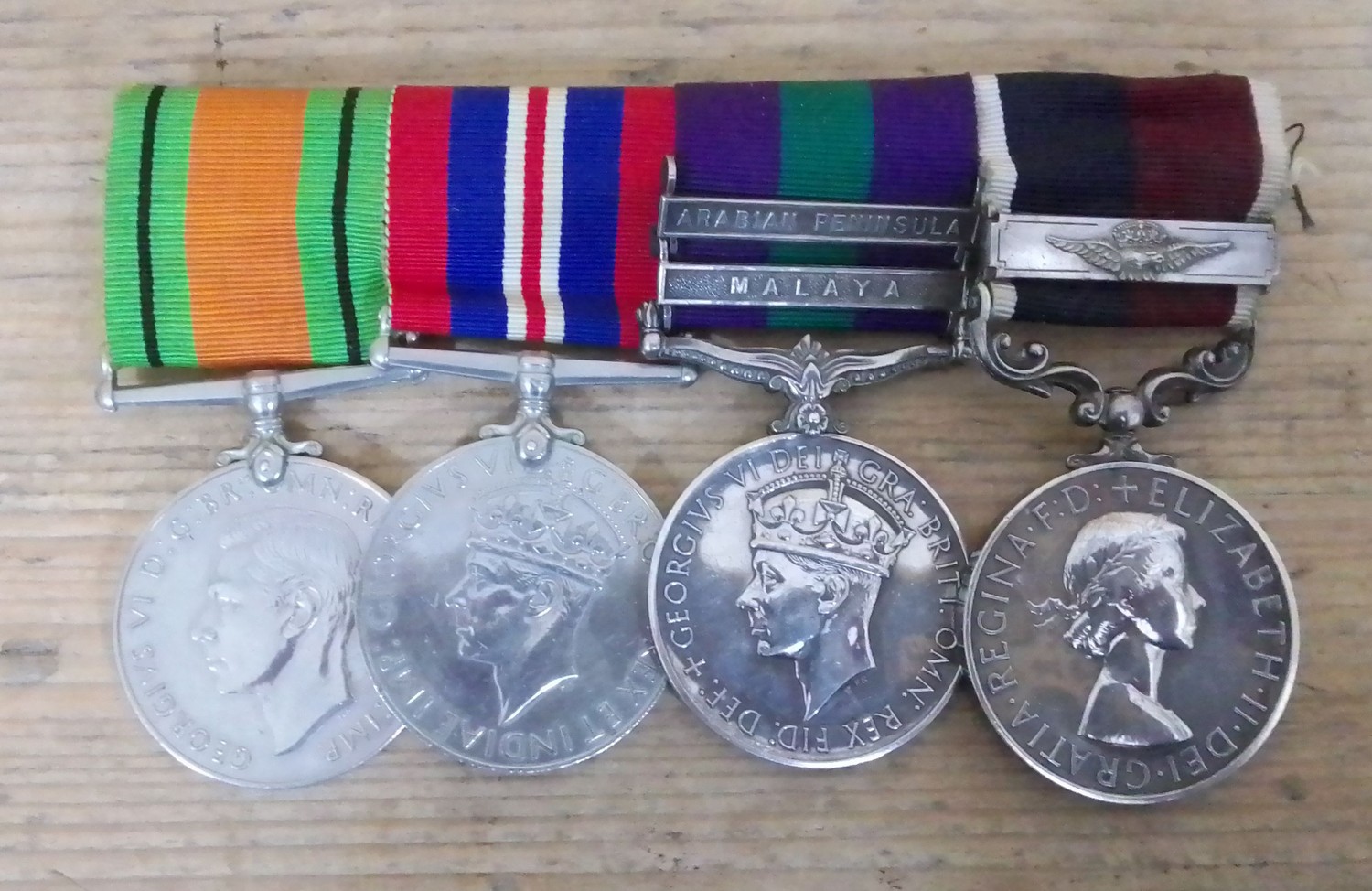 RAF WWII and post war group of four comprising Defence, 1939-45 War, General Service with Arabian Peninsula and Malaya clasps and Long Service medal awarded to 573842 Sgt. C.H. Day R.A.F.