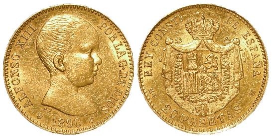 Spain gold 20 Pesetas 1890 *90* MP-M, KM# 693, aEF (0.1867 troy oz AGW)