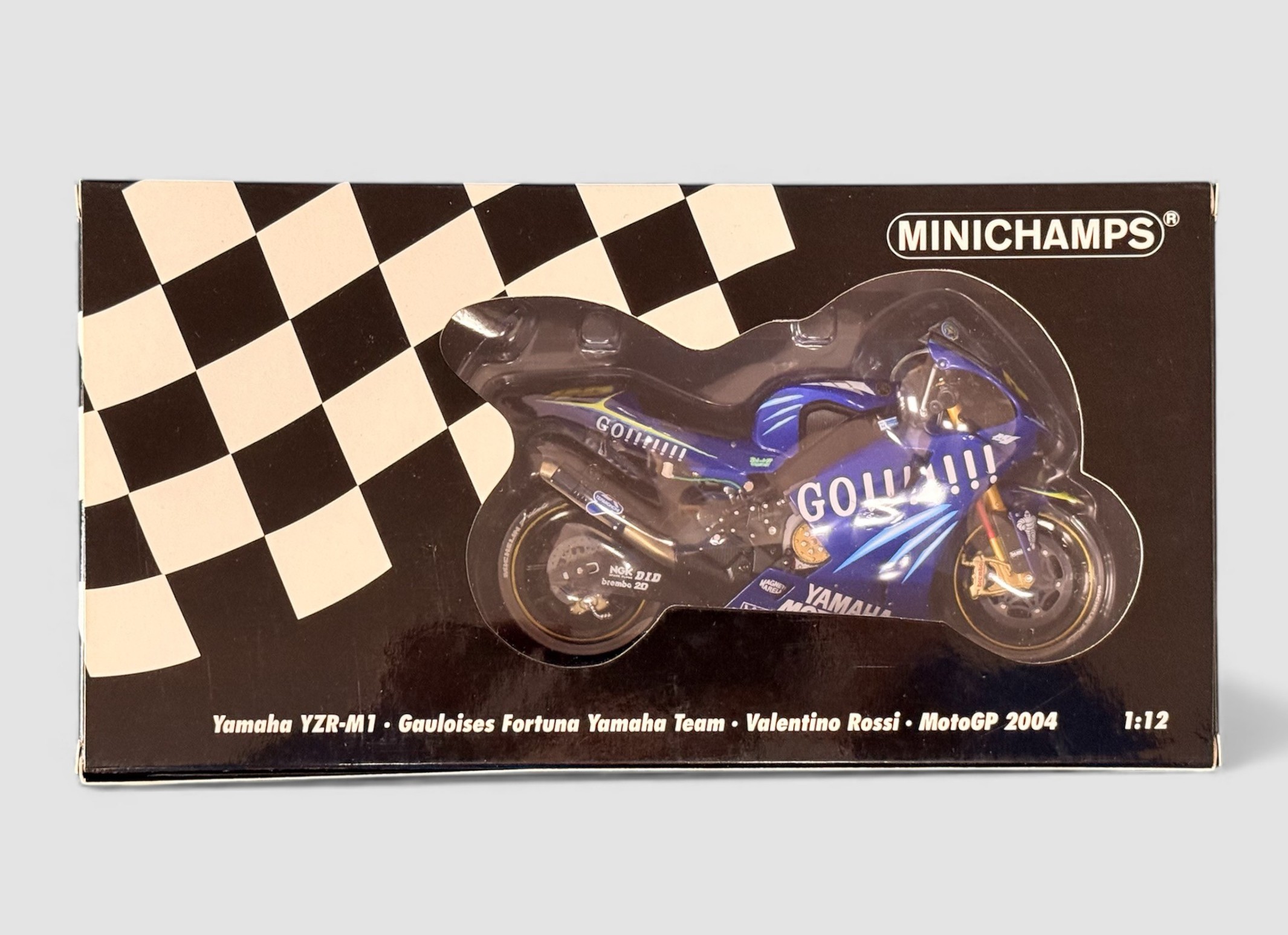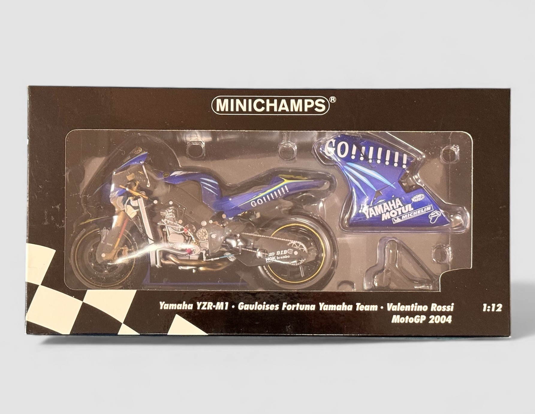 Minichamps 1/12th scale Yamaha YZR-M1 2004 Gauloises Fortuna V Rossi No. 122 043046, generally excellent in excellent window box including inner plastic clamshell. Contents unchecked for completeness or correctness and viewing recommended.