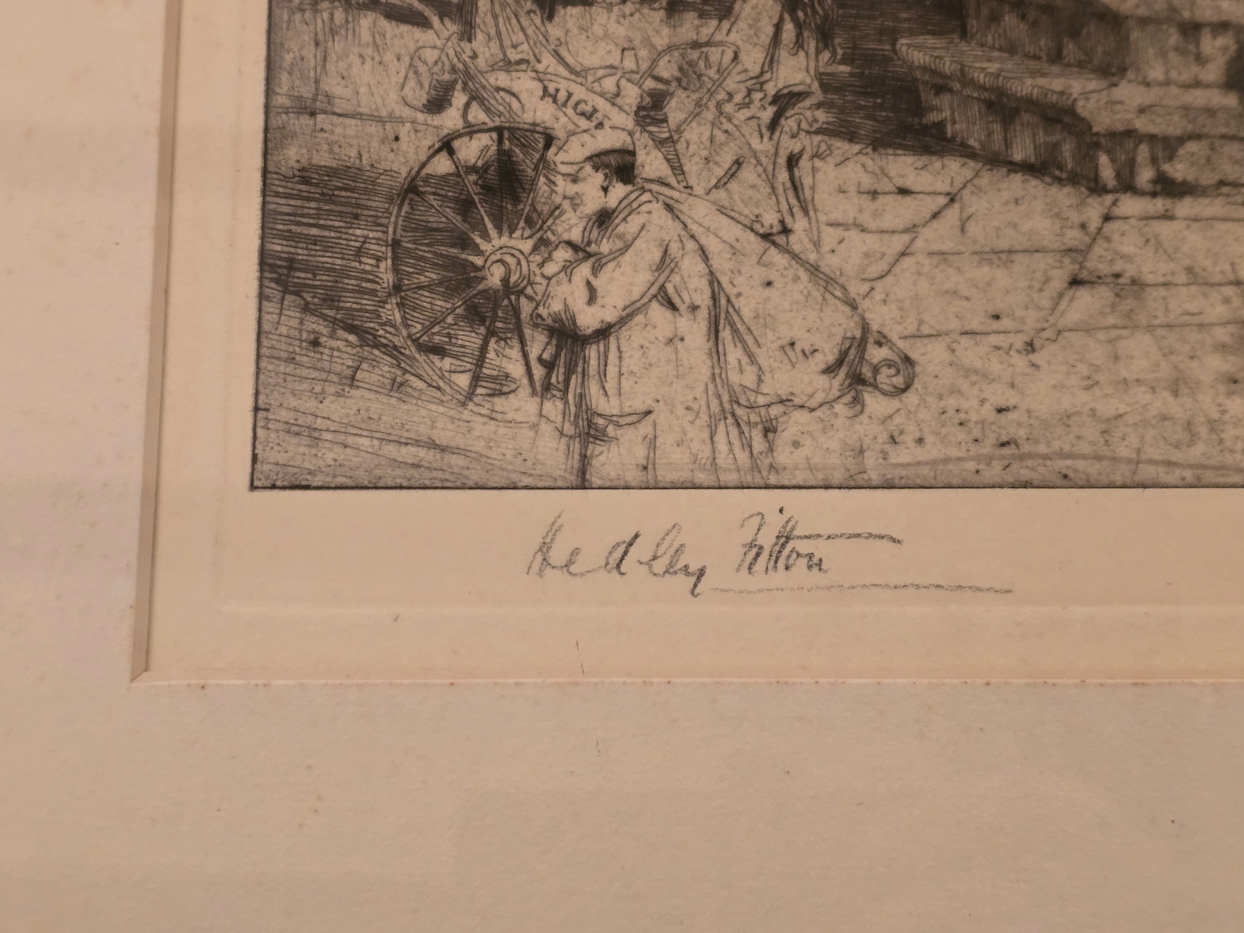 The composition shows Fitton’s characteristic mastery of architectural etching — deep shadow, dramatic perspective, and densely populated foreground scenes.