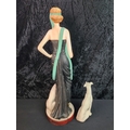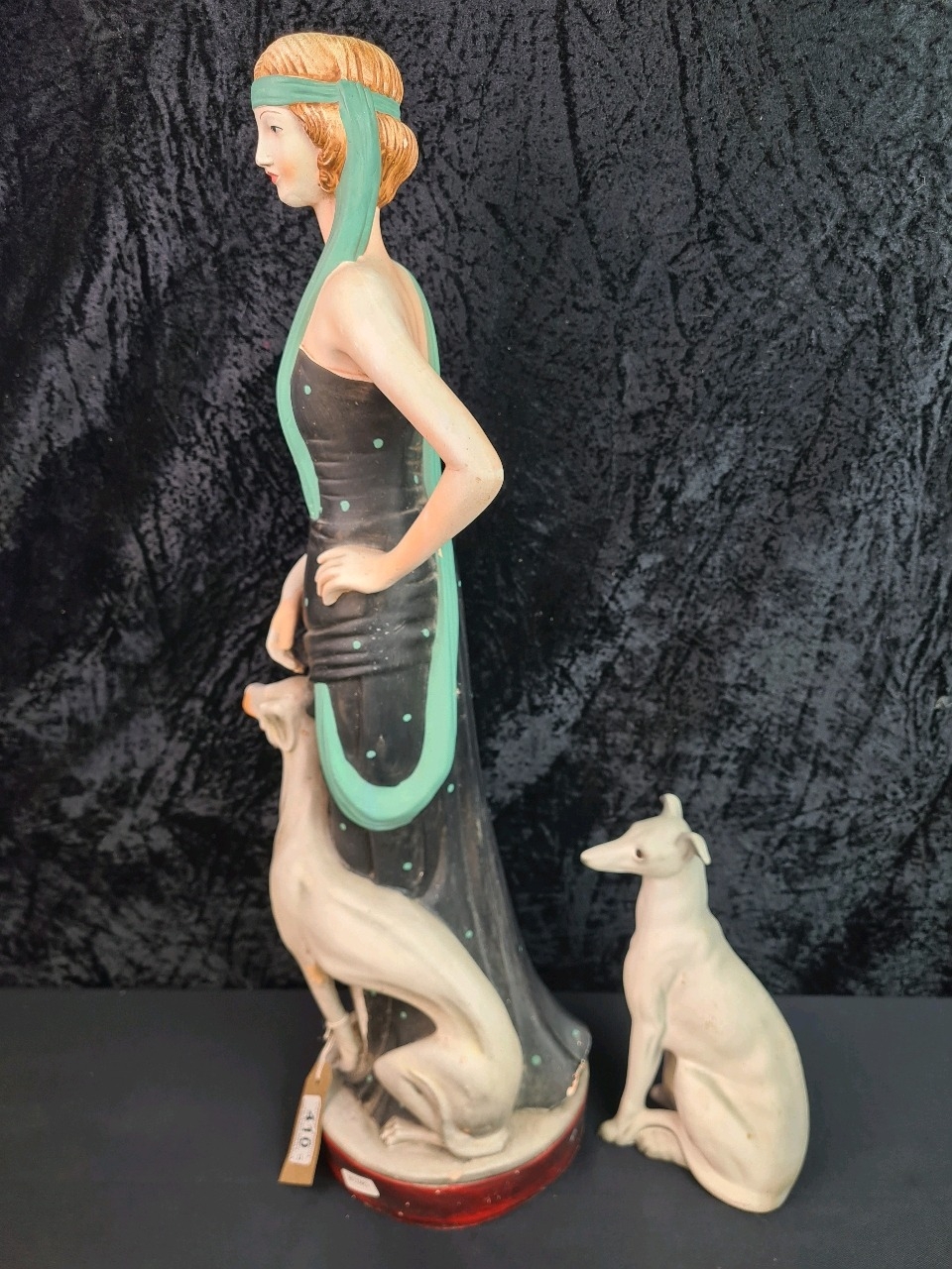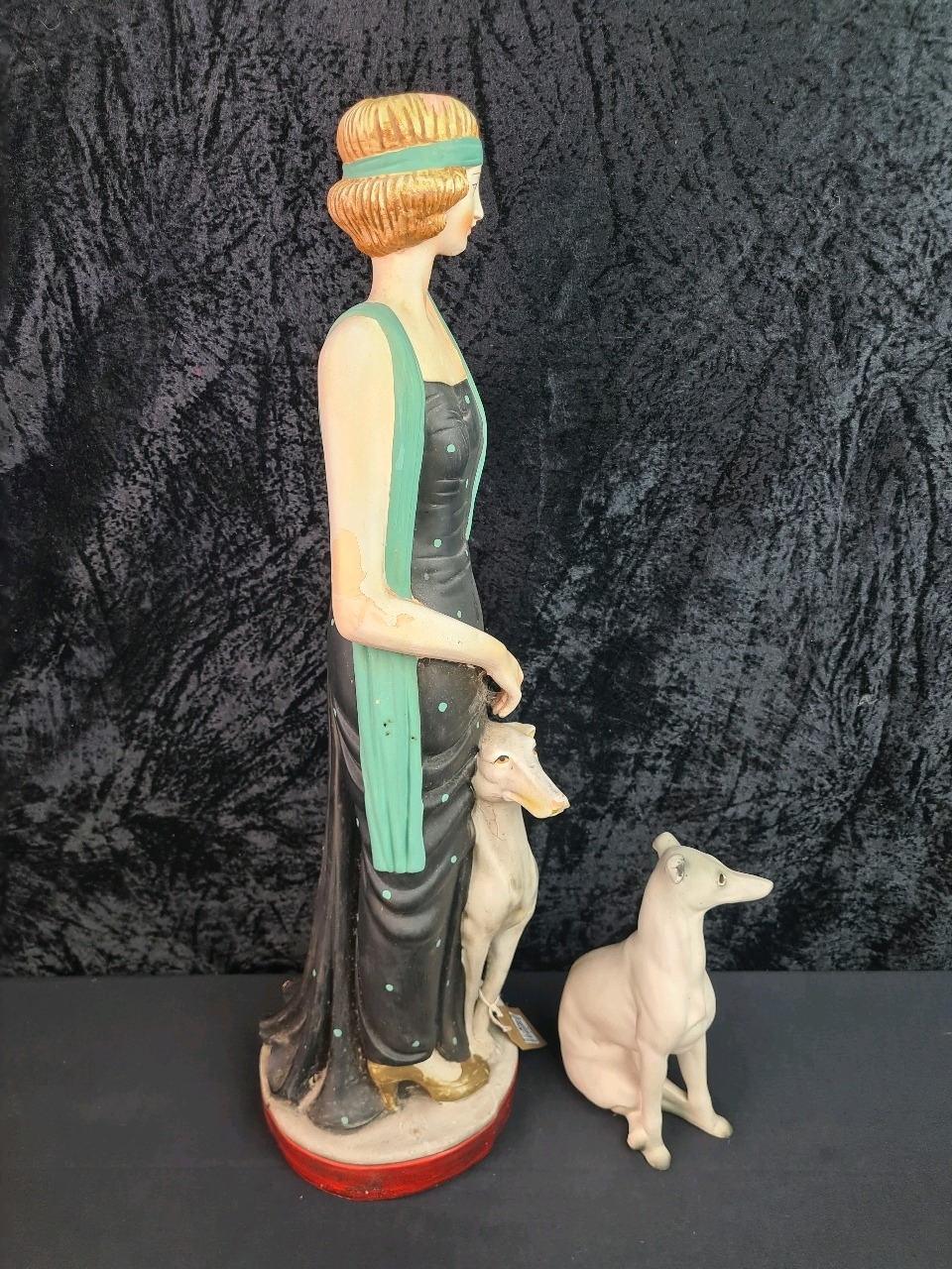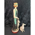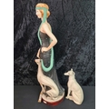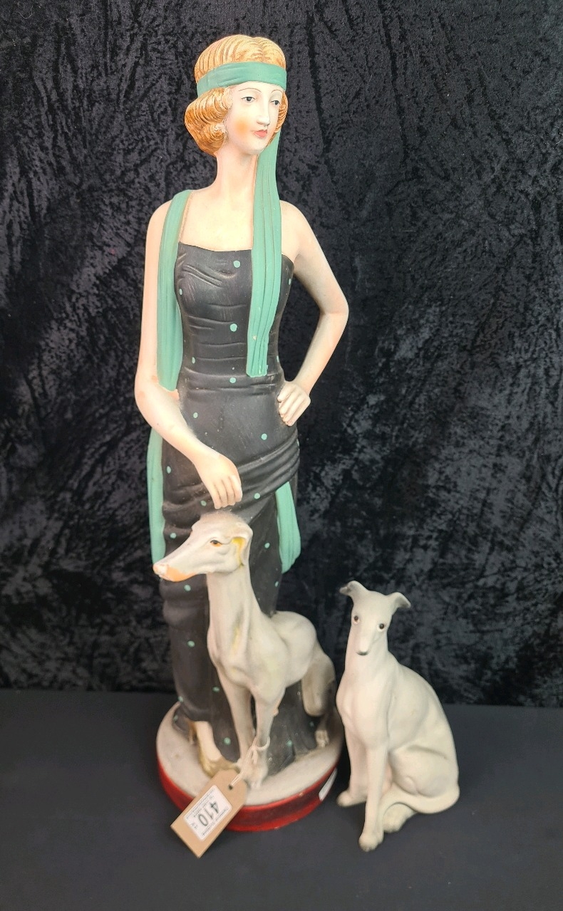 Art Deco figure of 1920s lady with greyhound painted terracotta H64cm and vintage ceramic greyhound figure.