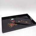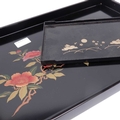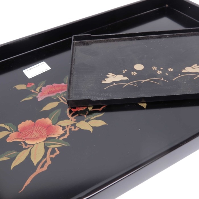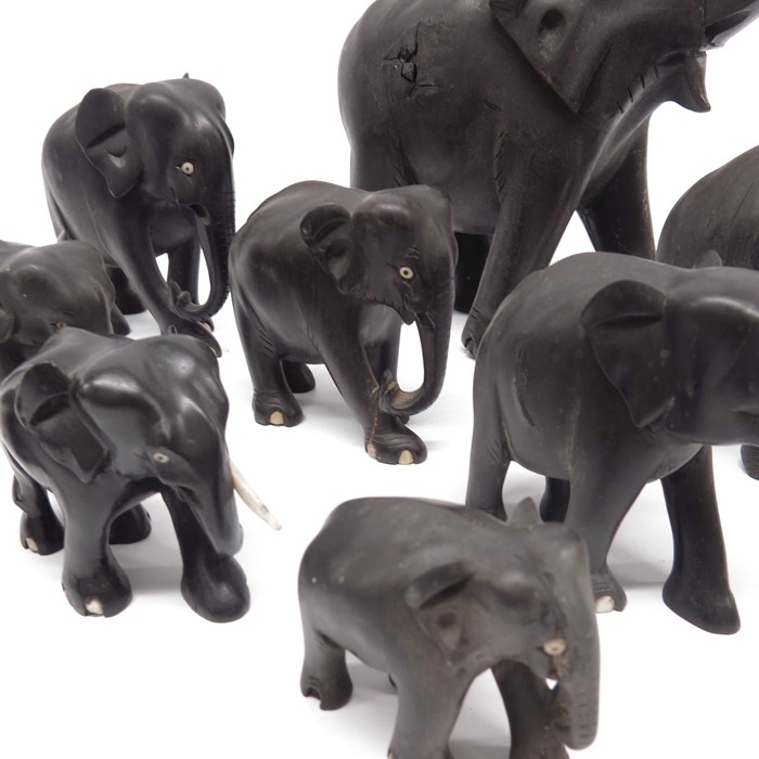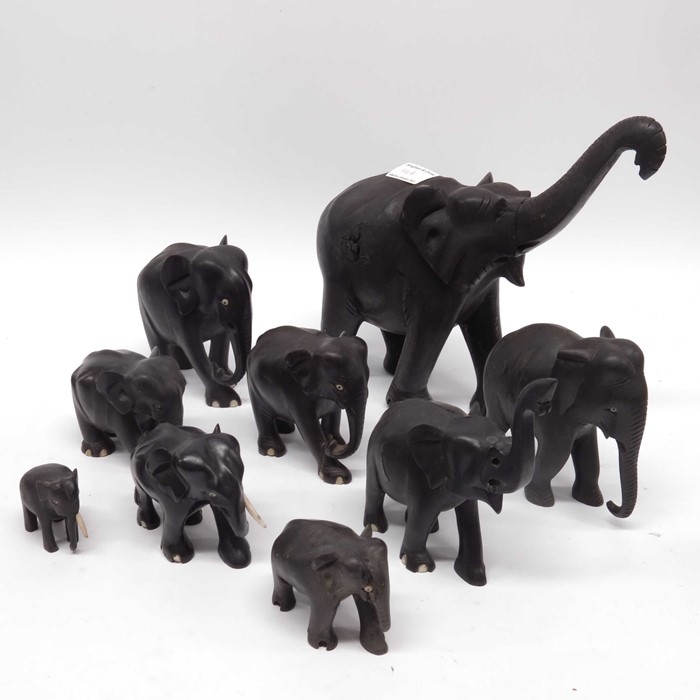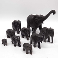 Ten ebonised carved elephants, together with two lacquered trays (12)