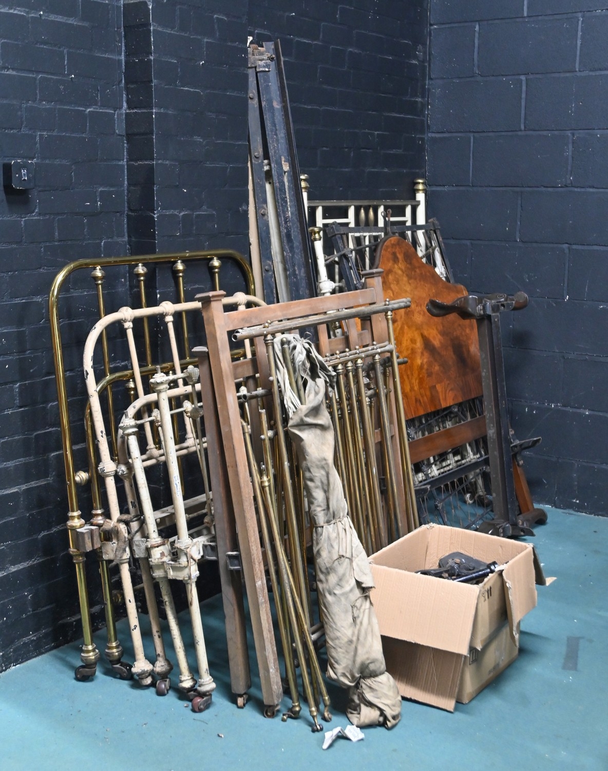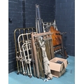 Miscellaneous brass, painted iron and wooden bed ends and a walnut headboard