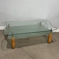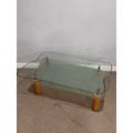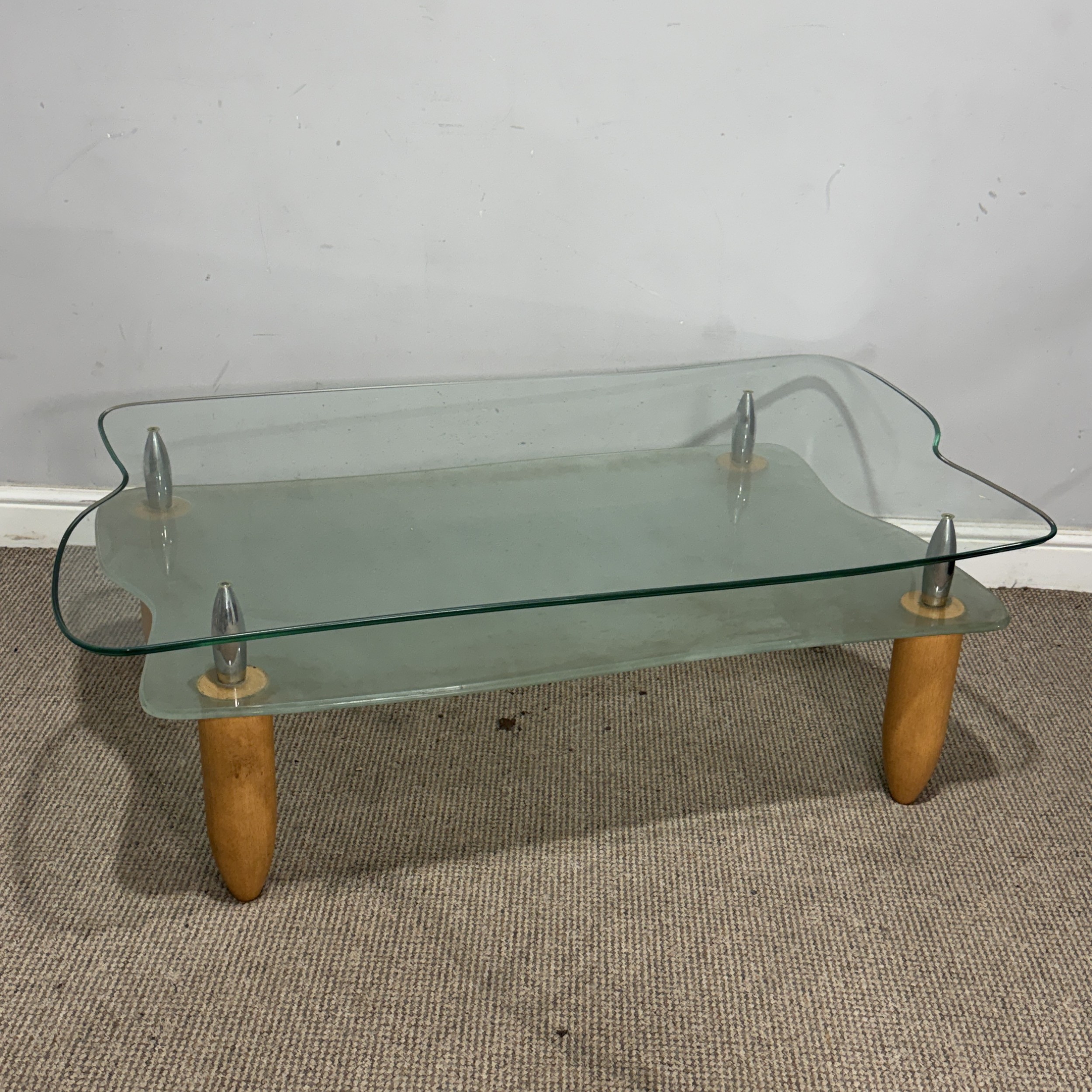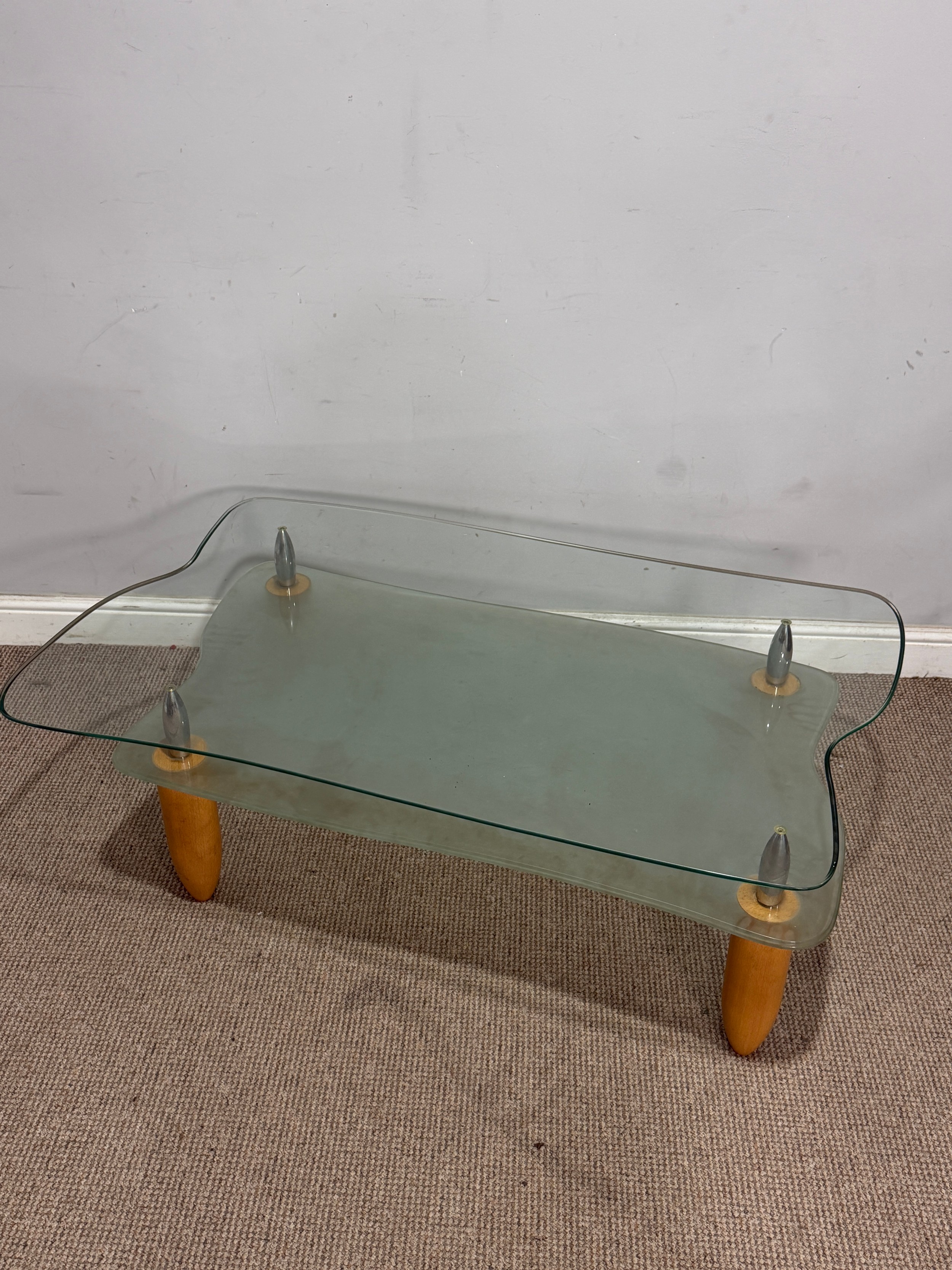 A contemporary retro-style glass coffee Table, with frosted under-tier, raised upon tapered supports, W 114 cm x H 40 cm x D 72 cm.