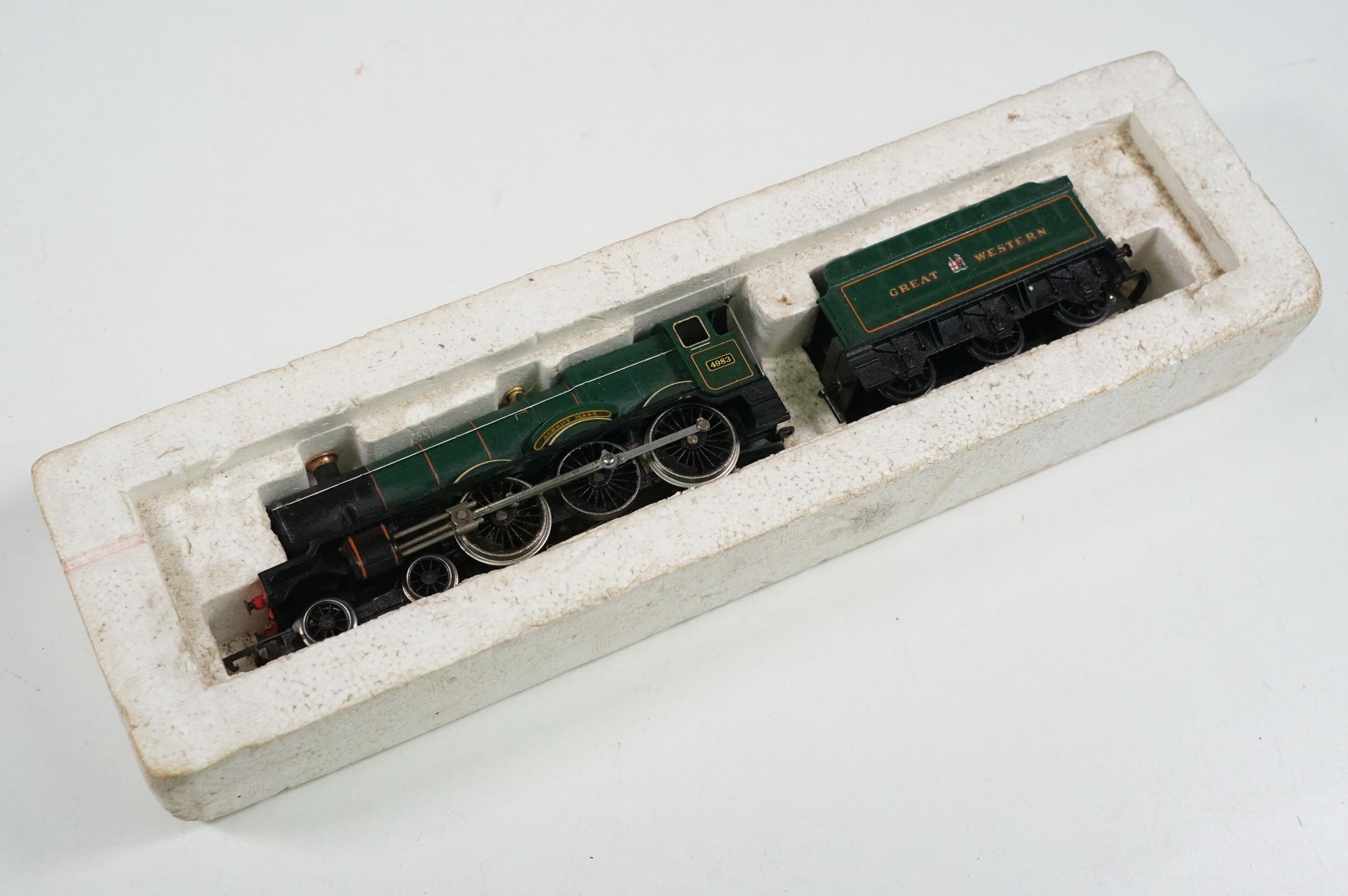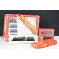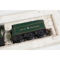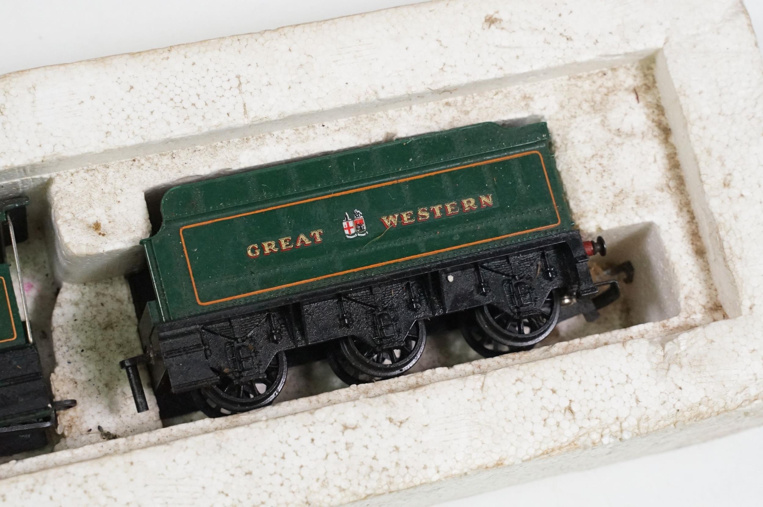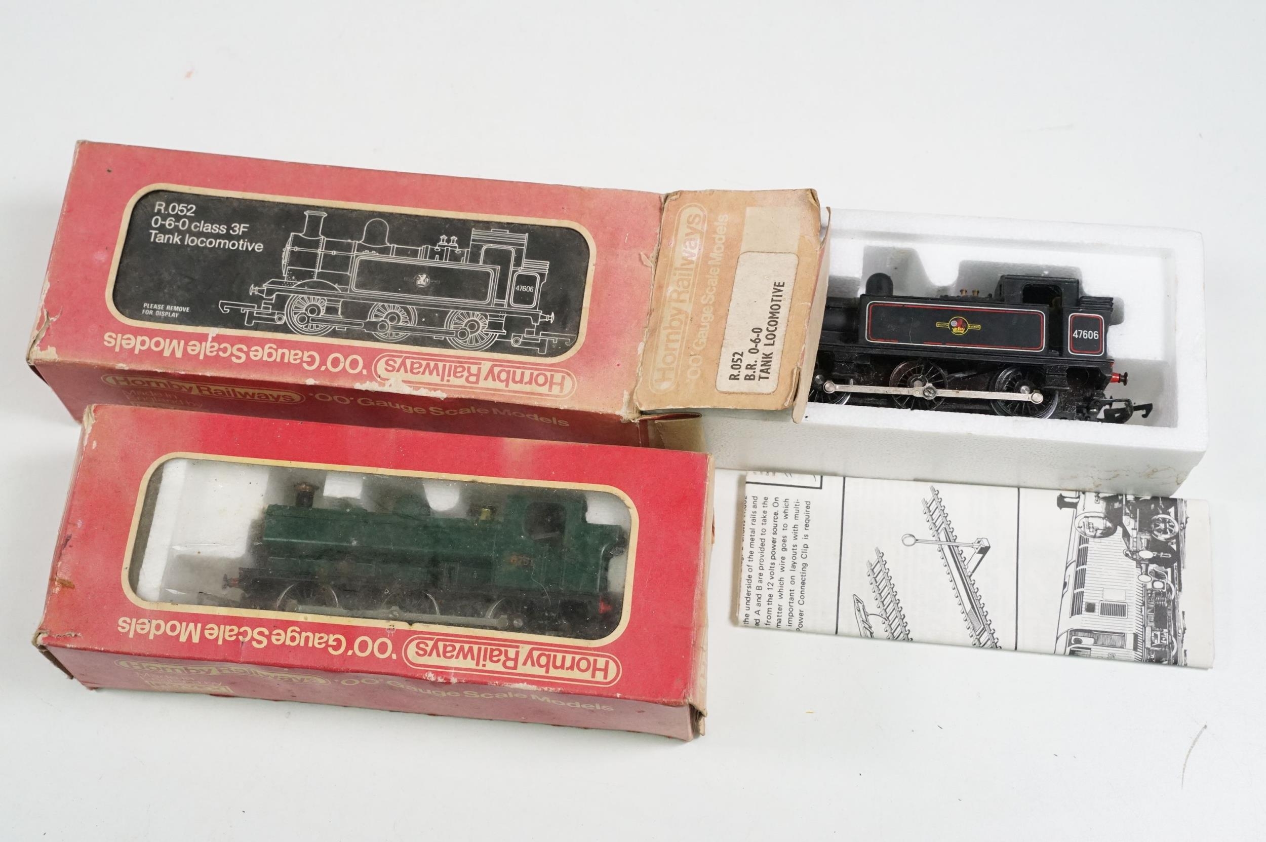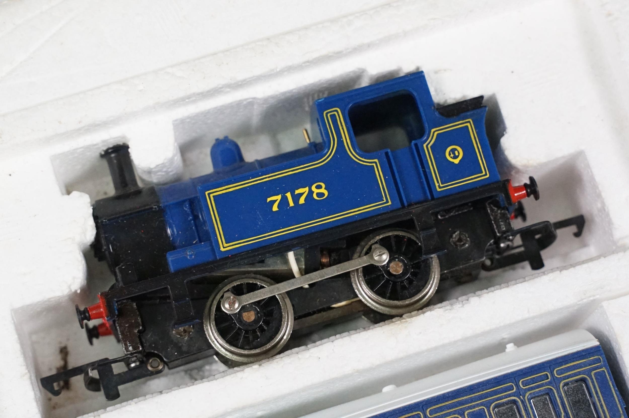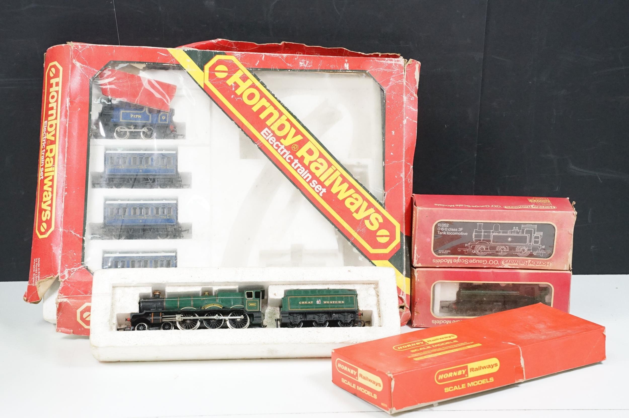 Three boxed Hornby OO gauge locomotives to include R758 BR Hymek Diesel Hydraulic Locomotive, R041 GWR 0-6-0 Pannier Tank Loco, and R052 BR 0-6-0 Tank Locomotive plus a boxed Hornby R174 Rural Rambler train set (with only locomotive & 3 x coaches) and a Hornby R759 Albert Hall locomotive in poly box tray, tatty boxes (5 items)