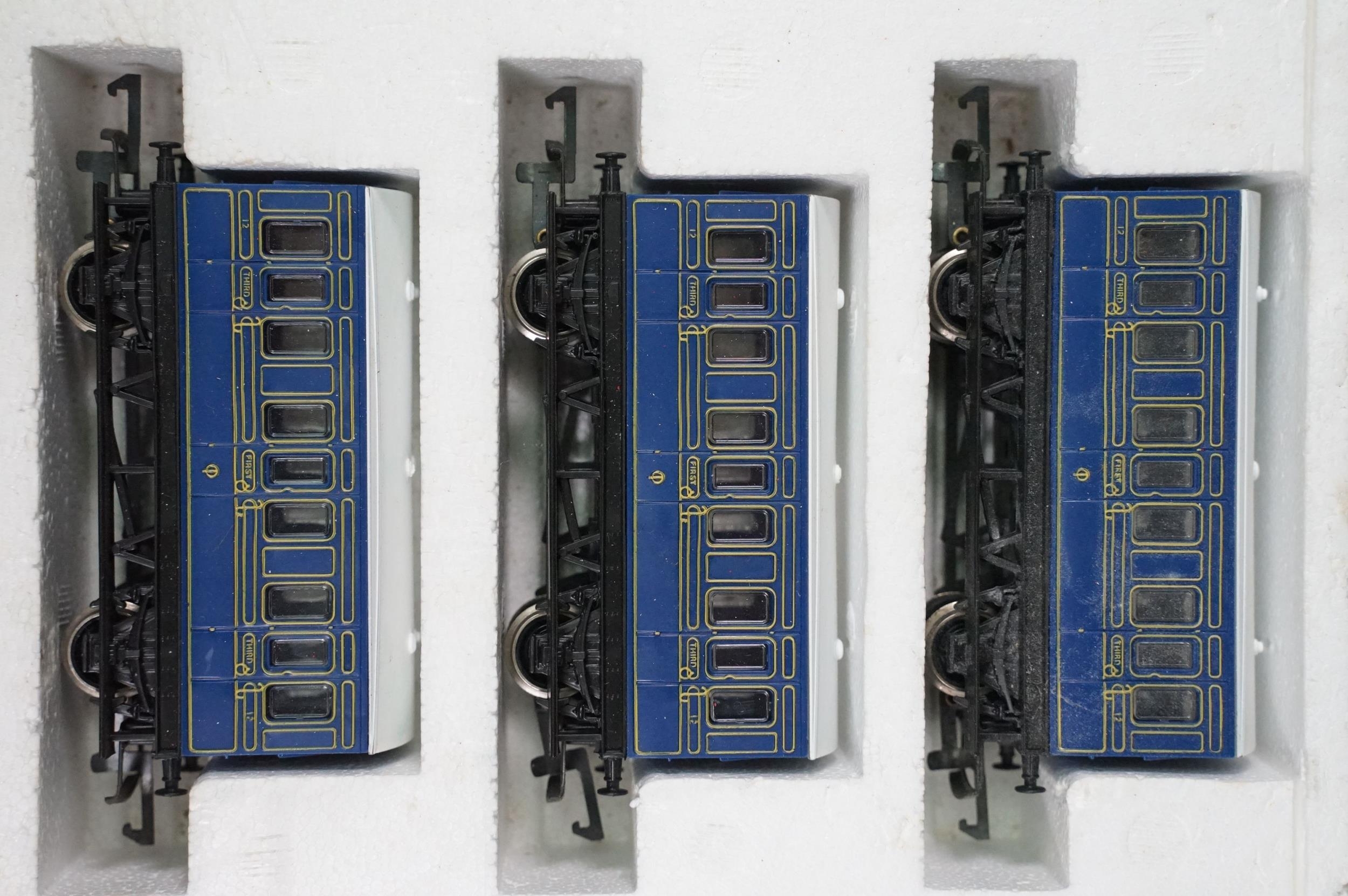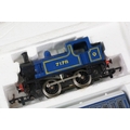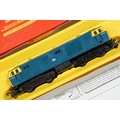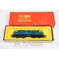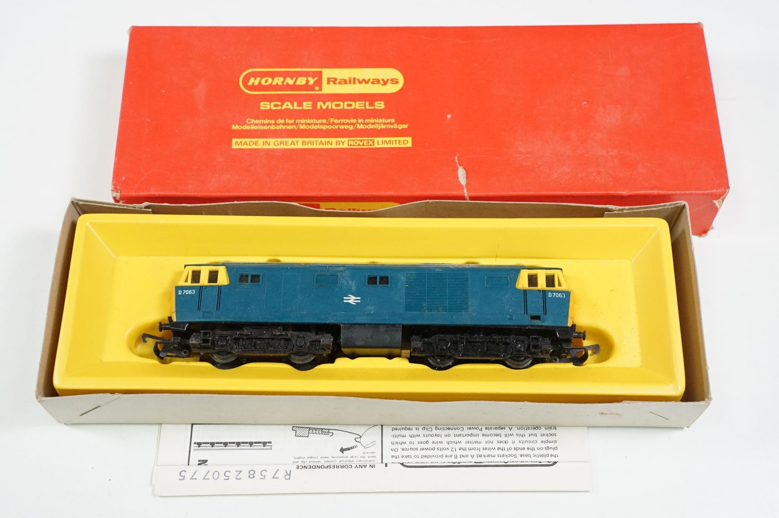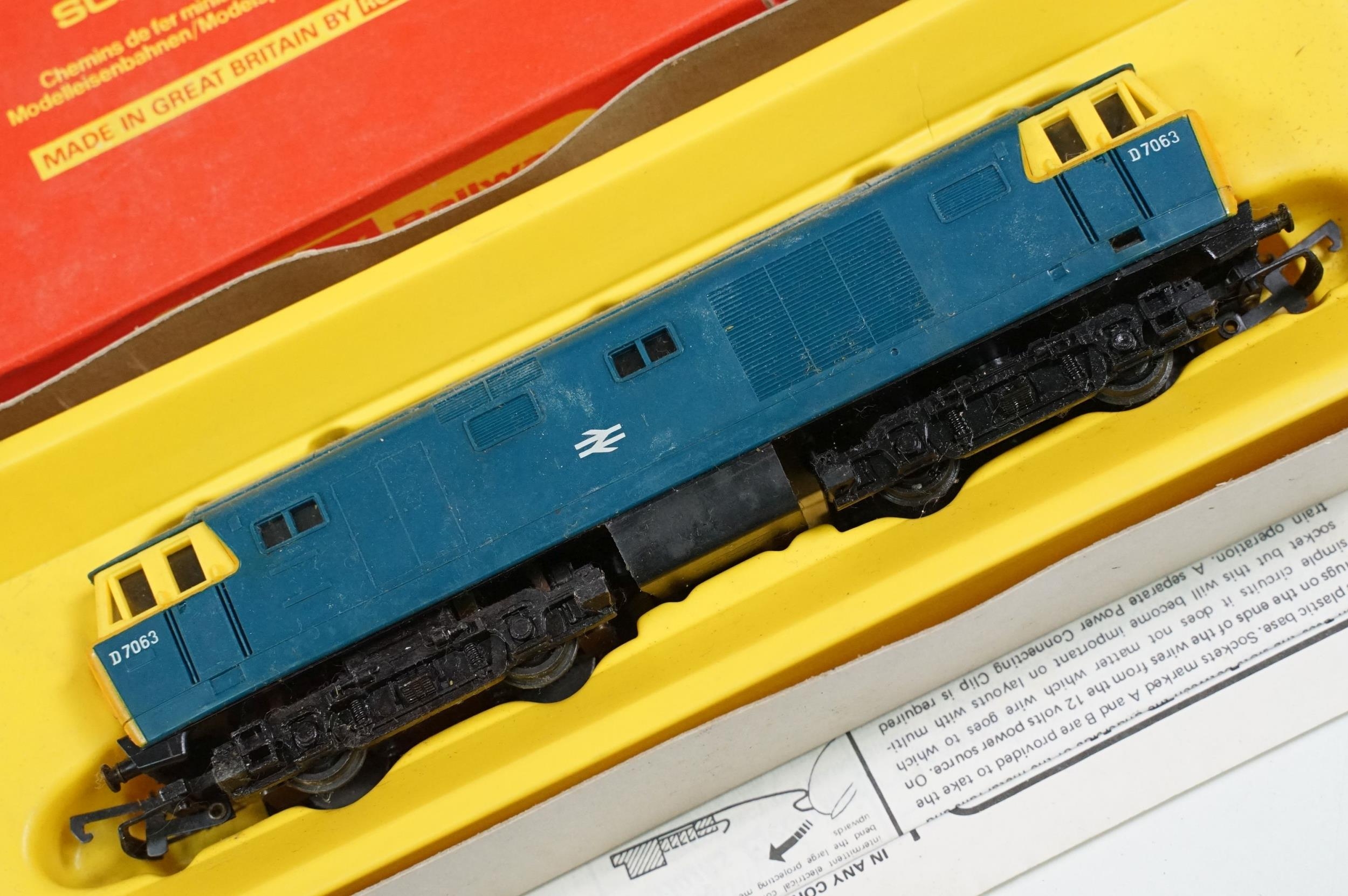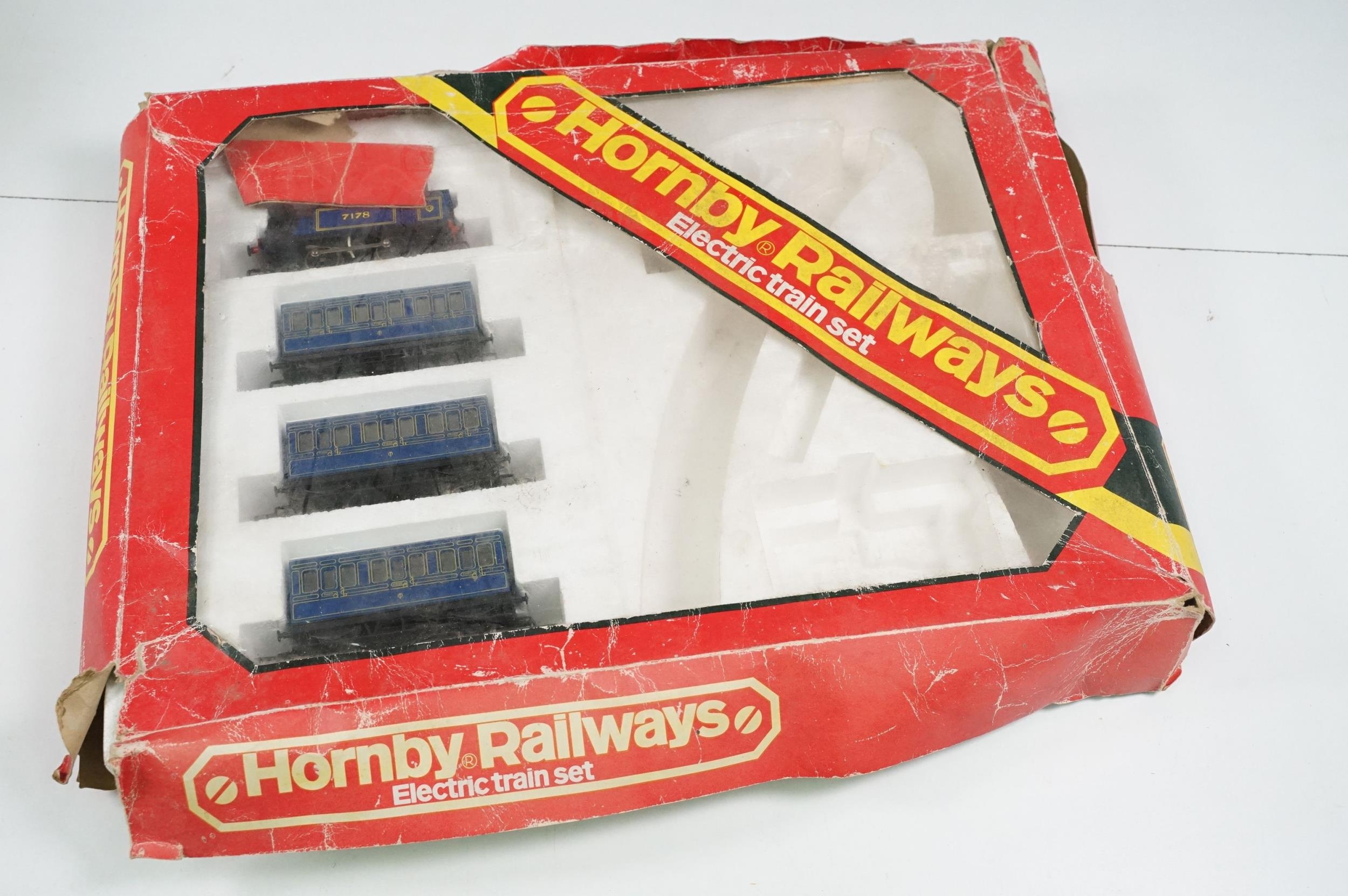 Three boxed Hornby OO gauge locomotives to include R758 BR Hymek Diesel Hydraulic Locomotive, R041 GWR 0-6-0 Pannier Tank Loco, and R052 BR 0-6-0 Tank Locomotive plus a boxed Hornby R174 Rural Rambler train set (with only locomotive & 3 x coaches) and a Hornby R759 Albert Hall locomotive in poly box tray, tatty boxes (5 items)