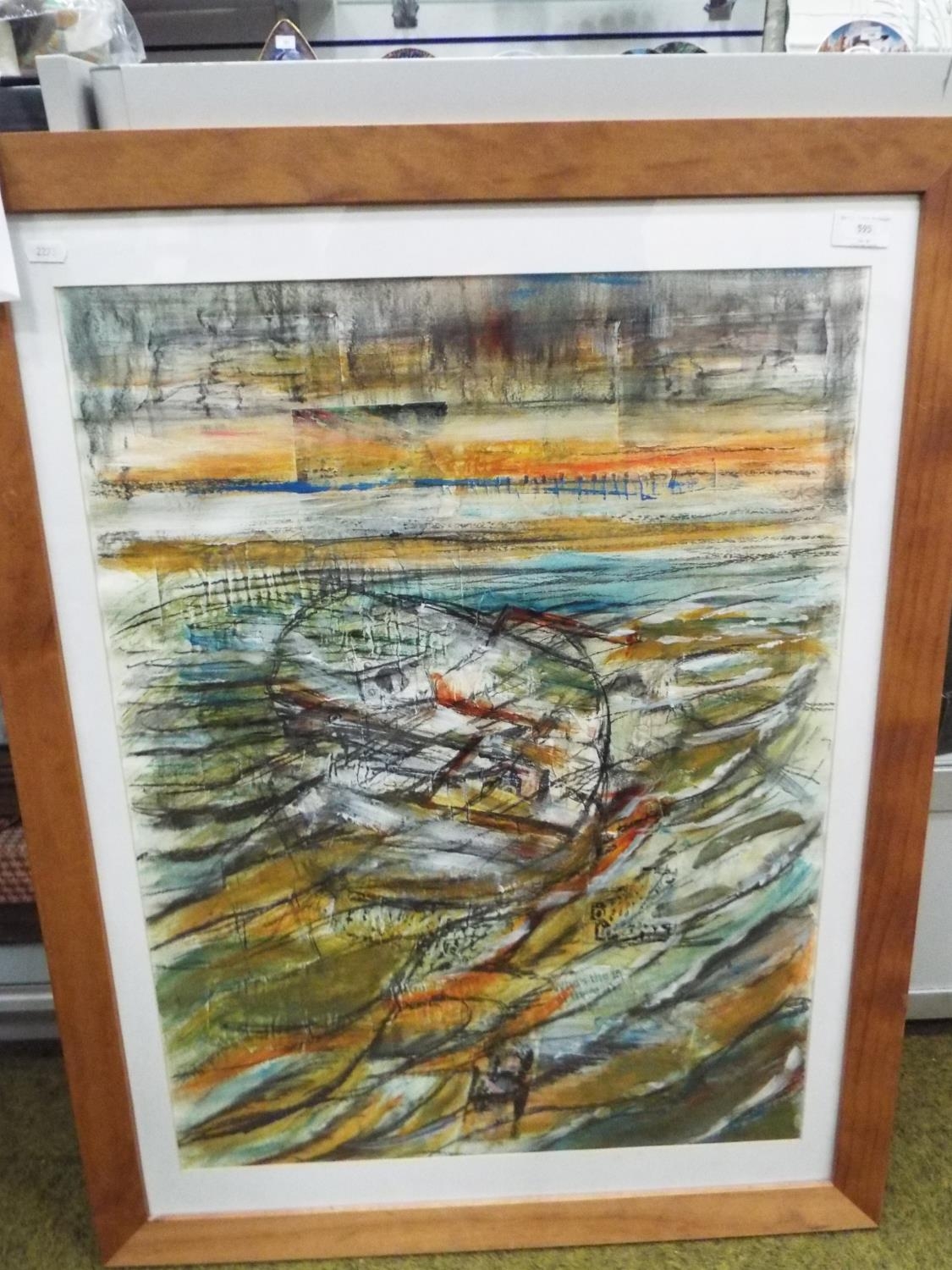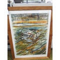Beautiful framed and mounted modern art pastels/collage under glass by Gill Hickton. 'Fishes' 34 x 26 inches.