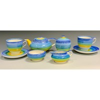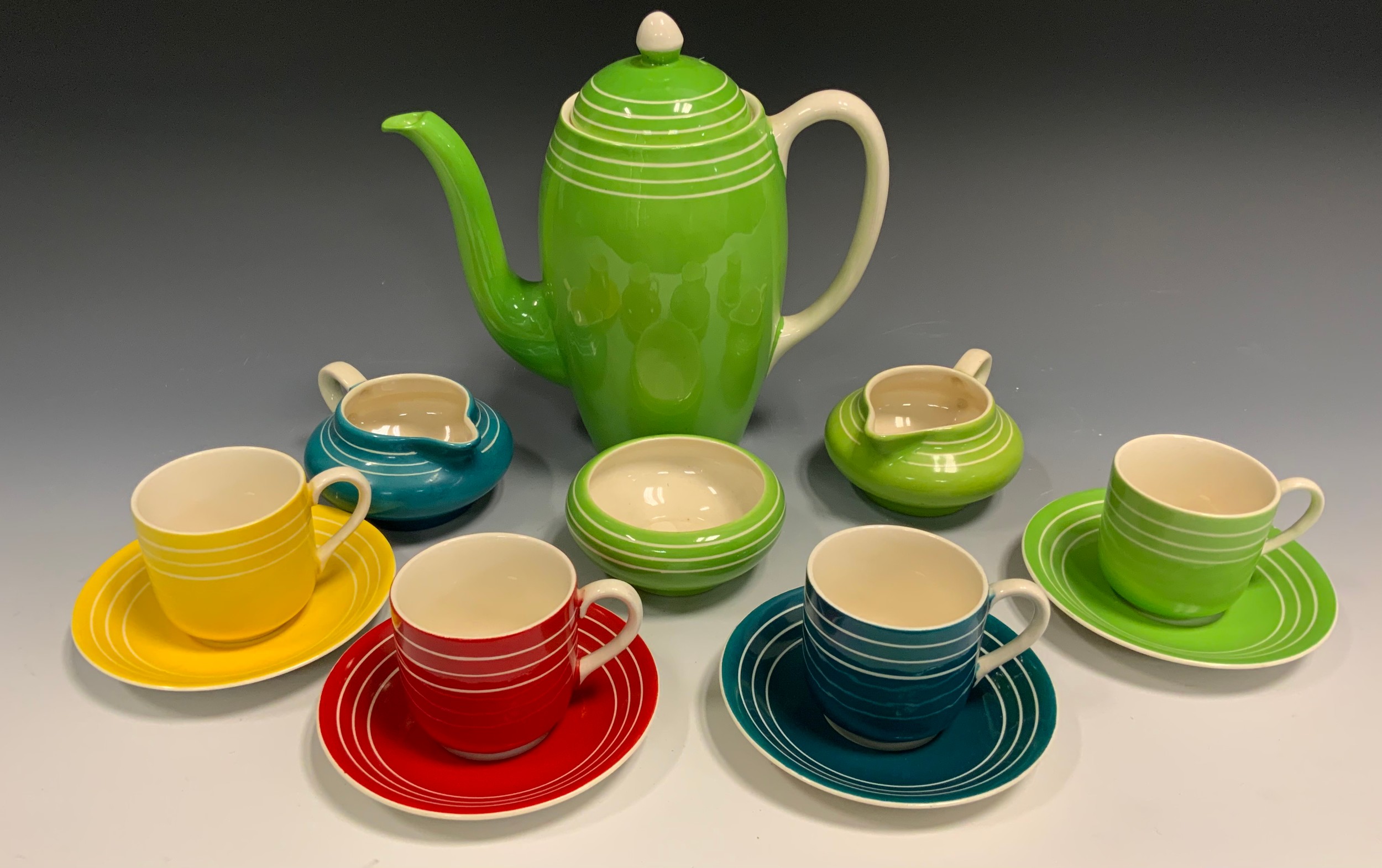 A Susie Cooper coffee service, for four, each with a different vibrant colour, banded in white, printed ship mark; a similar milk jug