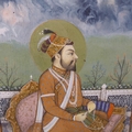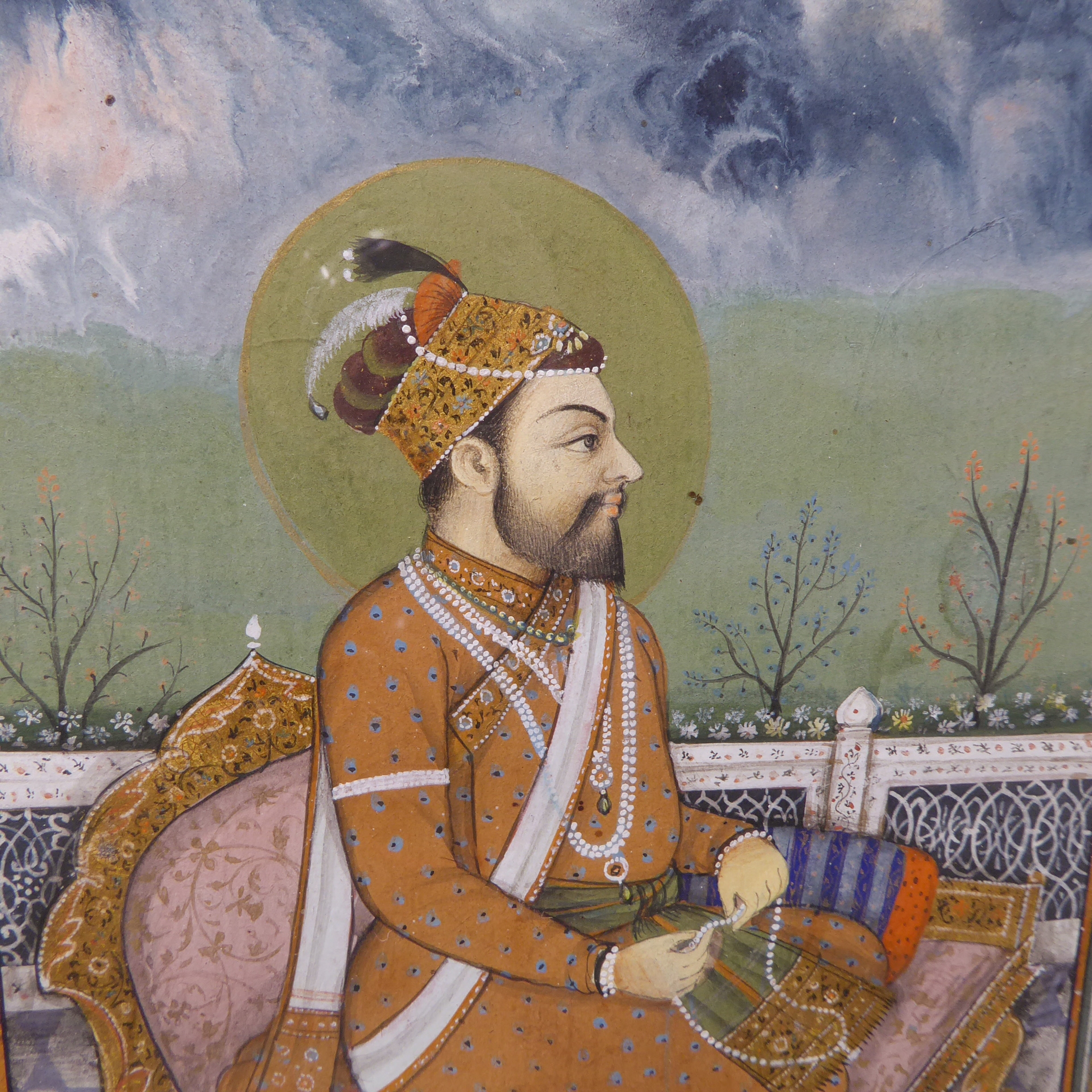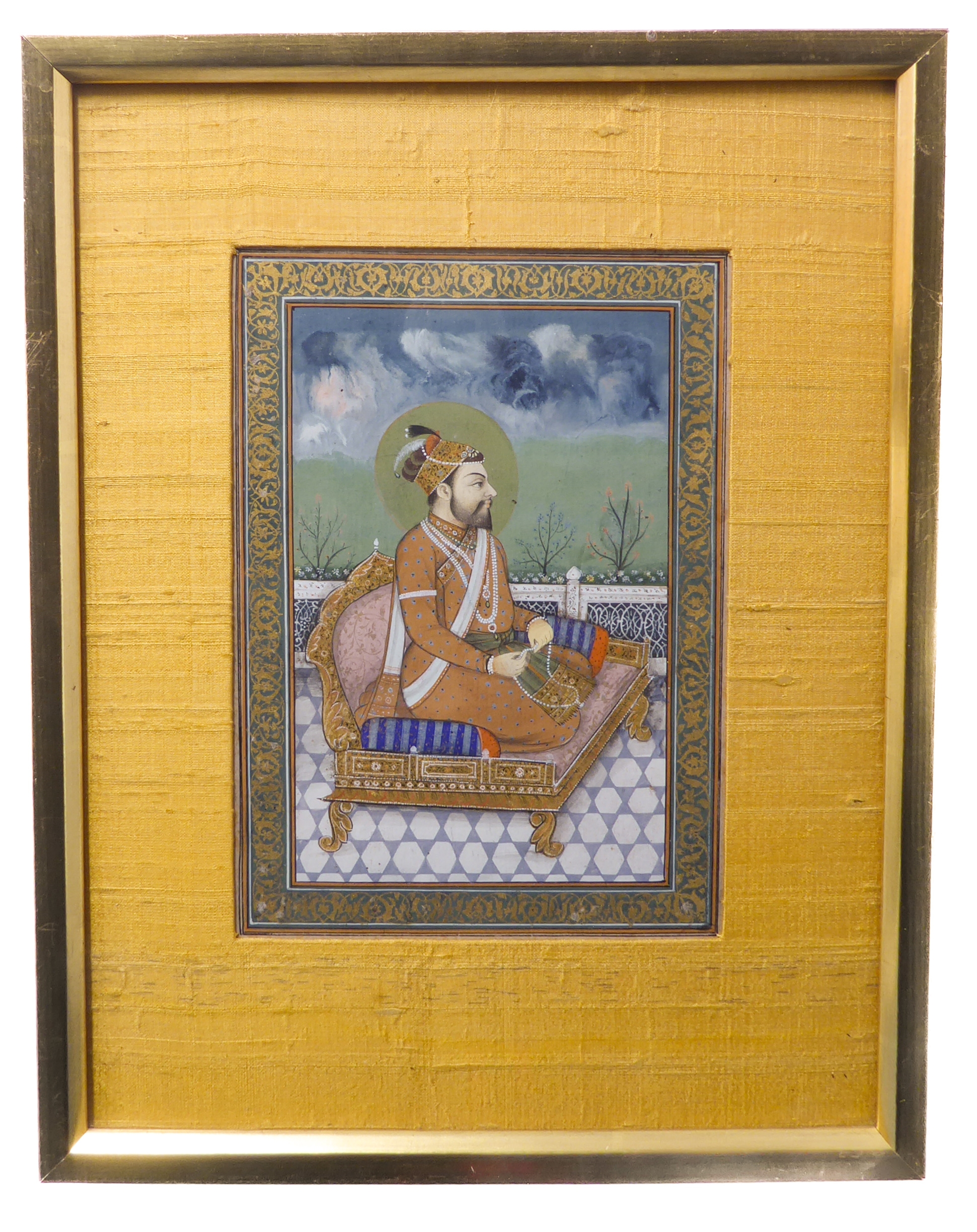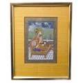 A late 19th / early 20th century Indian School gouache on paper study, a high-ranking bearded male upon a gilt throne; later glazed gilt frame, Bertram Atkins, 8 Motcomb Street, S.W.1. paper label verso (20 cm x 14 cm)