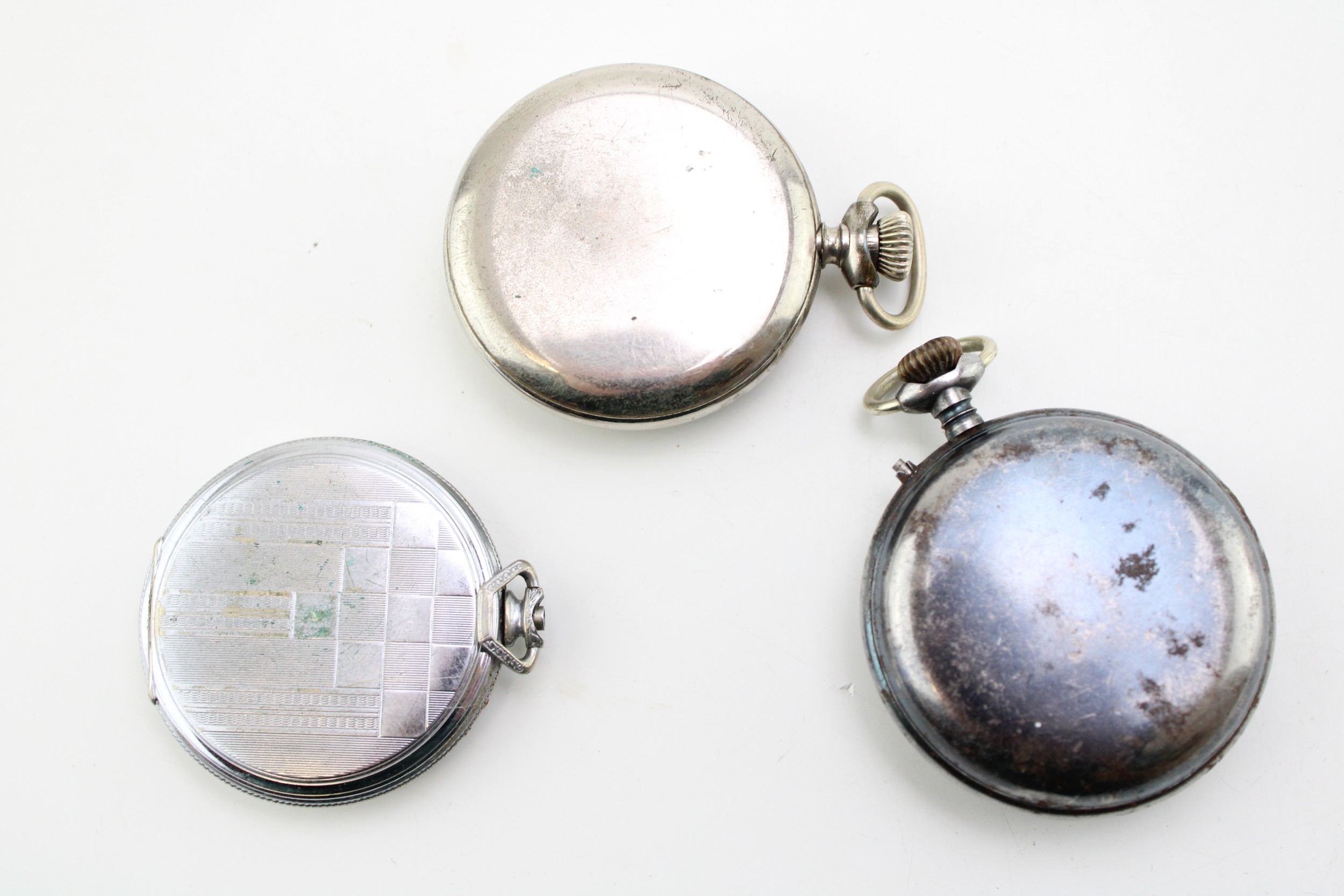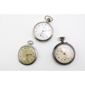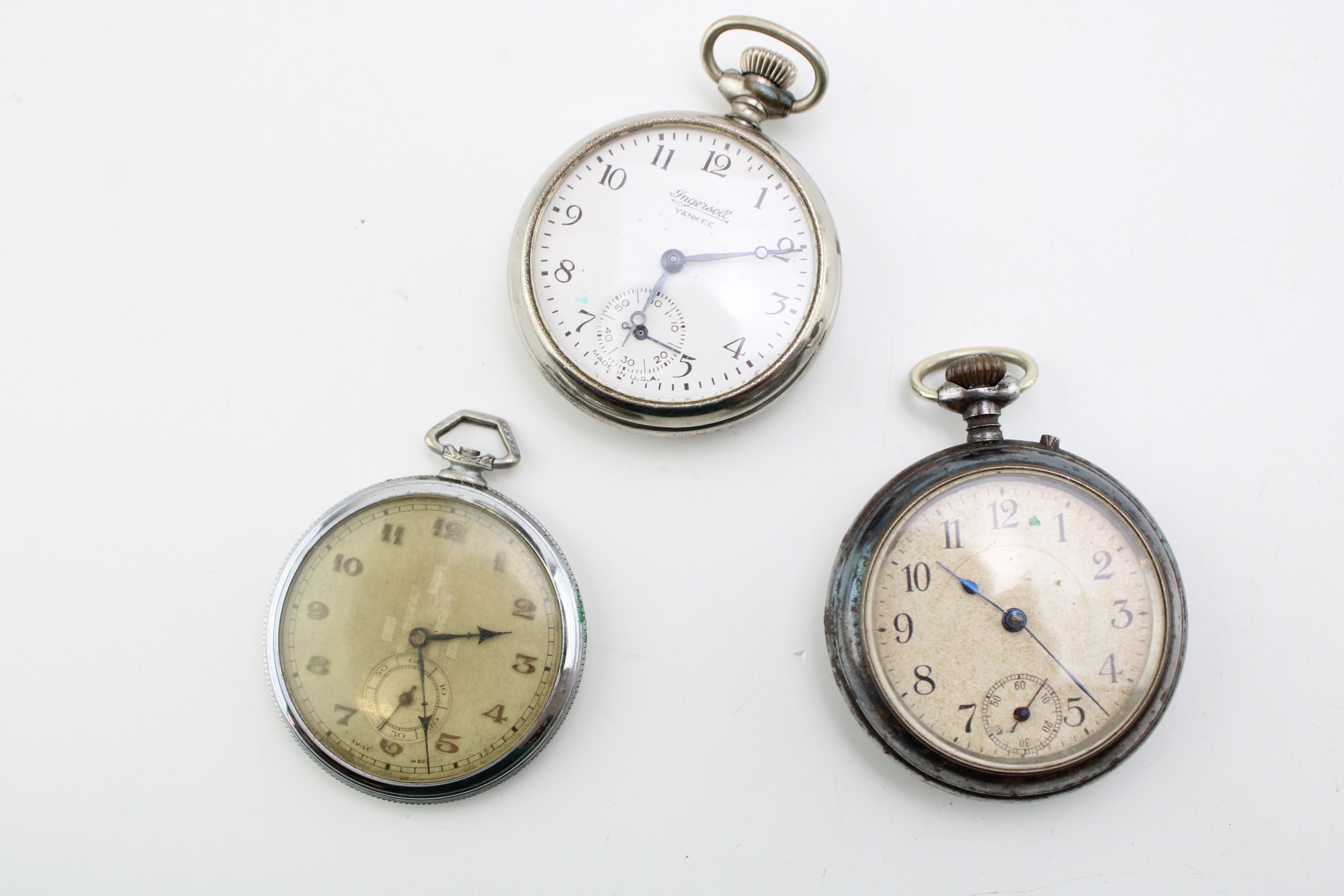 A group of three mechanical pocket watches including Ingersol, and an unsigned watch with blued steel hands and case.