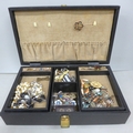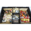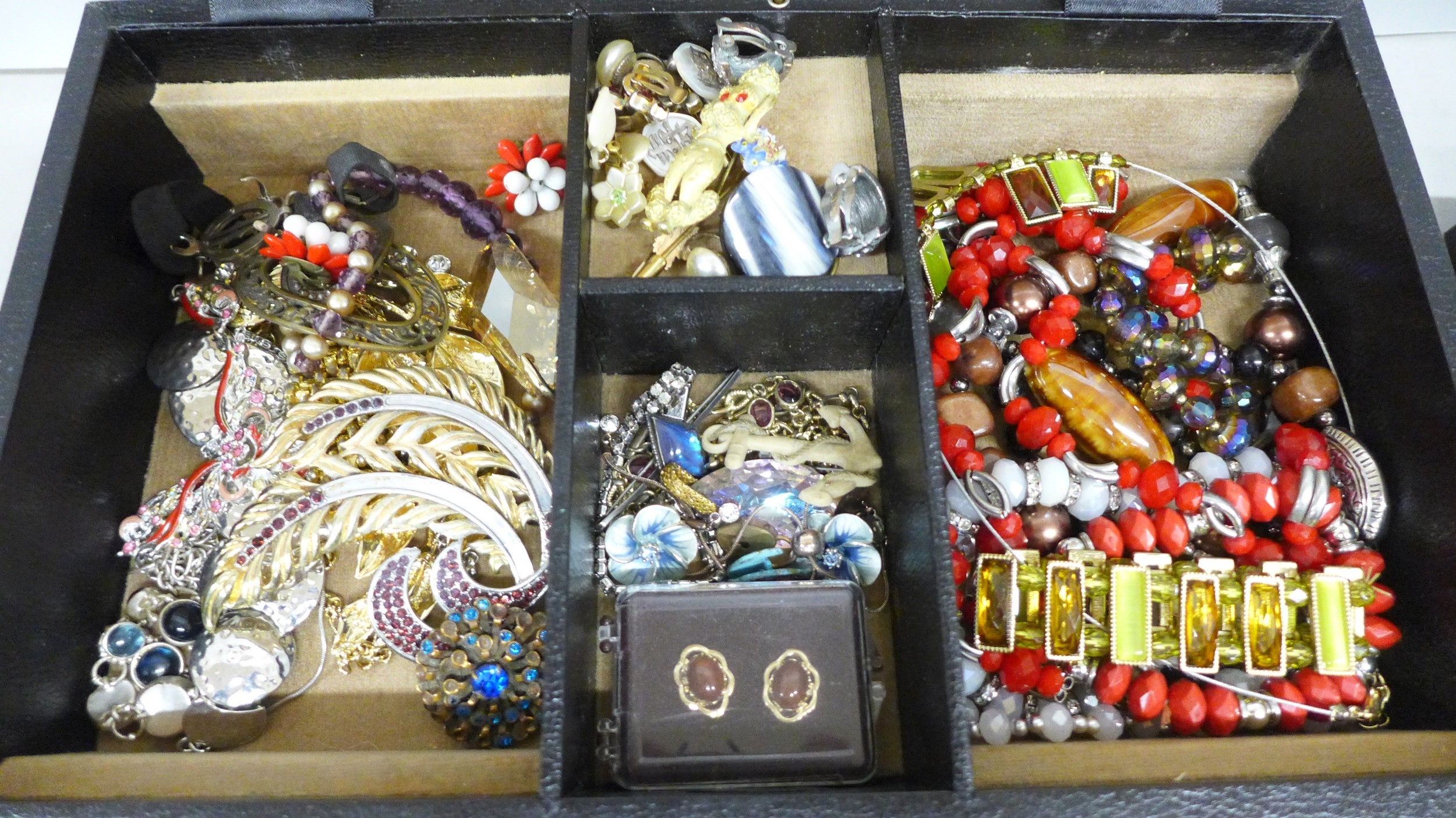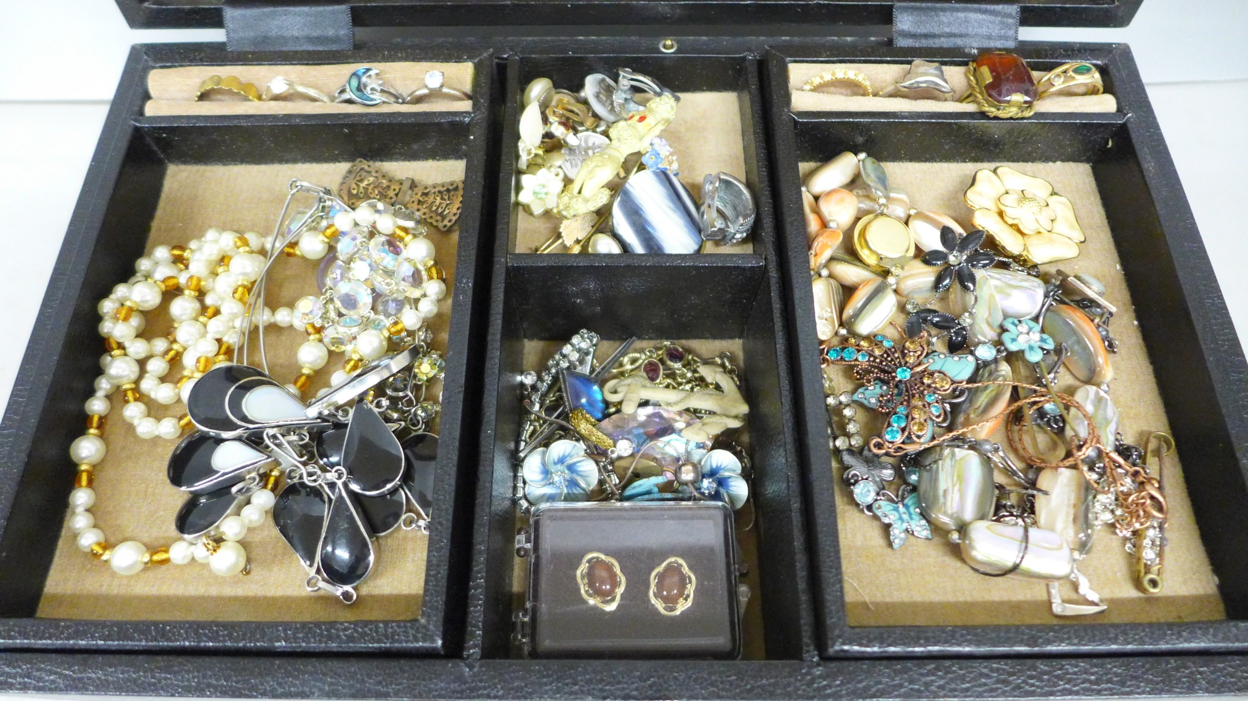 A box of costume jewellery including rings, earrings, necklaces, etc.