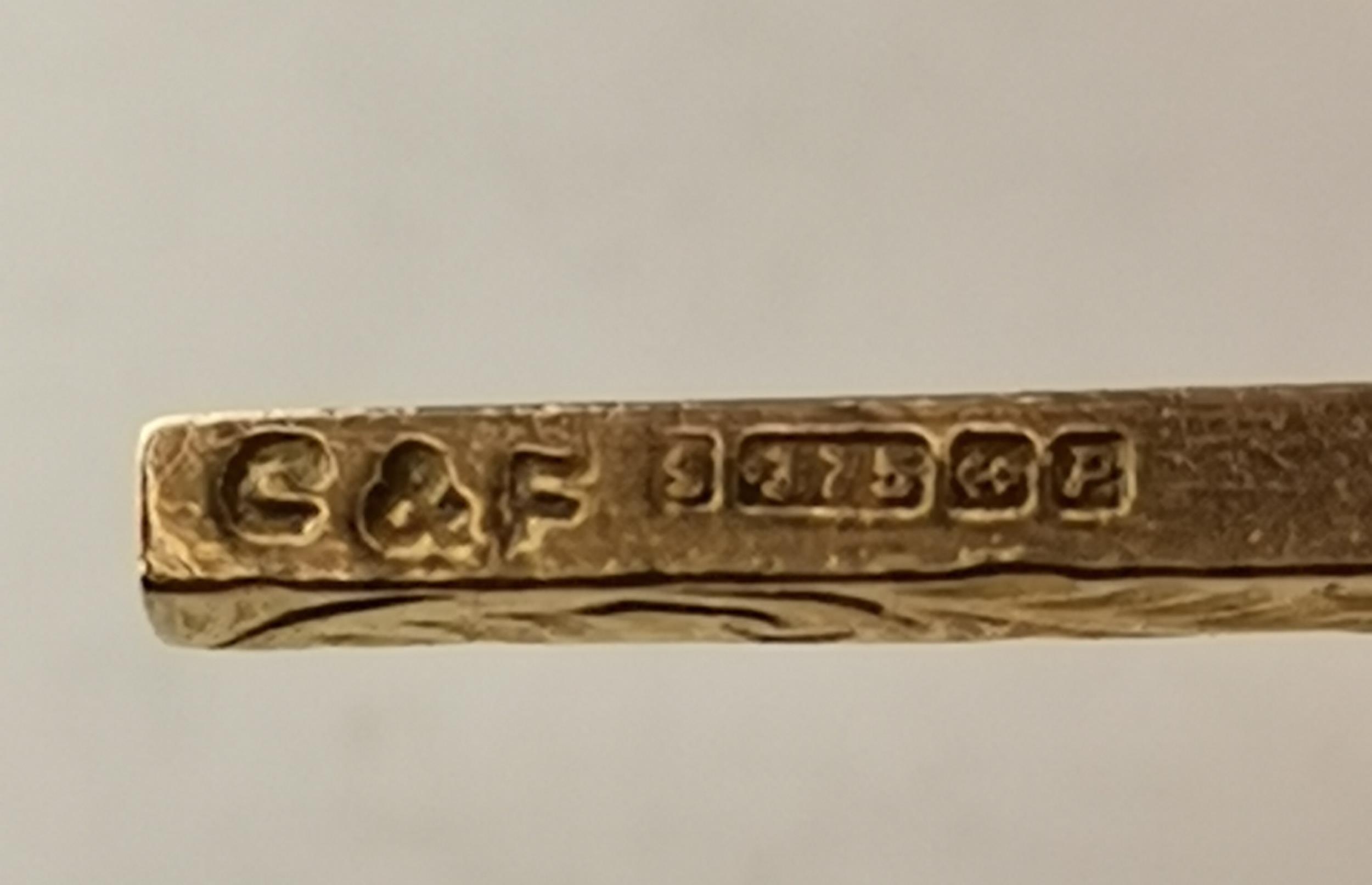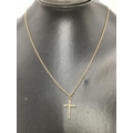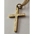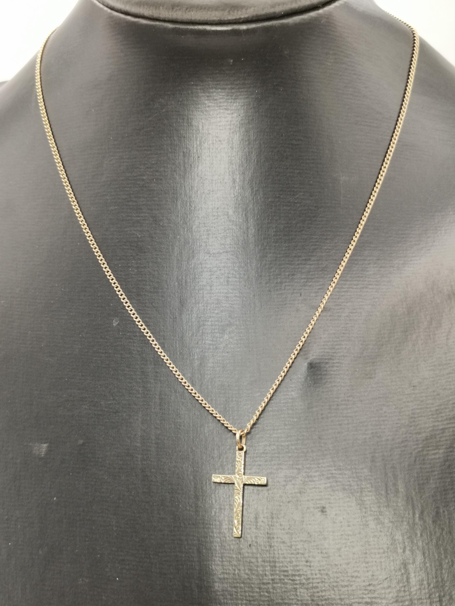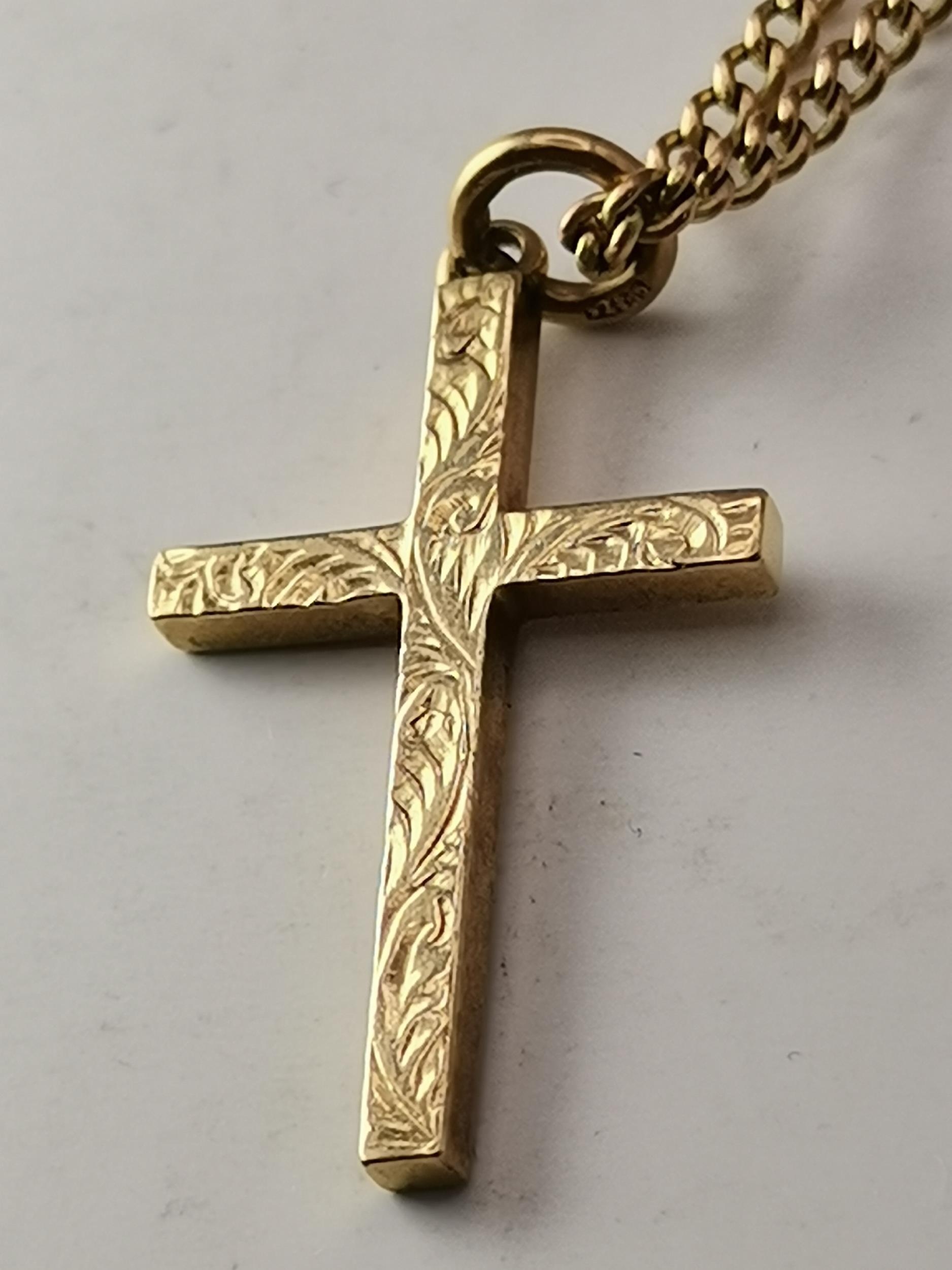 A 9 carat gold crucifix pendant on chain, the cross with foliate engraving to front, inscription date 1.12.65 to back, hallmarked 375, to a fine curb chain, stamped 9CT to clasp. Chain 47cm long, crucifix 23mm (excl. bail and loop) by 15mm, 5.6g gross