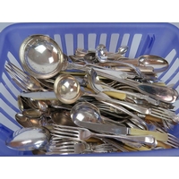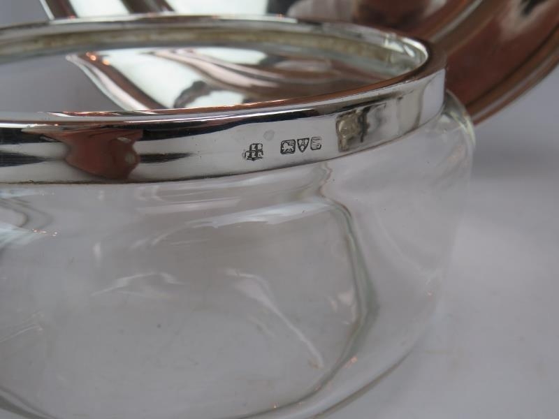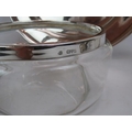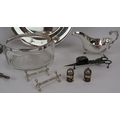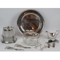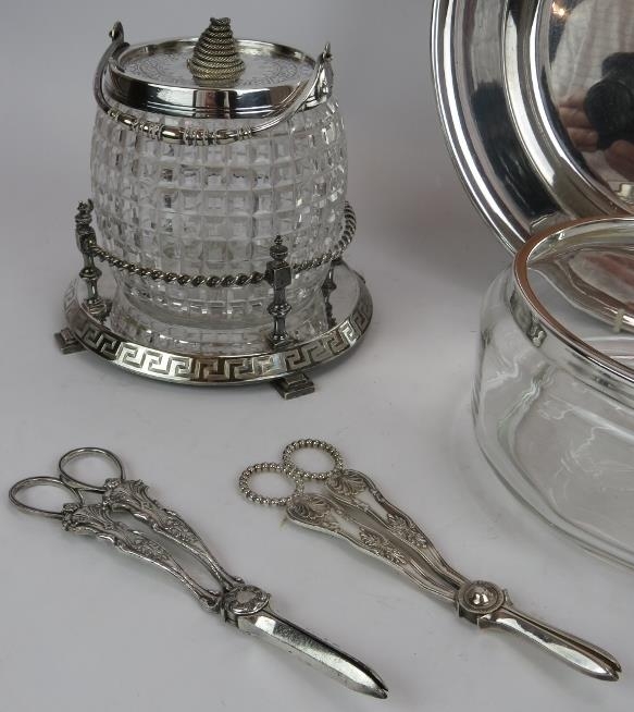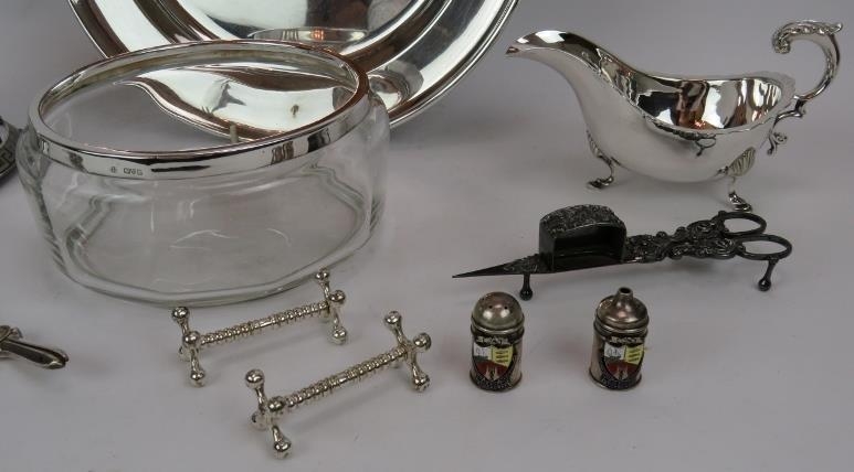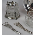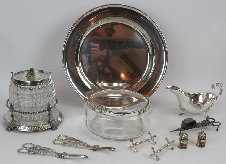 A silver plate mounted glass beehive biscuit barrel on stand, a Walker & Hall plated charger, a silver mounted glass bowl with Chester hallmark, a plated sauce boat, grape shears, candle snuffer, knife rests and EPNS condiments. (12).