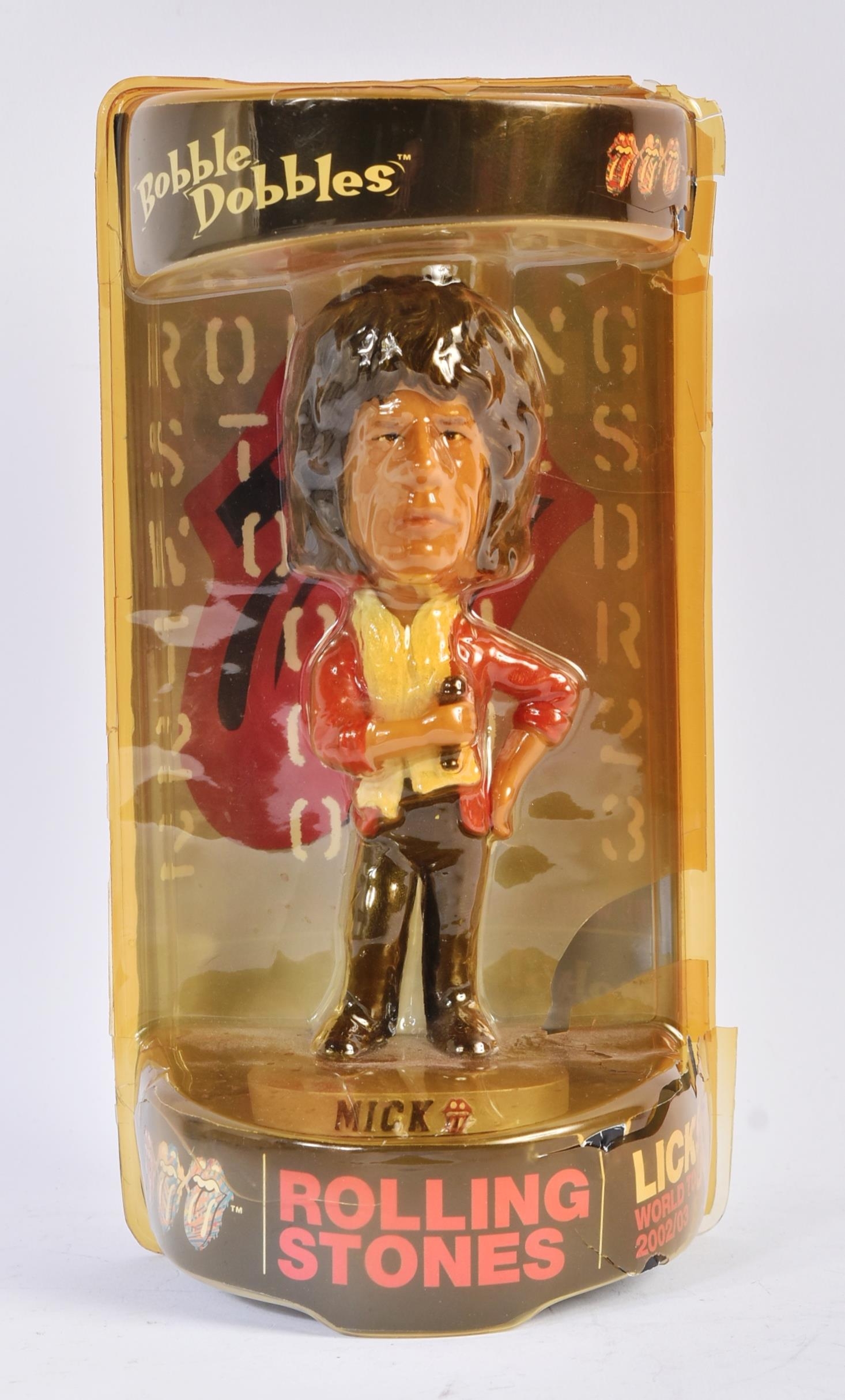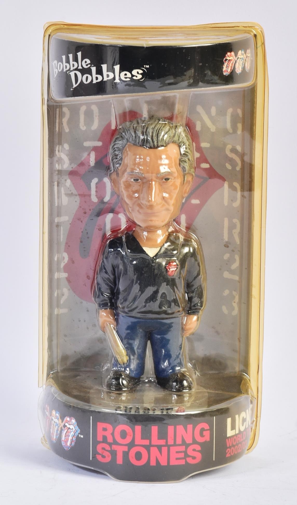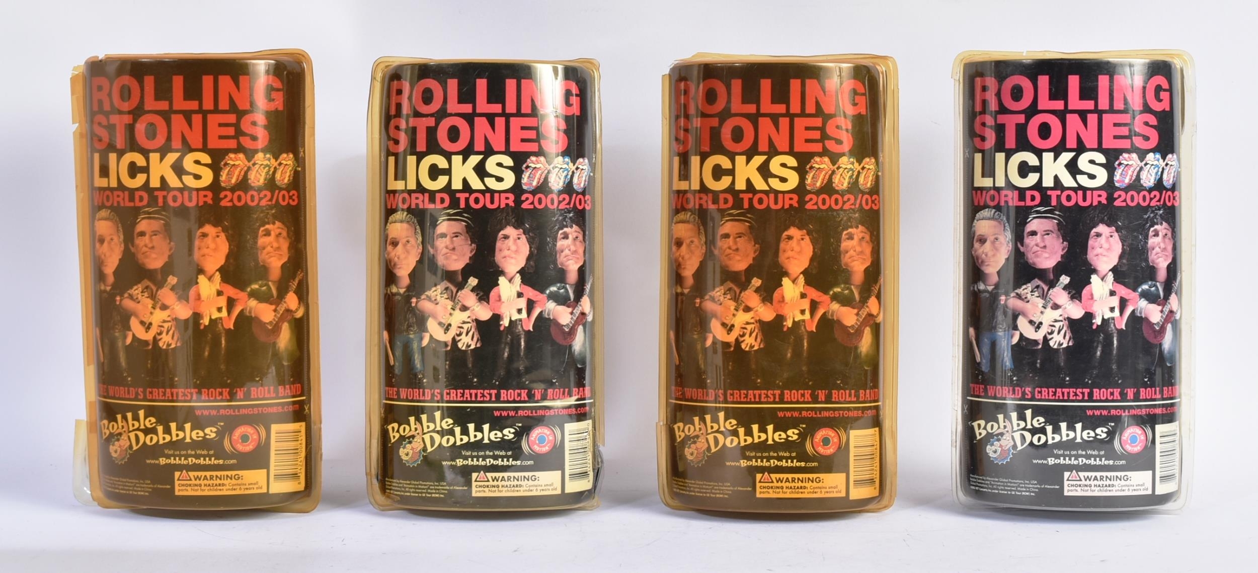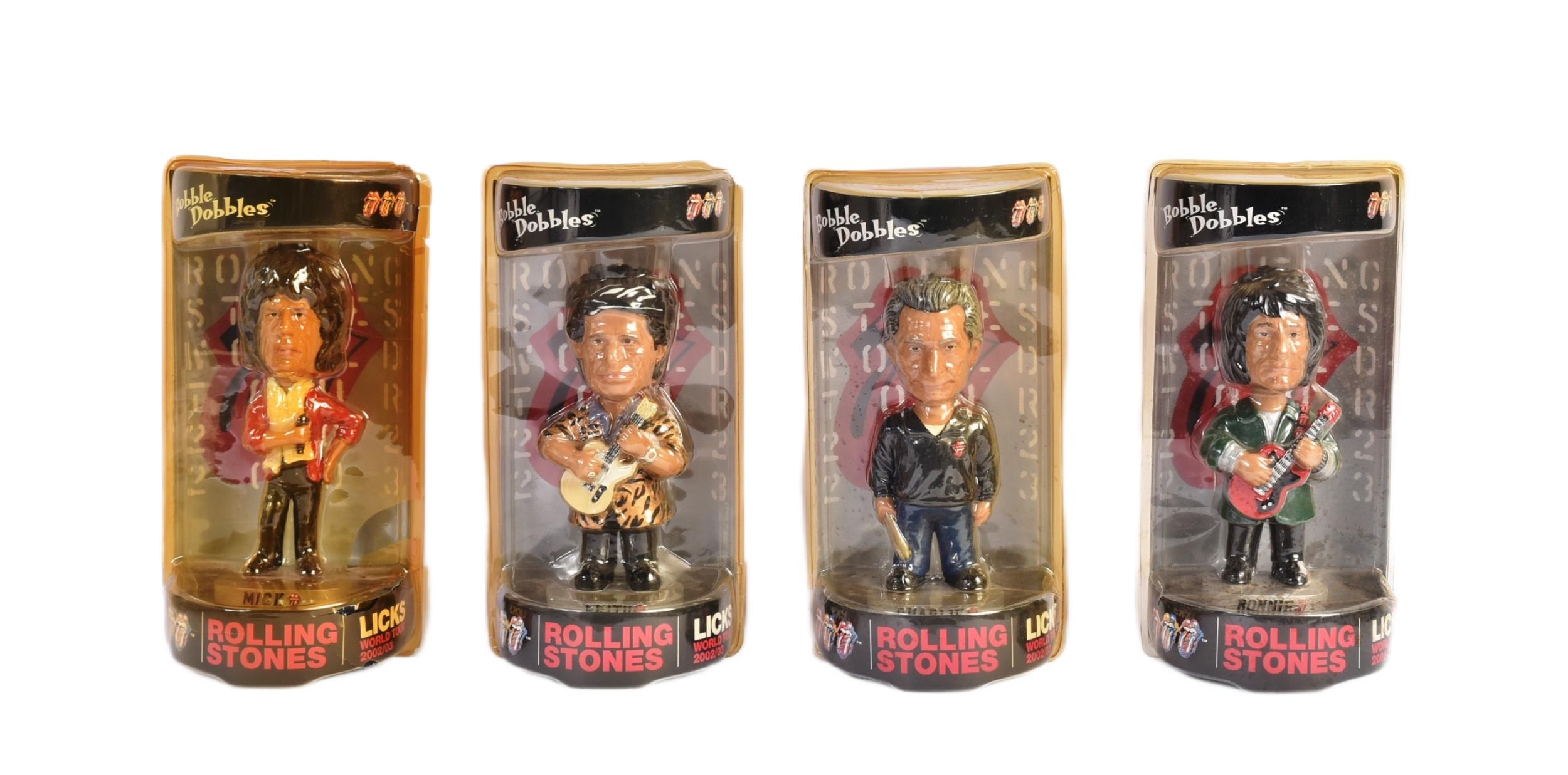 The Rolling Stones - a collection of x4 12" scale Bobblehead action figures from the Licks 2002 / 2003 World Tour comprising Mick, Ronnie, Keith and Charlie. Mick figure packaging loose, otherwise all appearing as new, sealed within original blister packs.