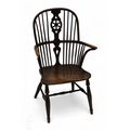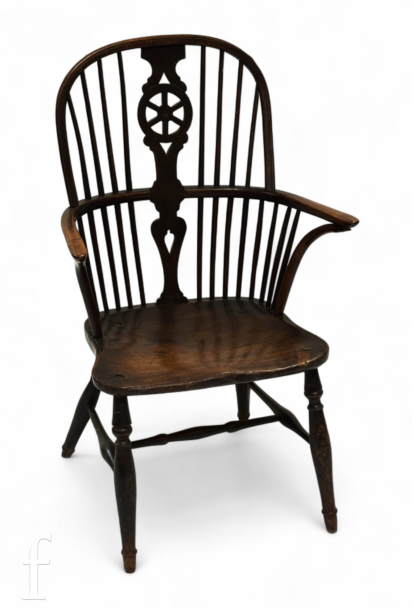 A 19th Century yew wood windsor wheel back elbow chair, ash saddle seat on splayed turned legs and stretchers.