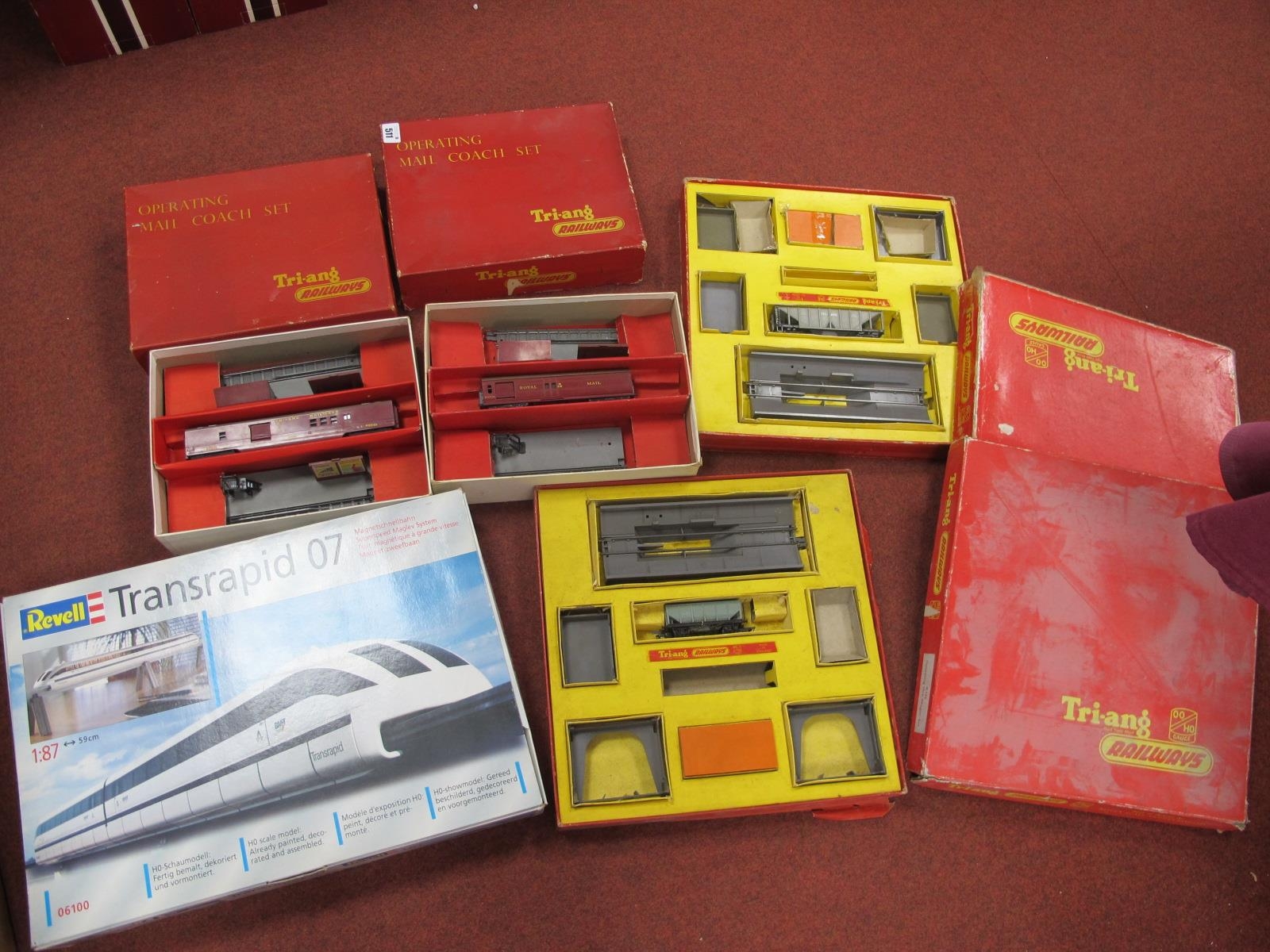 Two Triang 'OO' Gauge/4mm Ref R135 "Operating Ore Wagon" Sets, (appear incomplete) fair box's, plus two Triang operating mail coach sets, a Ref no R23 and Ref R119 (small parts missing, fair box's), also Revell Ref No 06100 Transrapid 07 HO Model of The Superspeed Maglev System (good - good box) (Triang items Ideal), for spares/repair (5).