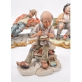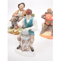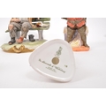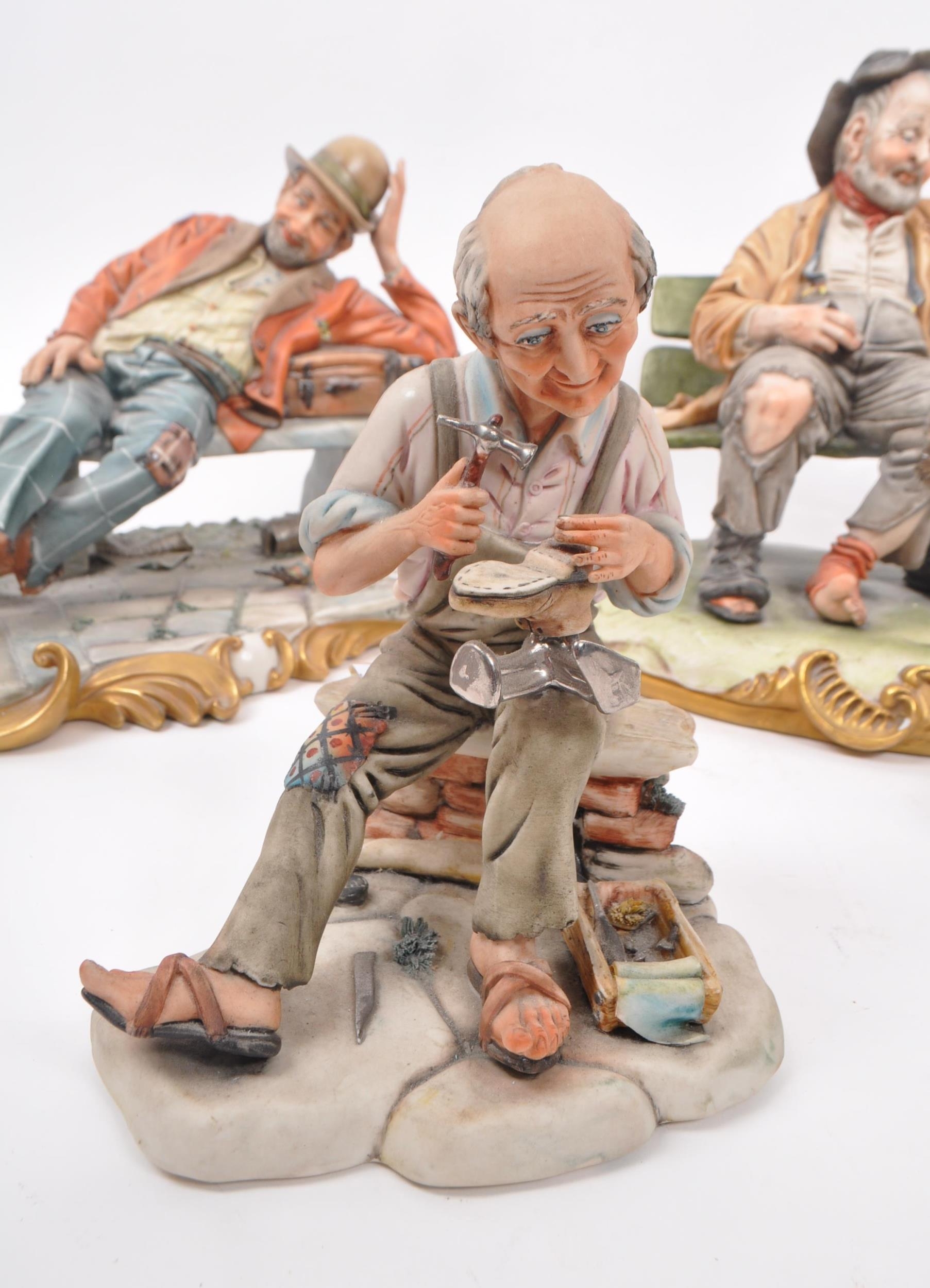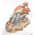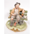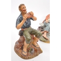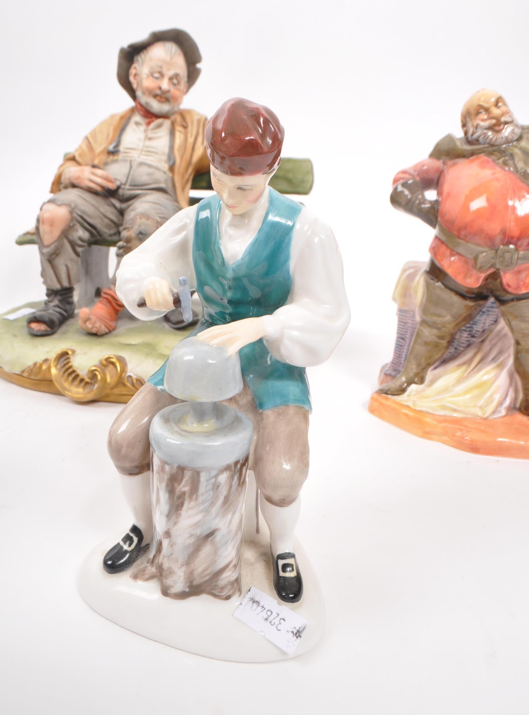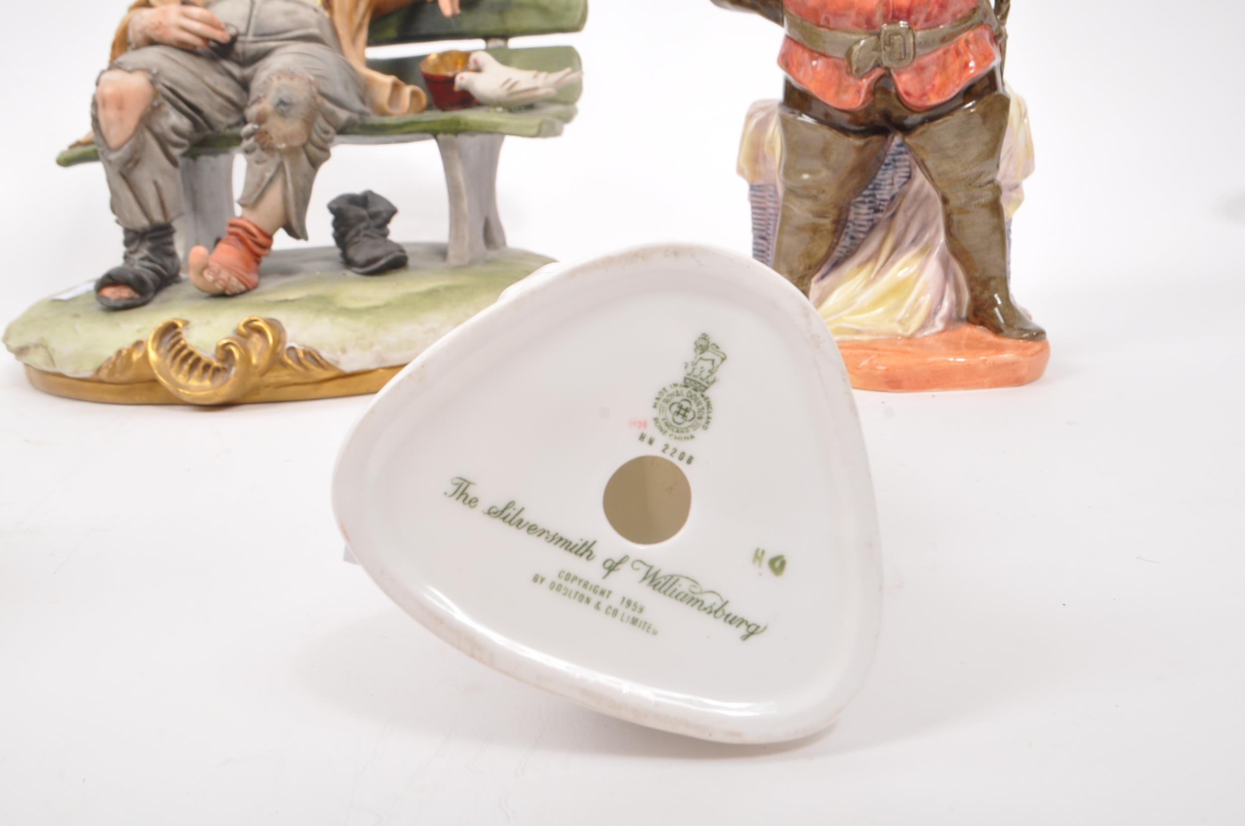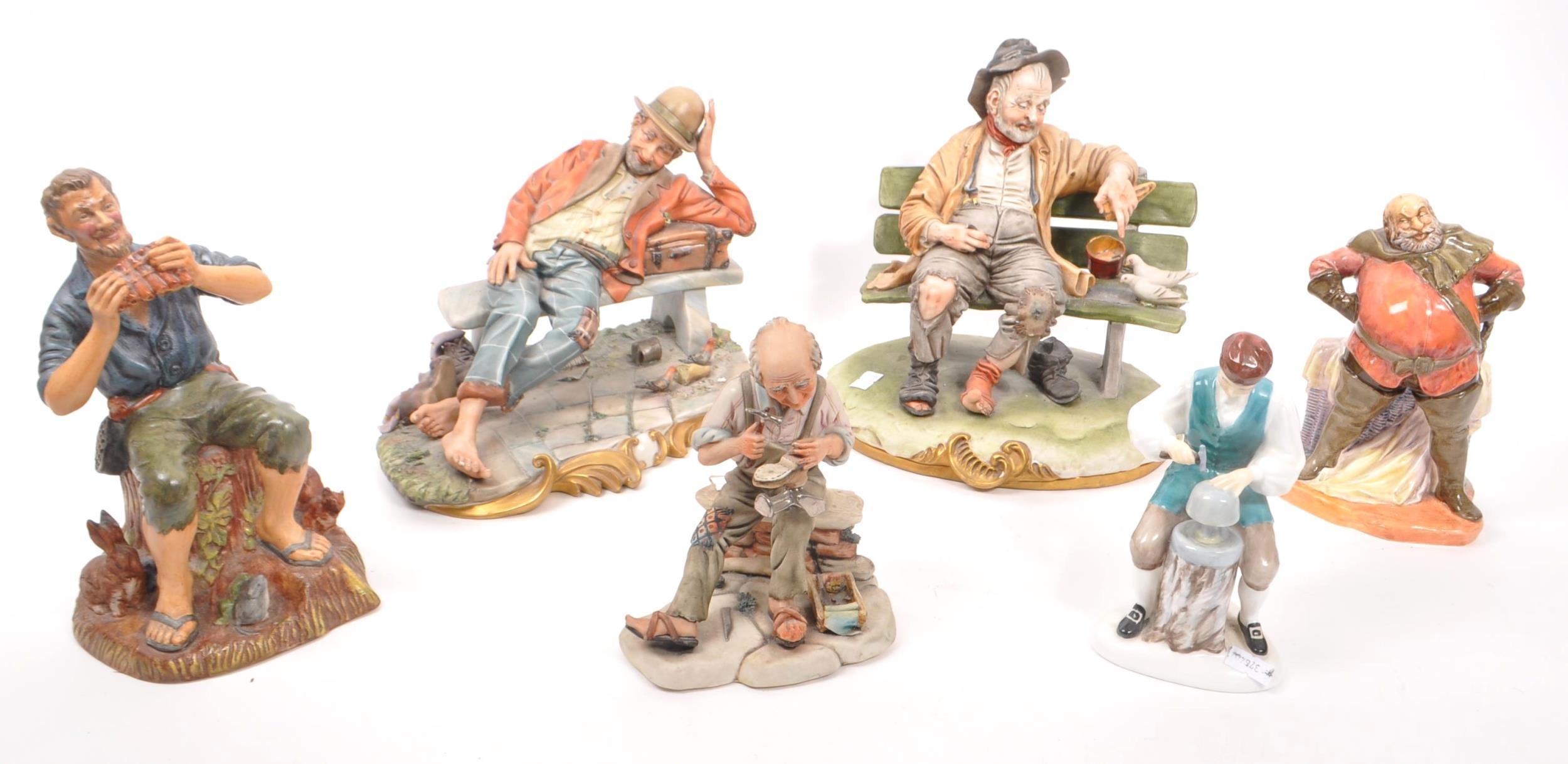 Capodimonte / Royal Doulton - A collection of 20th Century porcelain china figurines comprising of three by Capodimonte: man on bench holding pipe and feeding pigeons, another man on bench leaning across a suitcase, and a shoemaker. Together with three Royal Doulton figurines to include: Dreamweaver HN2283, The Silversmith of Williamsburg HN2208, and Falstaff HN2054. All stamped. Largest measuring approx. 23cm x 25cm x 22cm.