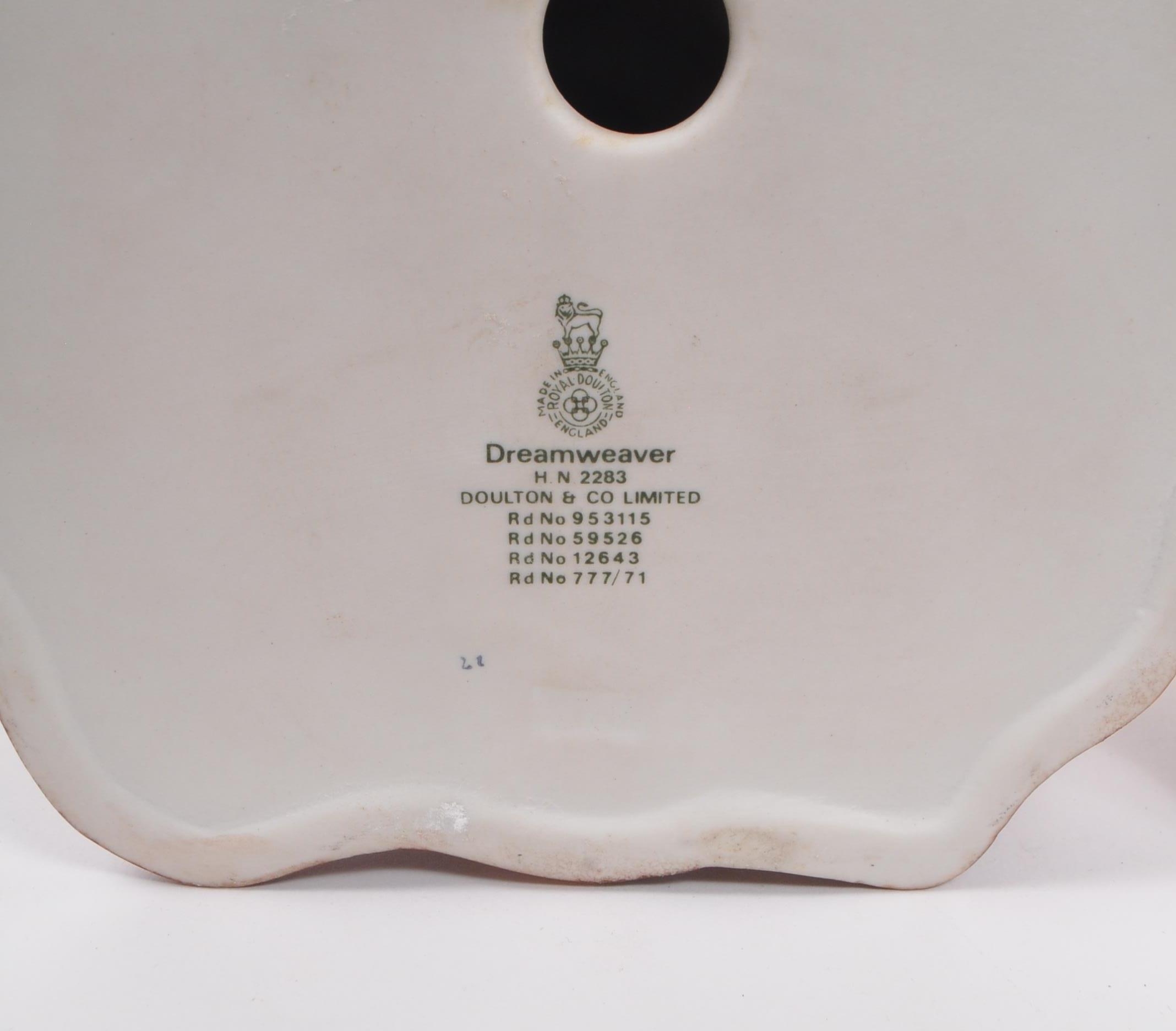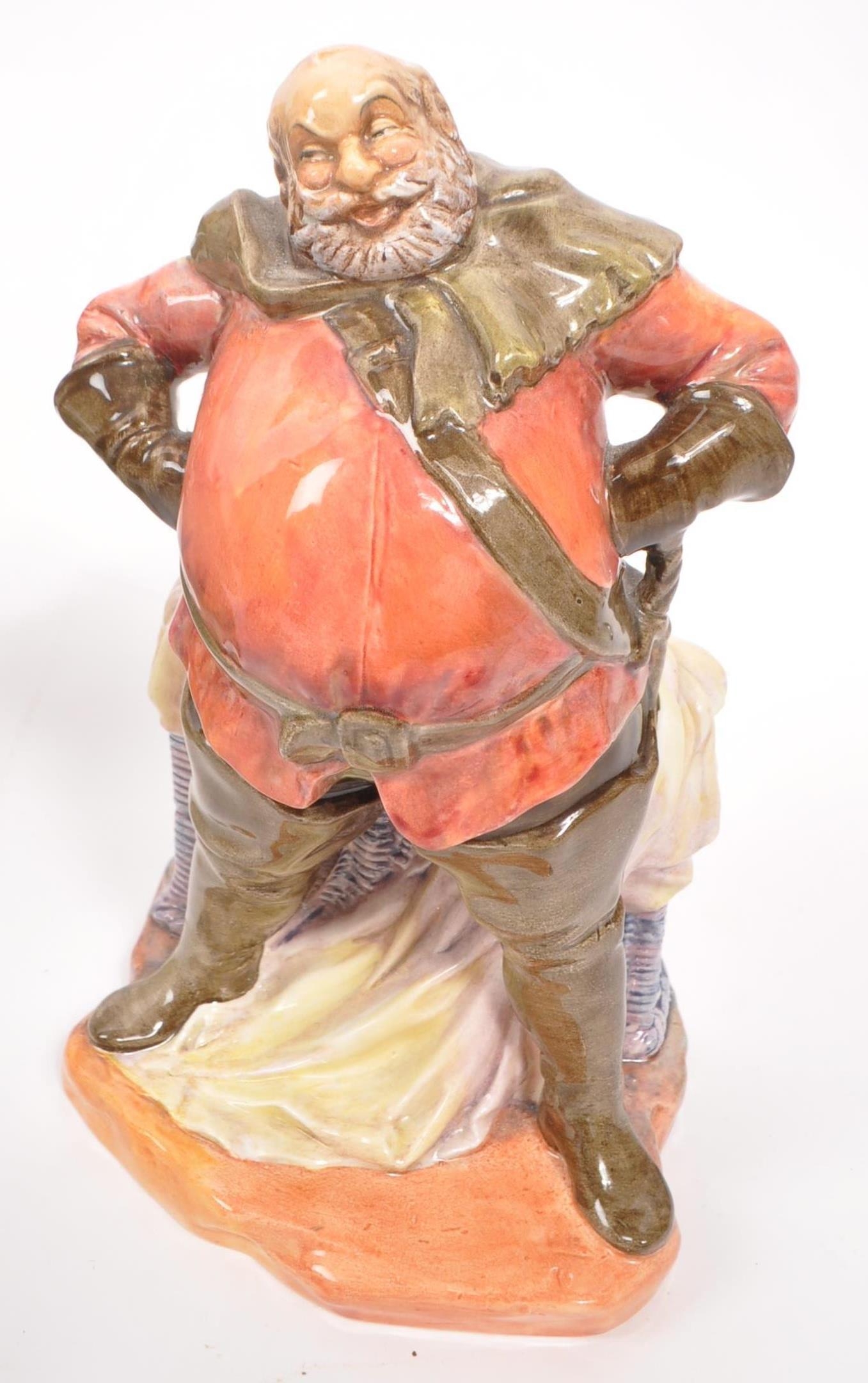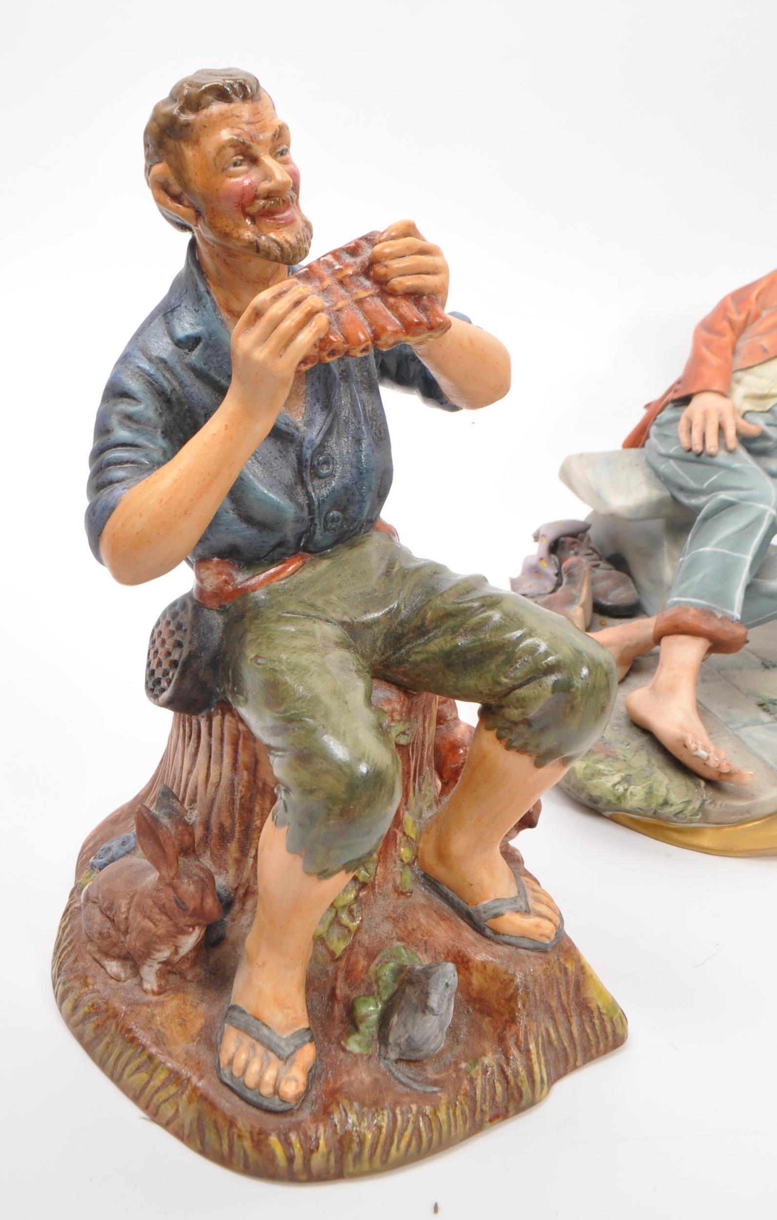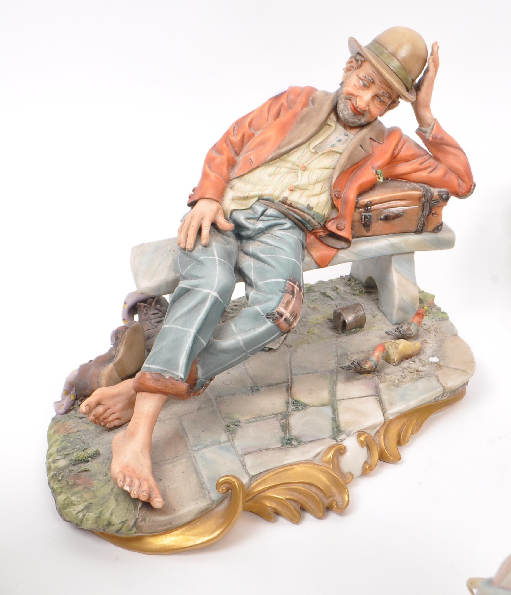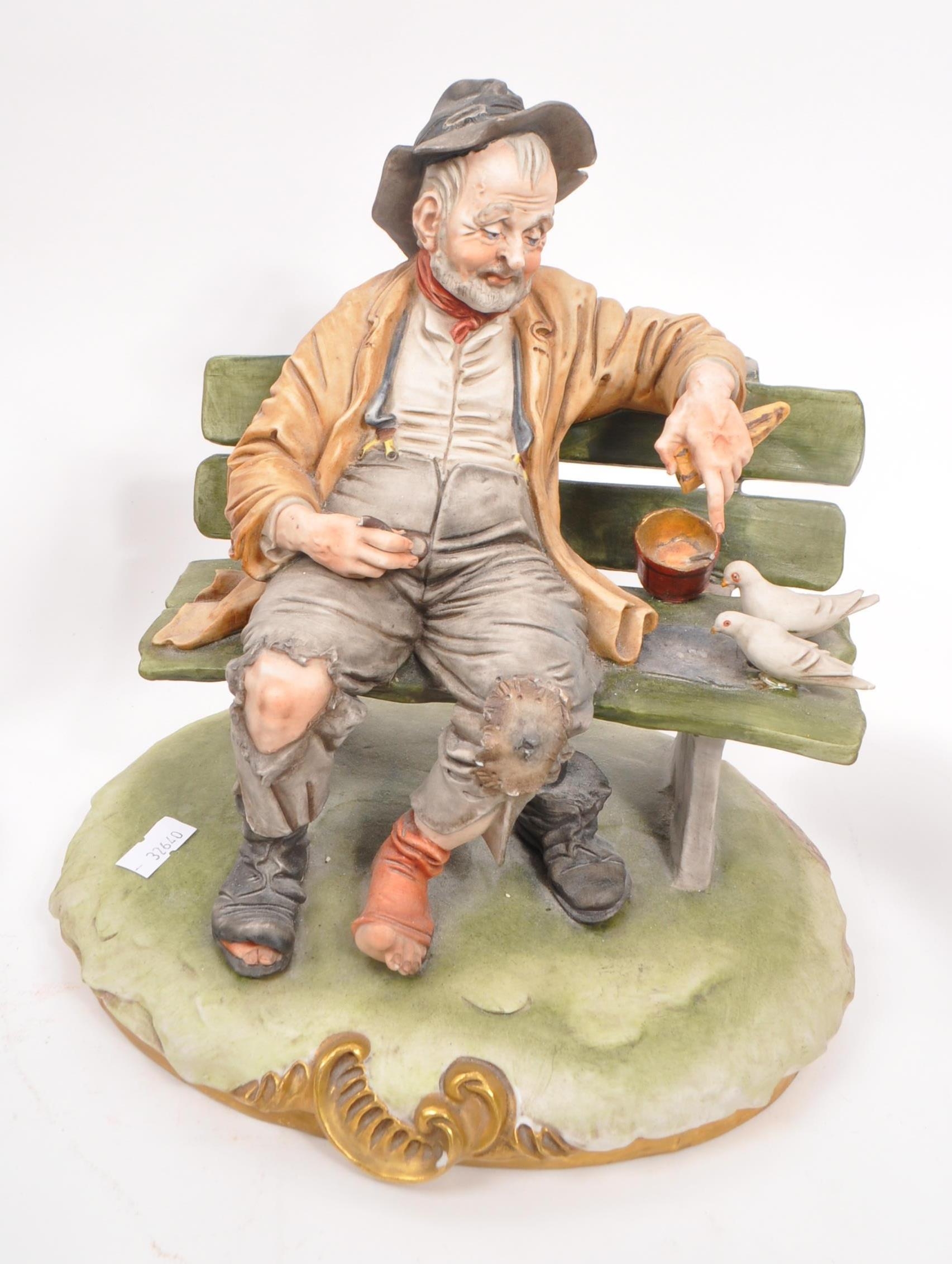 Capodimonte / Royal Doulton - A collection of 20th Century porcelain china figurines comprising of three by Capodimonte: man on bench holding pipe and feeding pigeons, another man on bench leaning across a suitcase, and a shoemaker. Together with three Royal Doulton figurines to include: Dreamweaver HN2283, The Silversmith of Williamsburg HN2208, and Falstaff HN2054. All stamped. Largest measuring approx. 23cm x 25cm x 22cm.