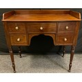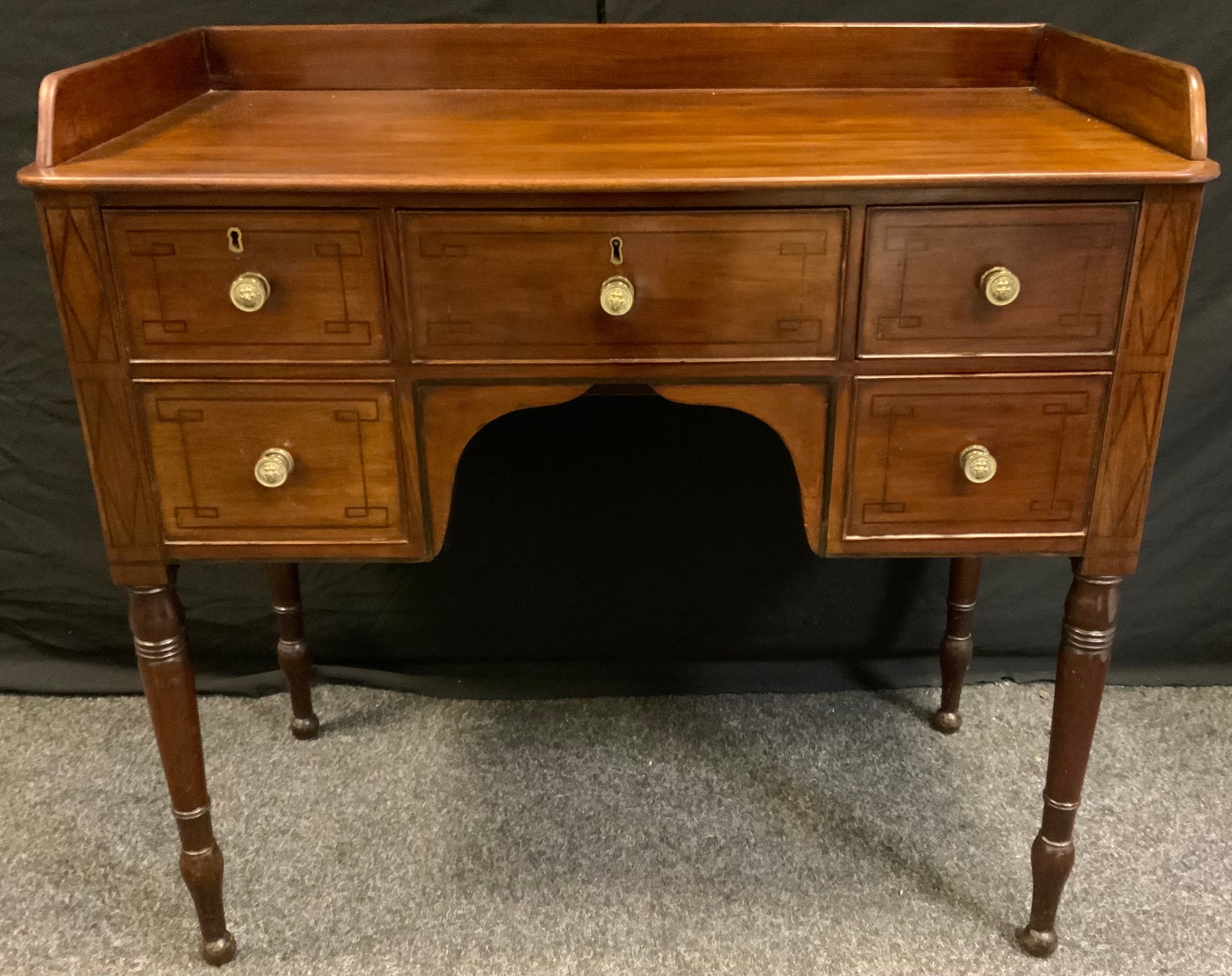 A George III style mahogany knee-hole desk, three quarter gallery rectangular top above a central long drawer, flanked by two short of drawers, turned legs, 85cm high, 87cm wide, 46cvm deep.