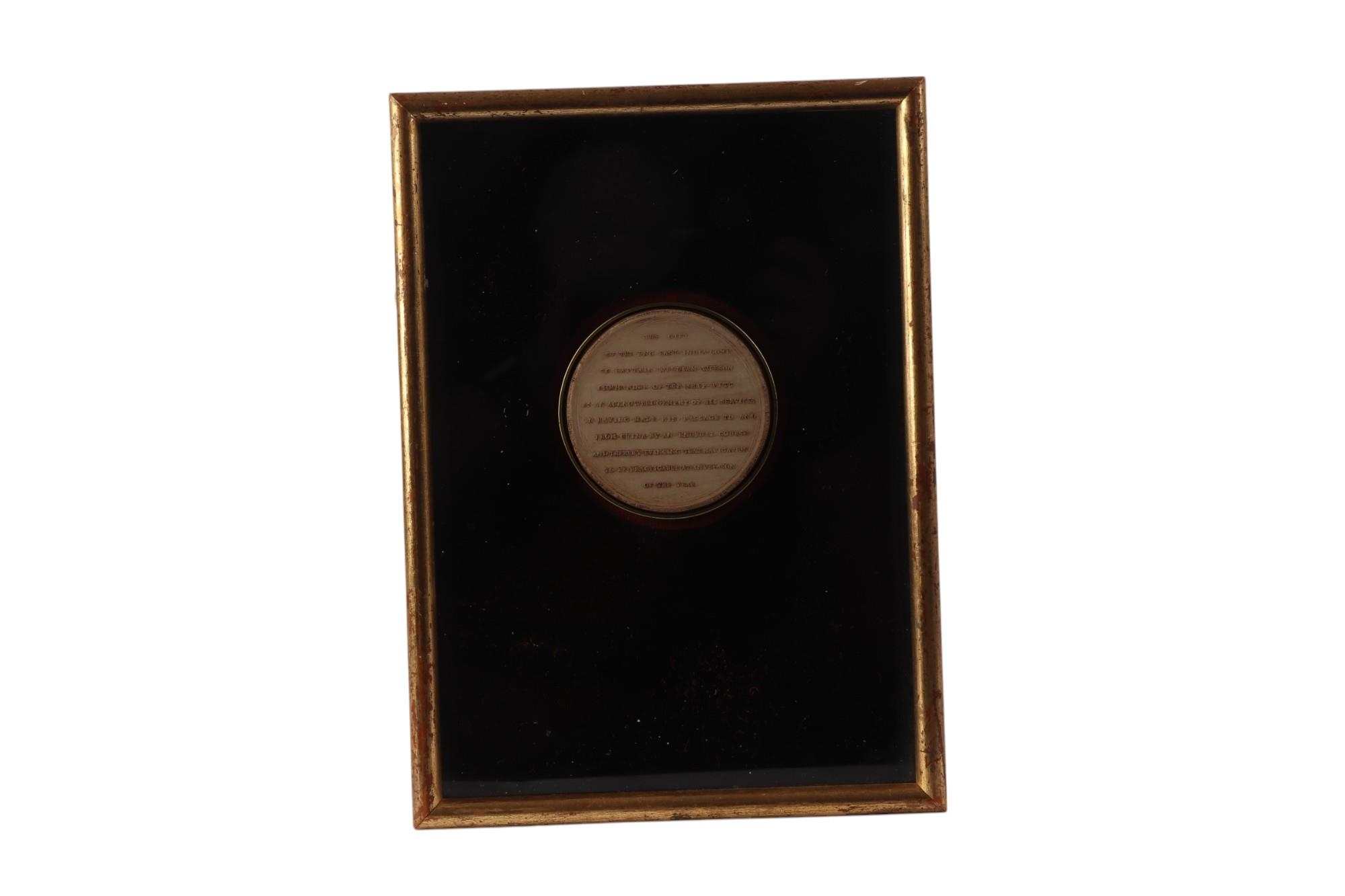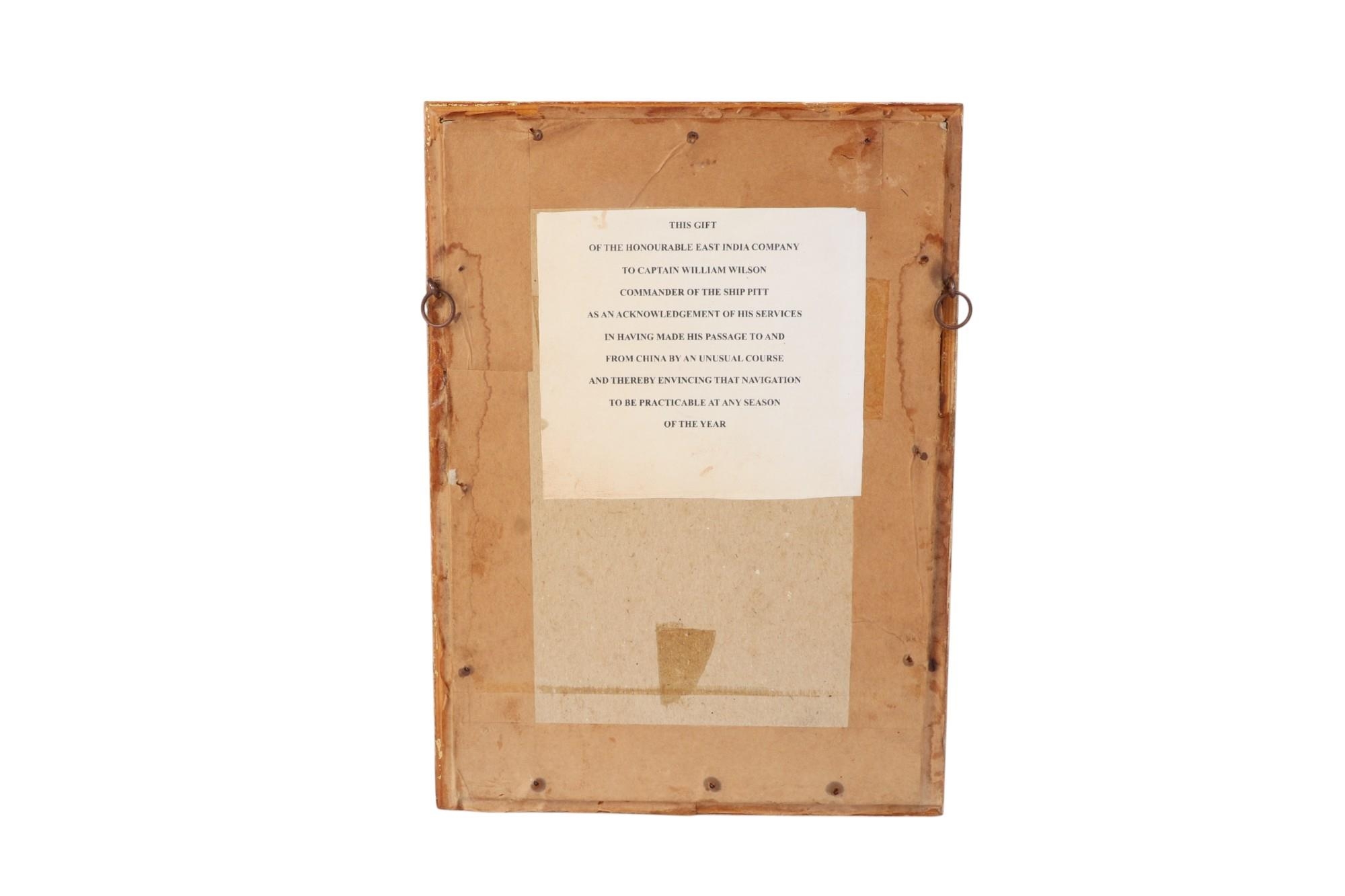 Naval interest: British East India Company, a commemorative plaque for Captain William Wilson (1715-1795) for discovering a new route that allowed navigation to China at any time of year, framed & glazed, 25 by 18cms overall.