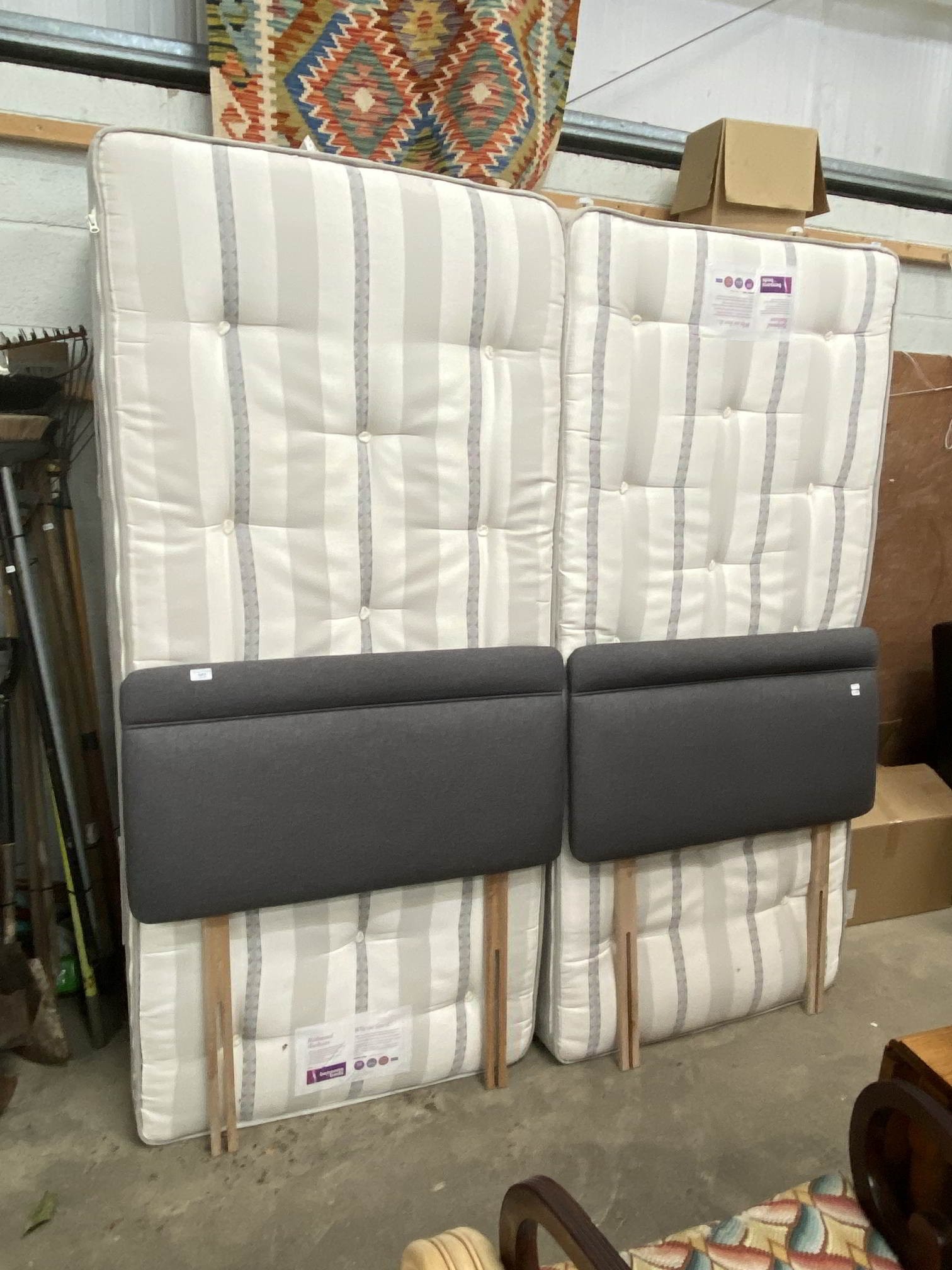 2x 3ft zip link Bensons For Beds 'Richmond' back care mattresses with divan base and 2 grey headboards