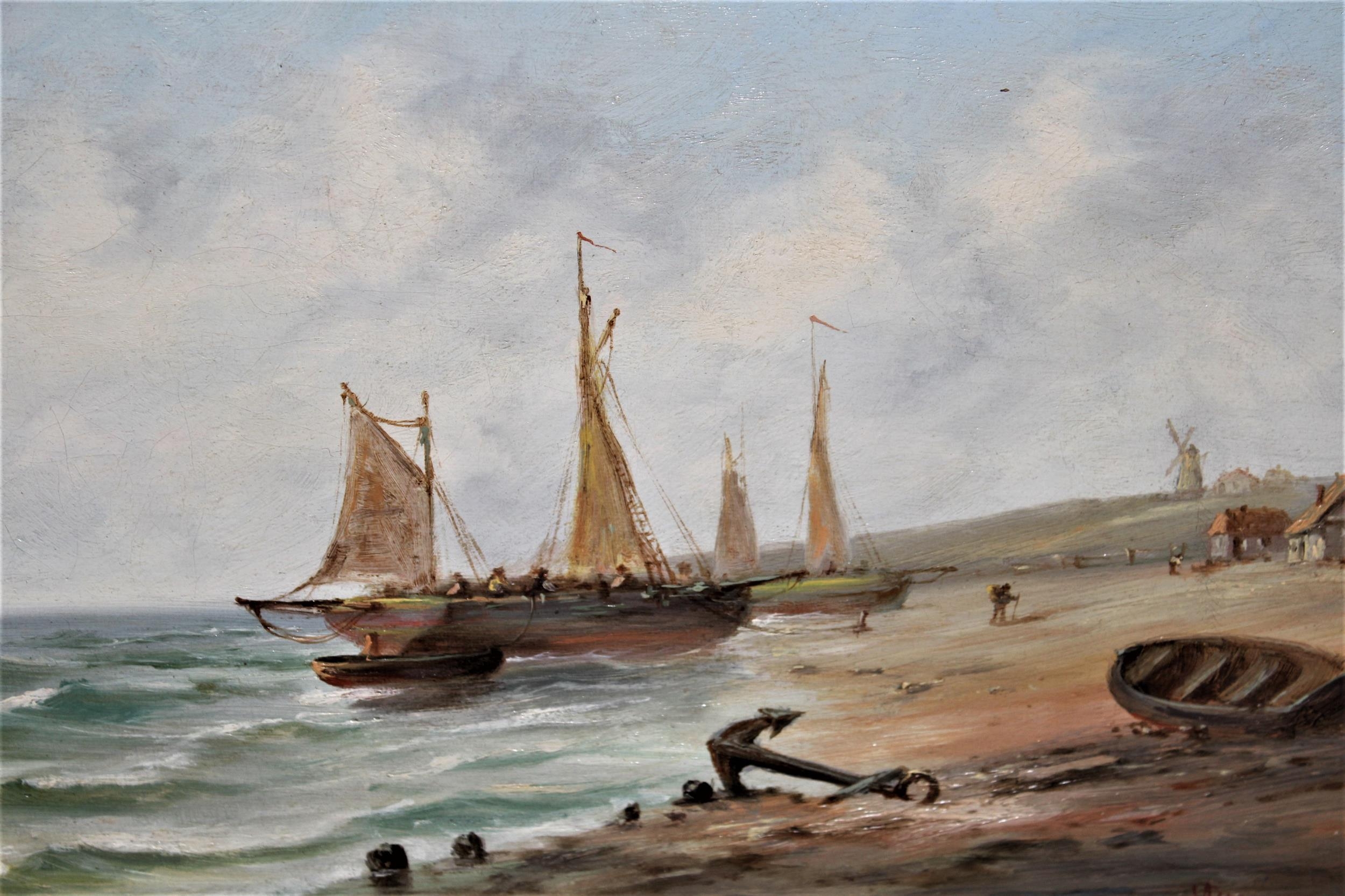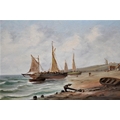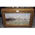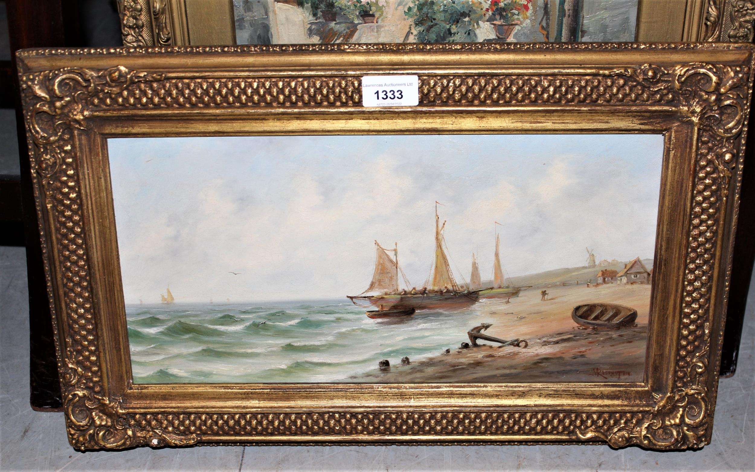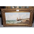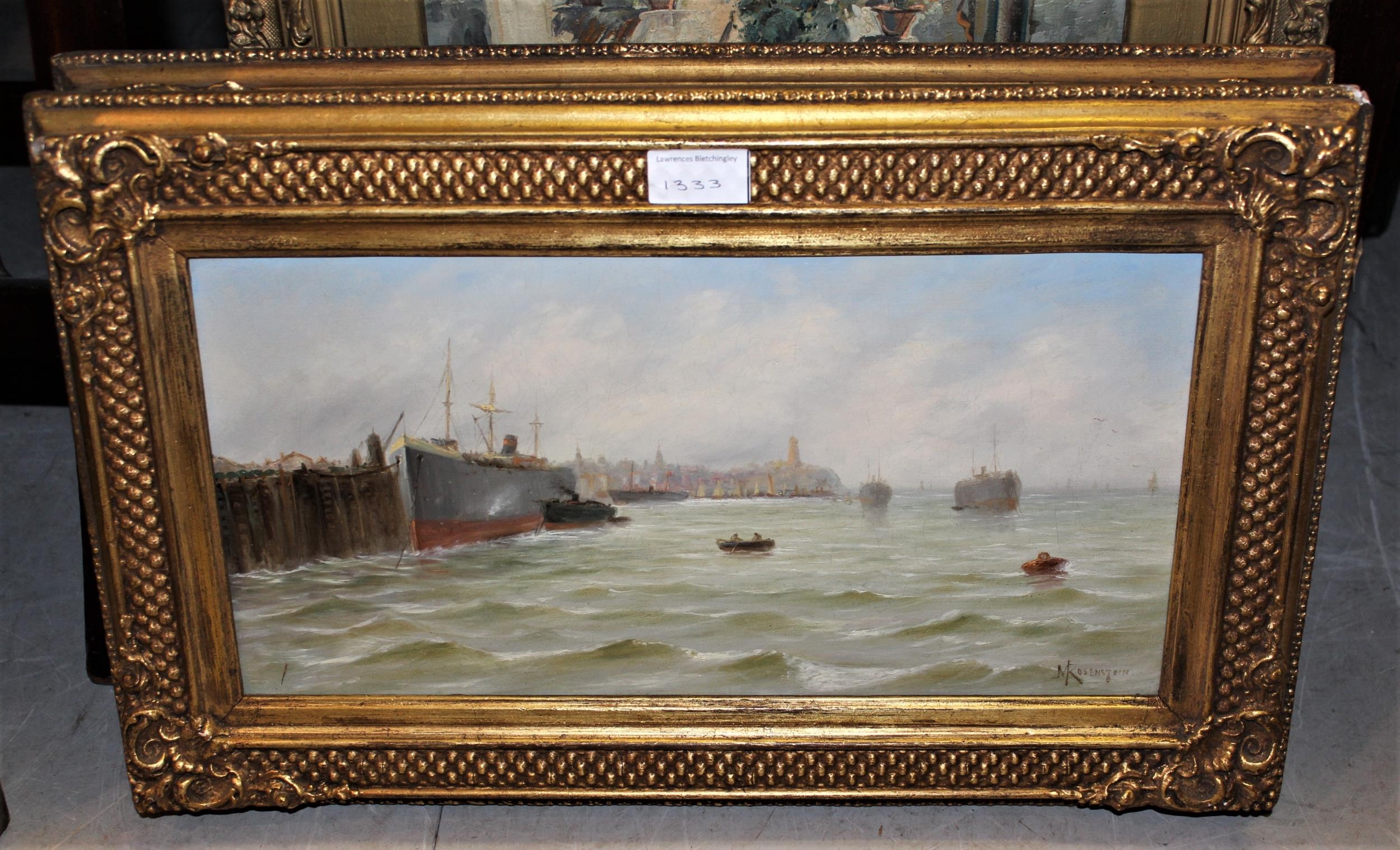 M. Rosenstein, pair of oil paintings on canvas, steam ship at a quayside in Continental port and a beach scene with fishing boats, both signed, 8ins x 16ins, gilt framed