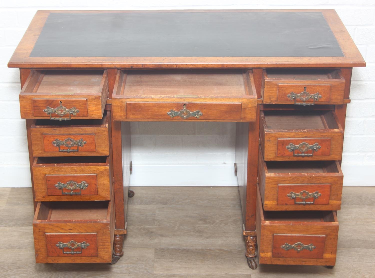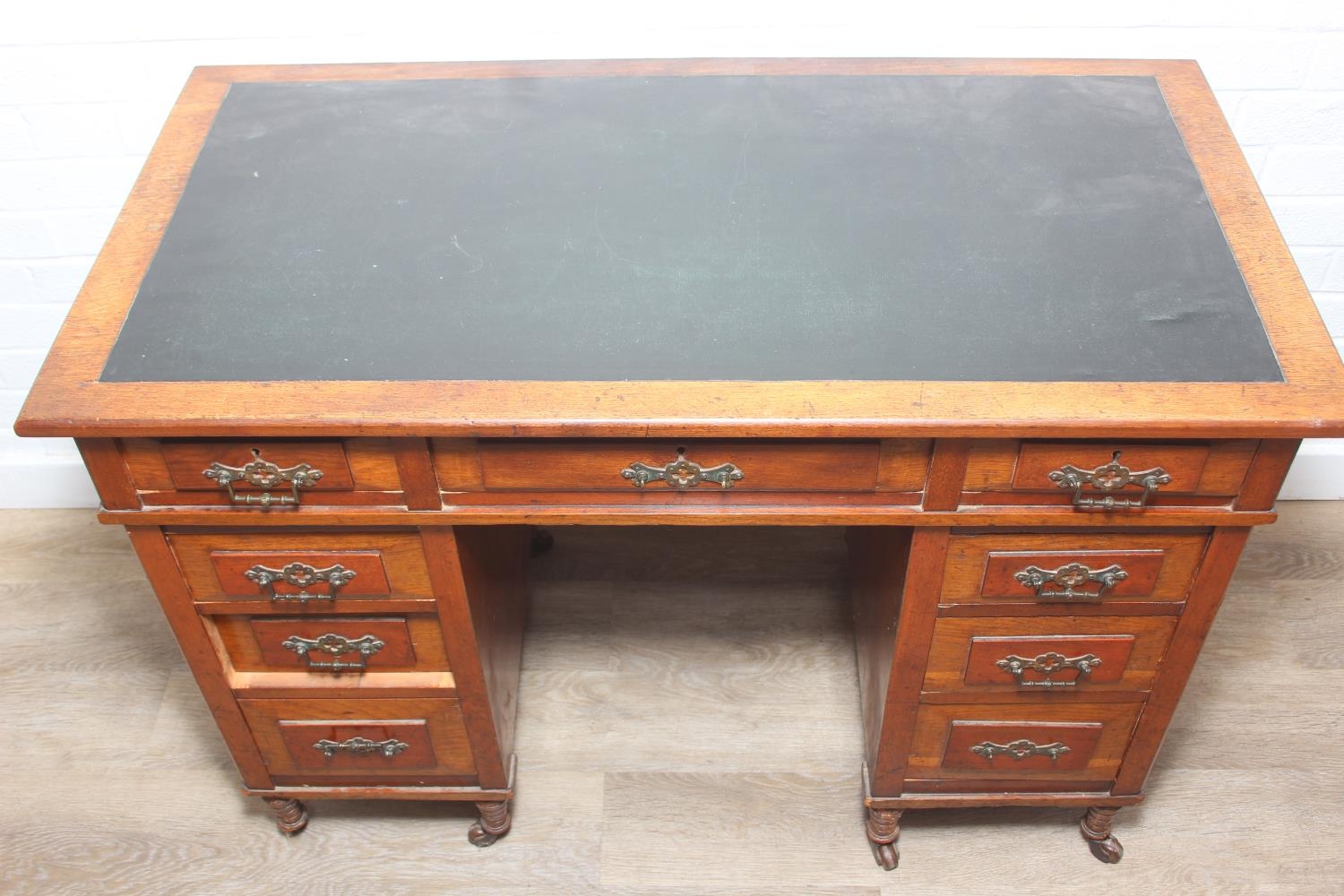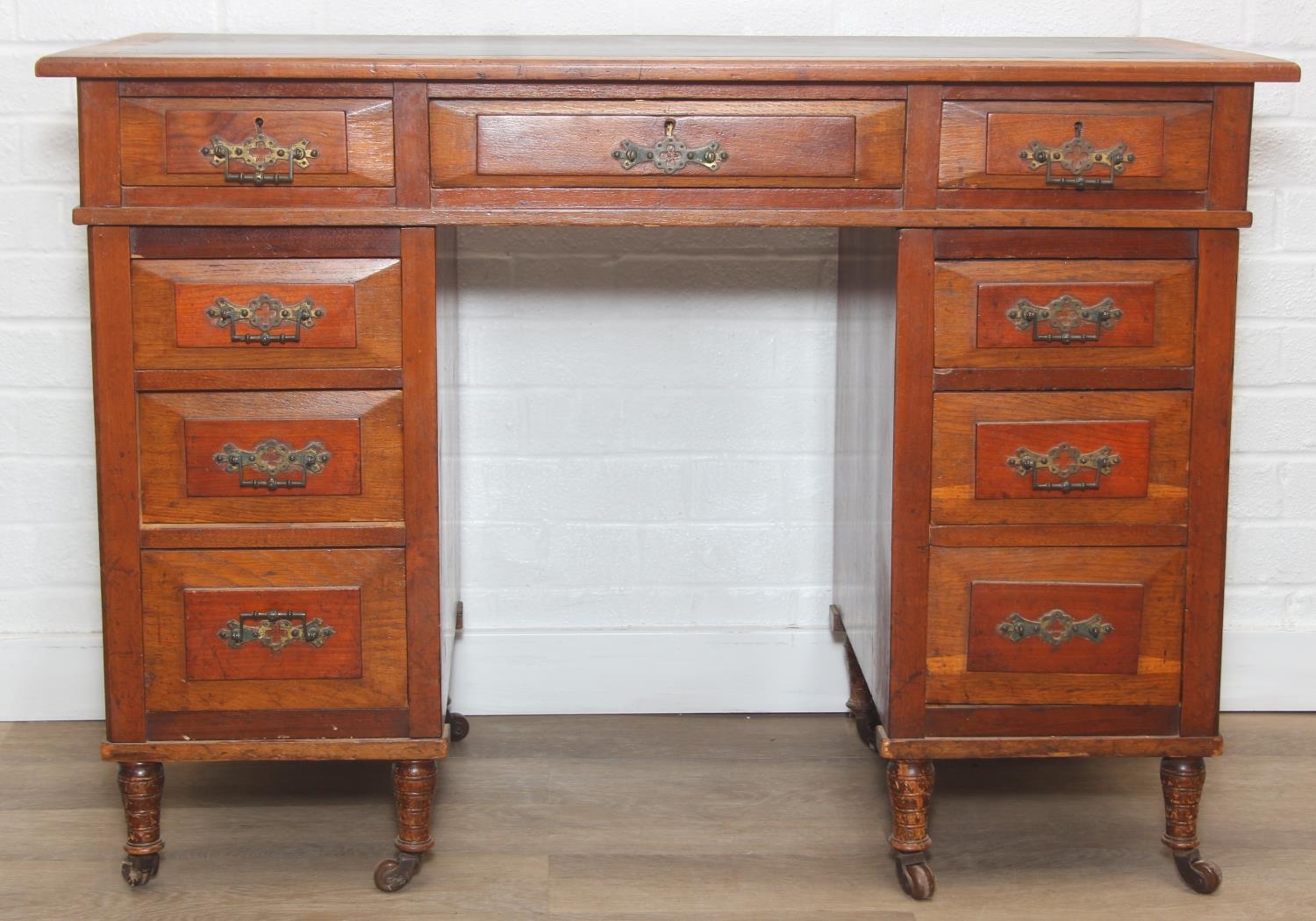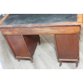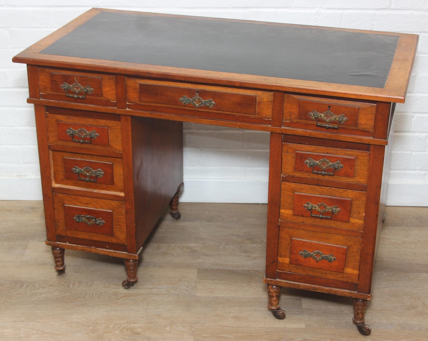 An Edwardian three part desk with inset dark leather top and castors, brass fittings, 106cm x 55cm x 74cm