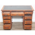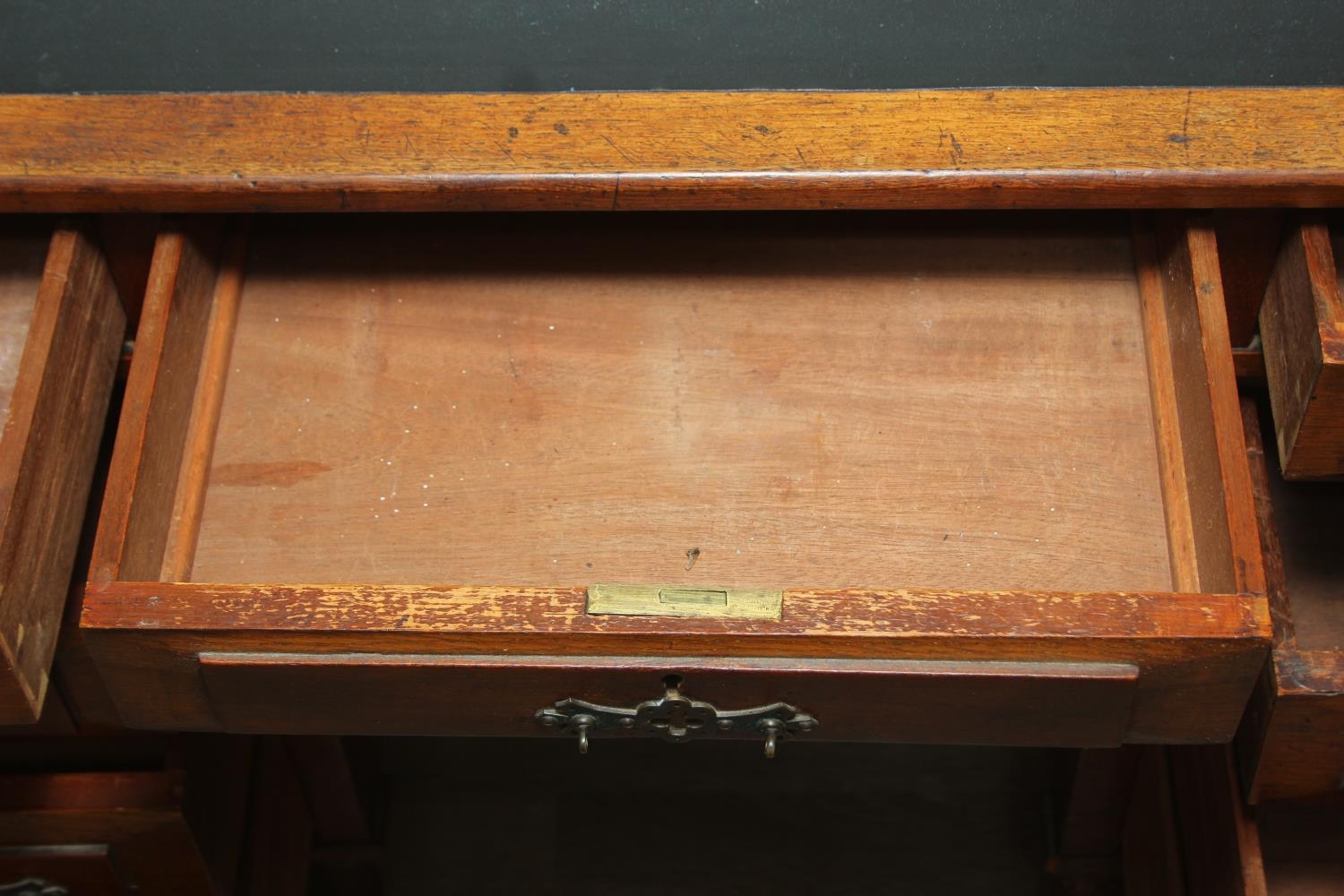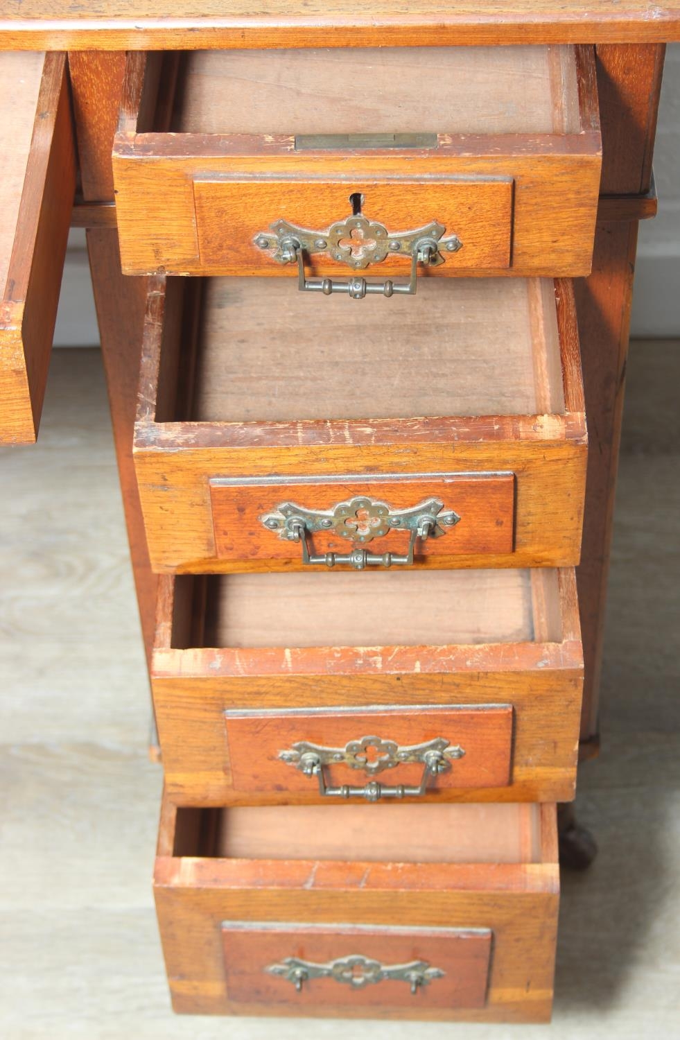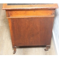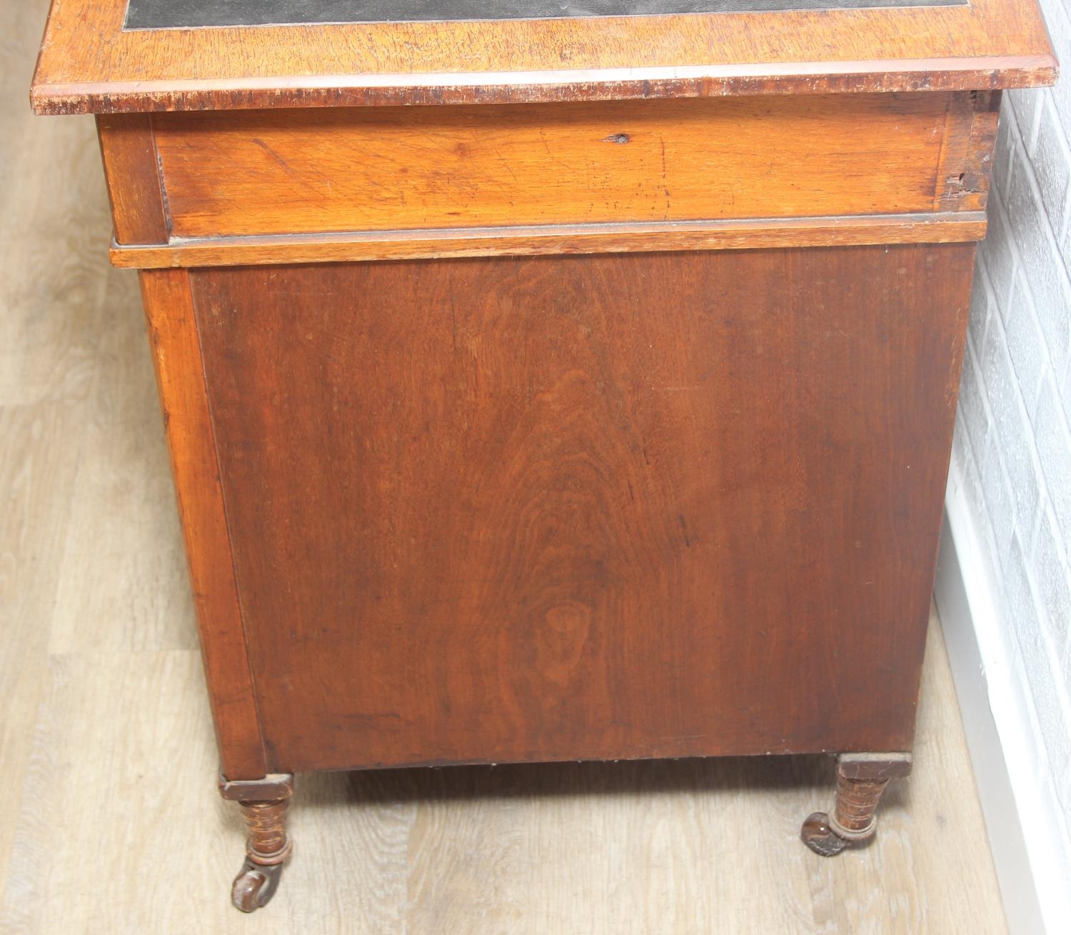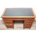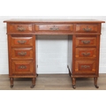 An Edwardian three part desk with inset dark leather top and castors, brass fittings, 106cm x 55cm x 74cm