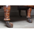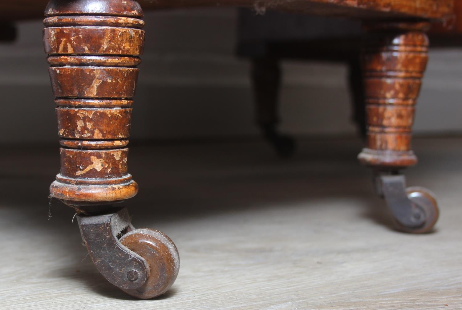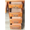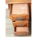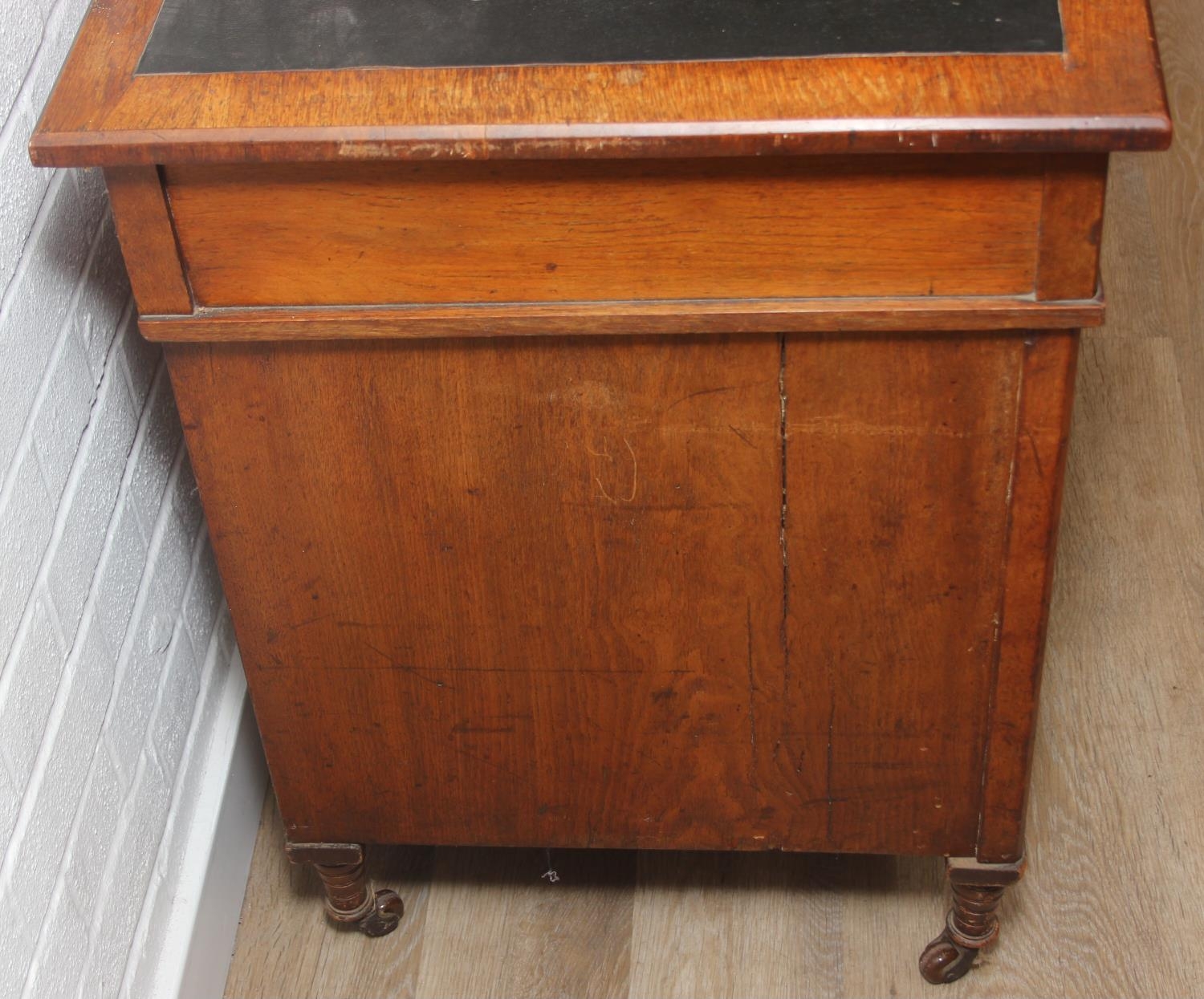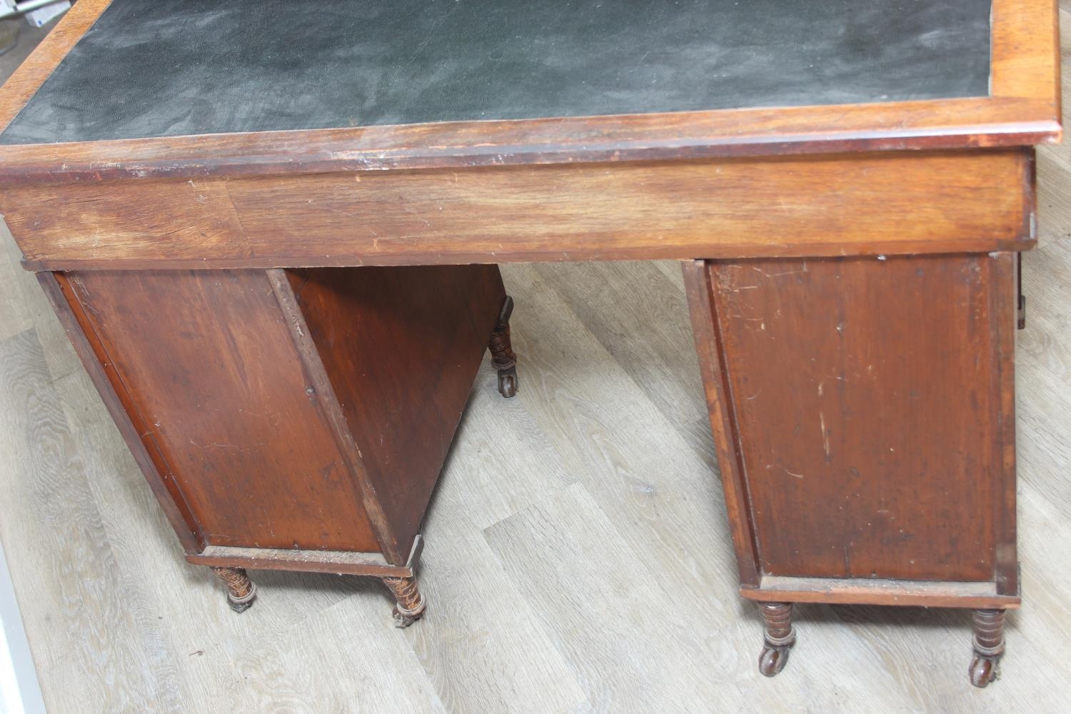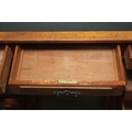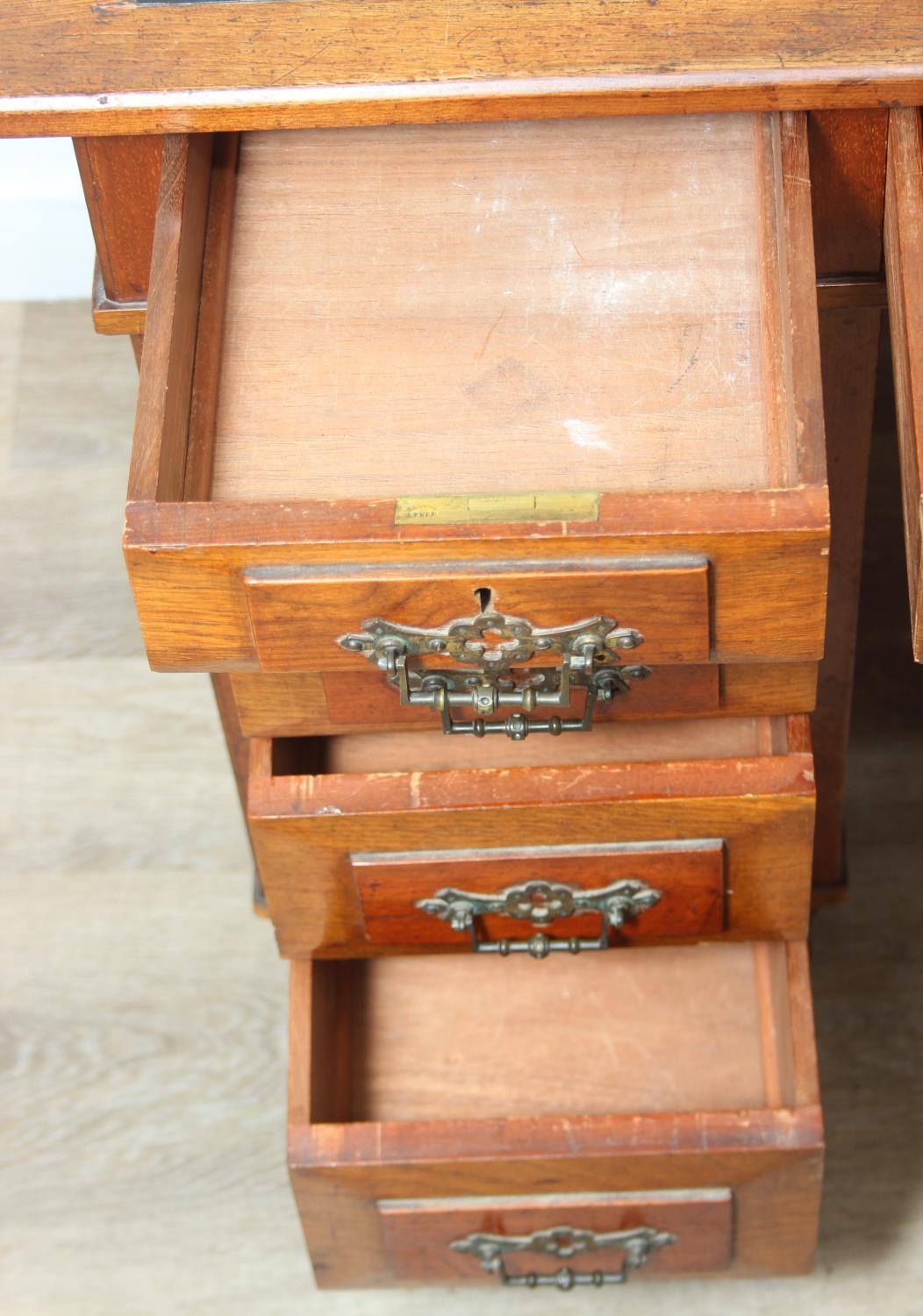 An Edwardian three part desk with inset dark leather top and castors, brass fittings, 106cm x 55cm x 74cm