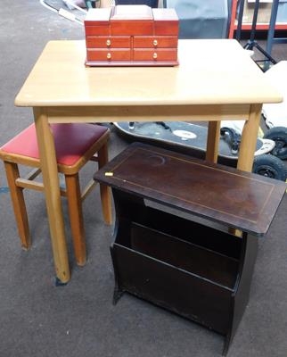 Selection of furniture inc small table, retro stool, magazine rack etc