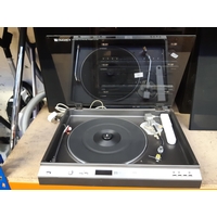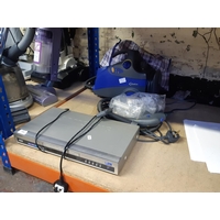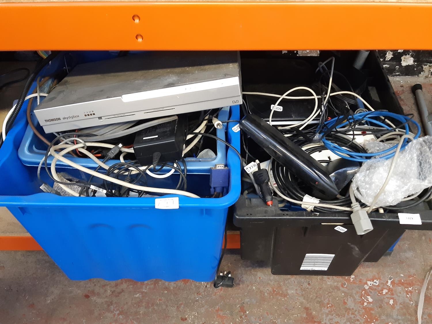 Two boxes containing a Thompson sky digibox, internet hubs, multi-plugs, various leads etc.
