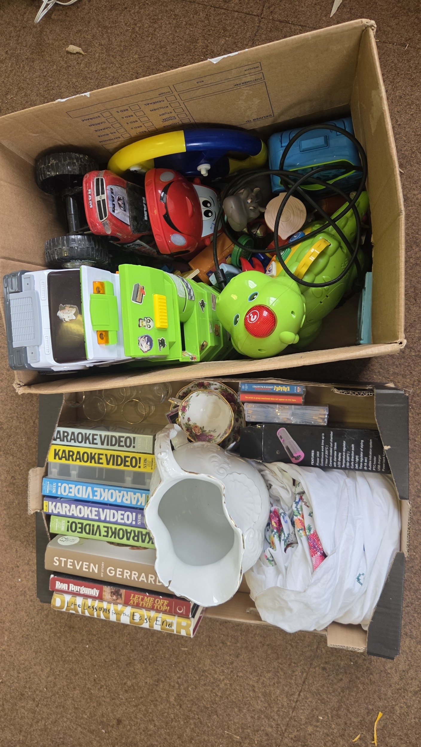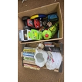 Two Boxes of Household Goods, Media, and Plastic Toys