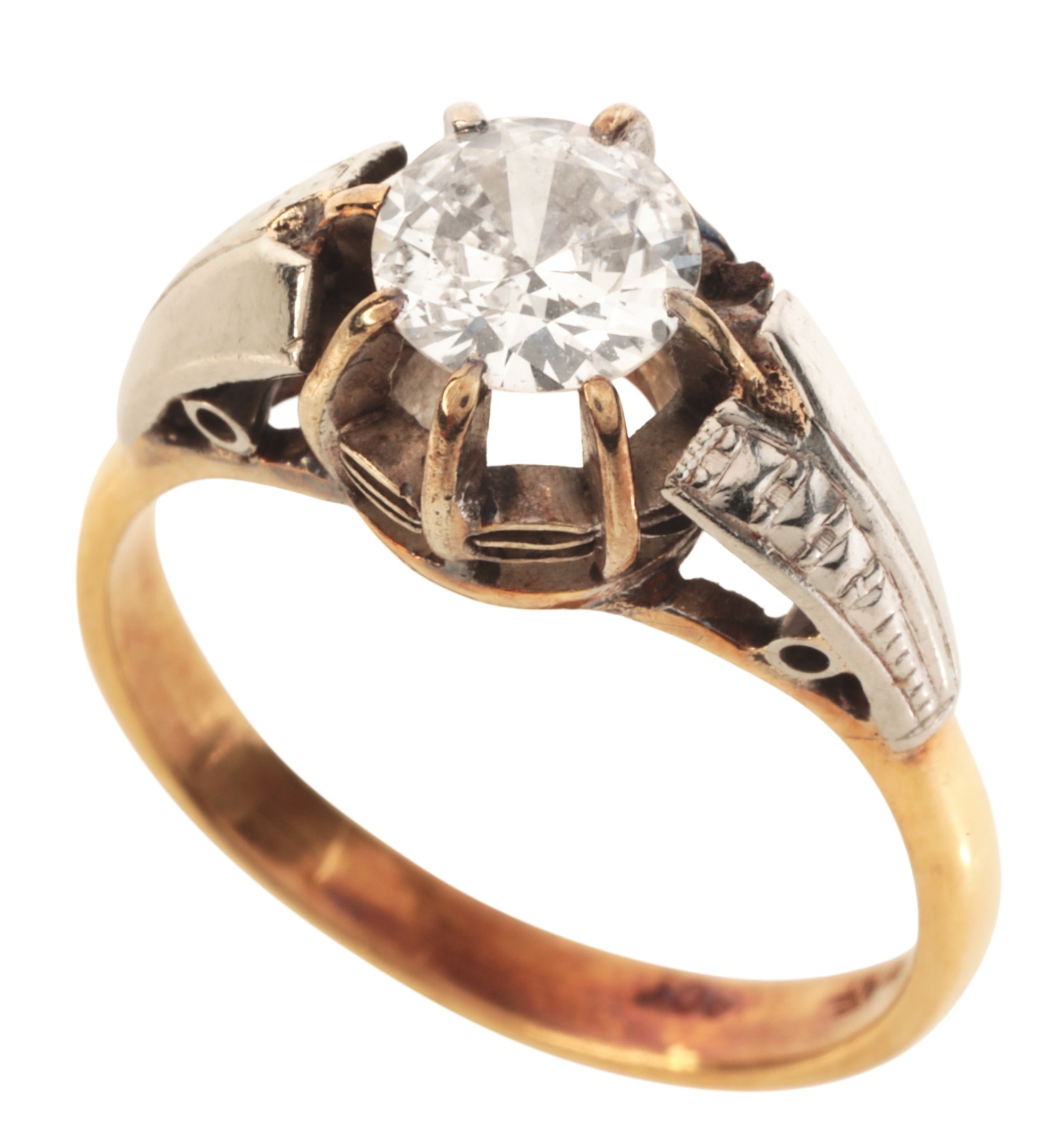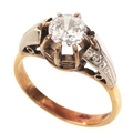 in 18ct gold and platinum, set with a round cut diamond of c. 0.66 carats held in a claw setting, to stylised shoulders with engraved detailing, stamped '18CT PLAT', ring size N, c. 3.8 grams