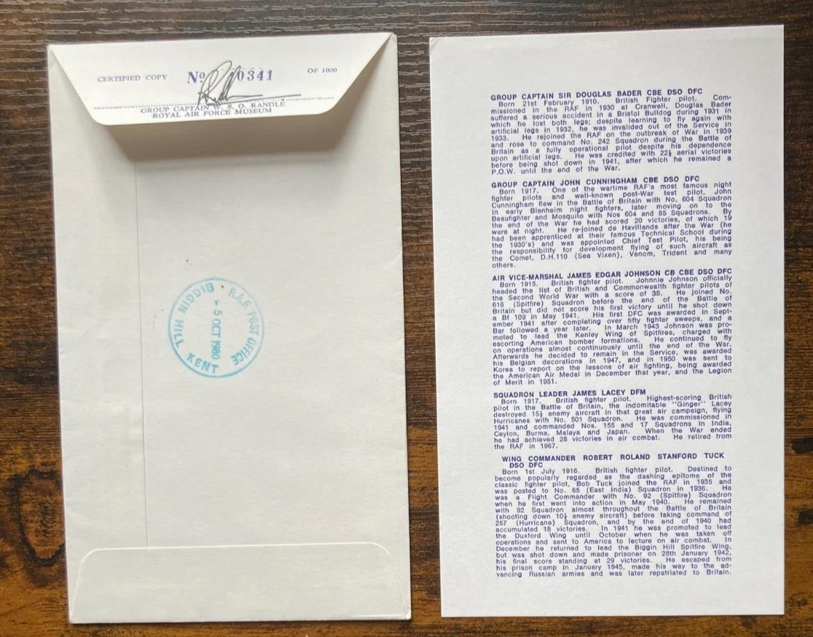 40th anniversary of the Battle of Britain cover signed by FIVE RAF fighter aces, Douglas Bader, Bob Stanford-Tuck, Johnnie Johnson, James 'Ginger' Lacey and John Cunningham Good condition. All autographs come with a Certificate of Authenticity. We combine postage on multiple winning lots and can ship worldwide. UK postage from £5.99, EU from £7.99, Rest of World from £9.99