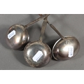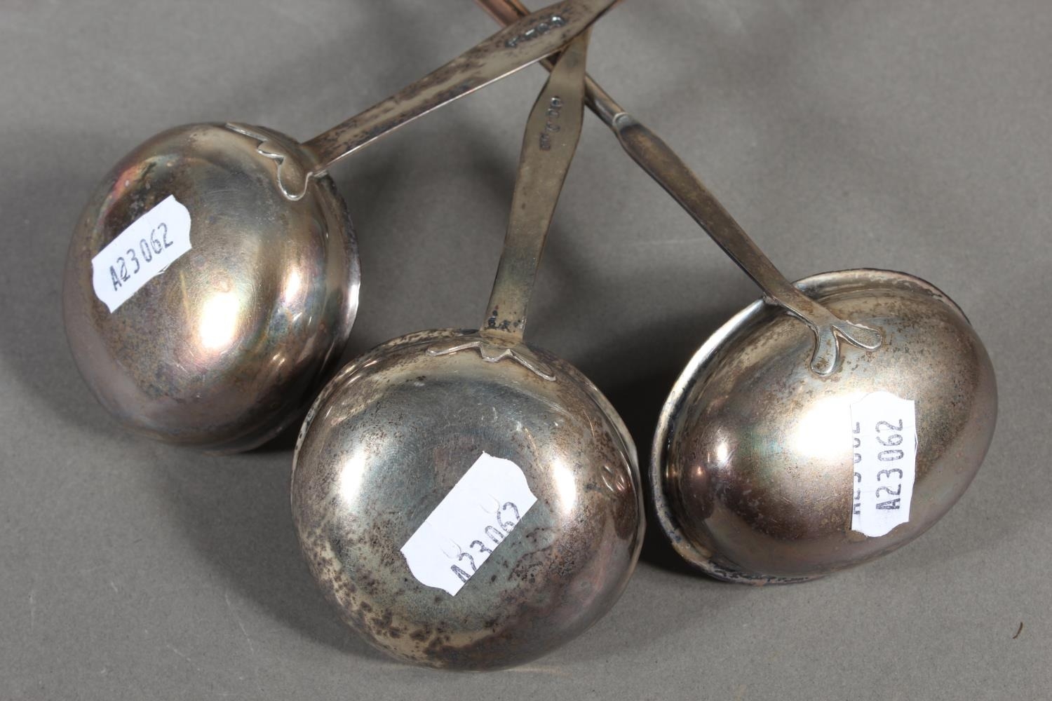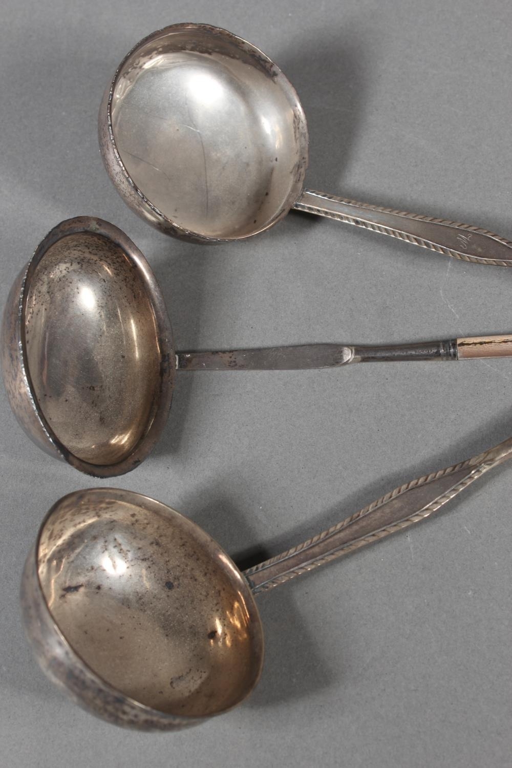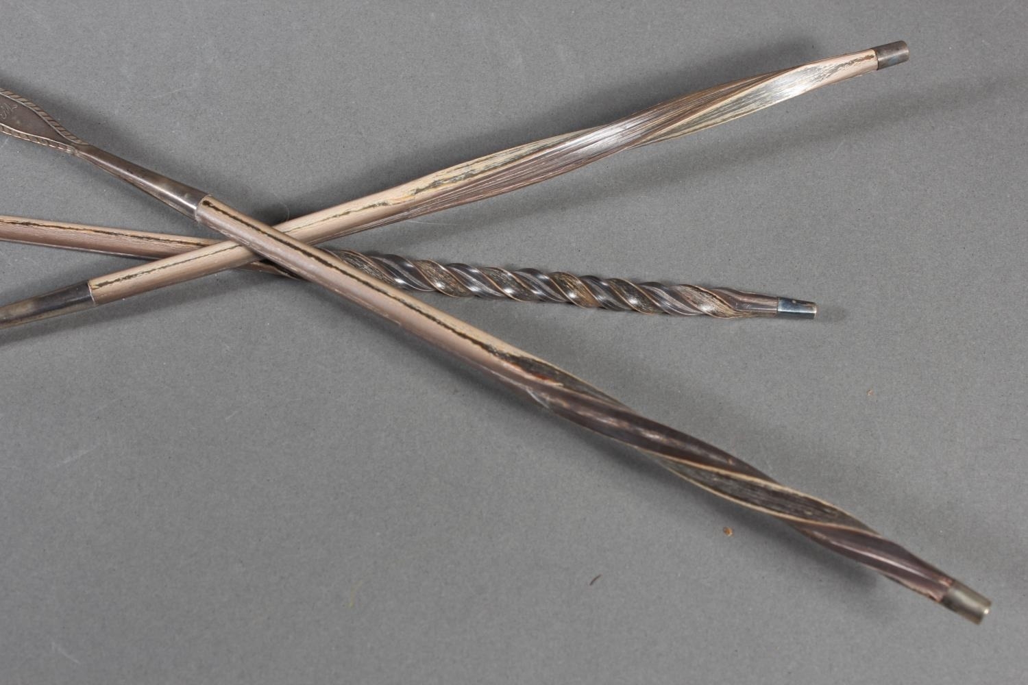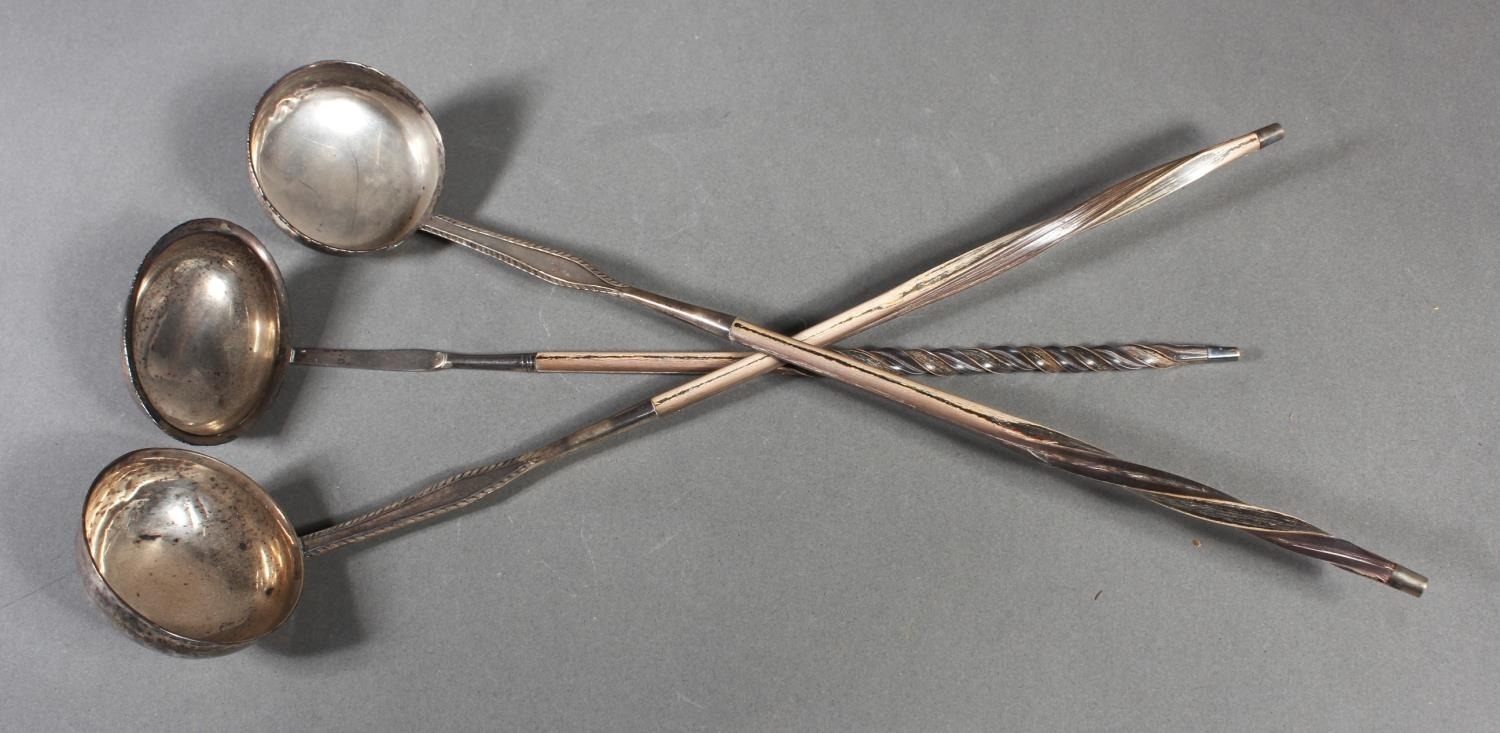 Three antique silver and baleen twist handled toddy ladles, (3), longest 36cm long.