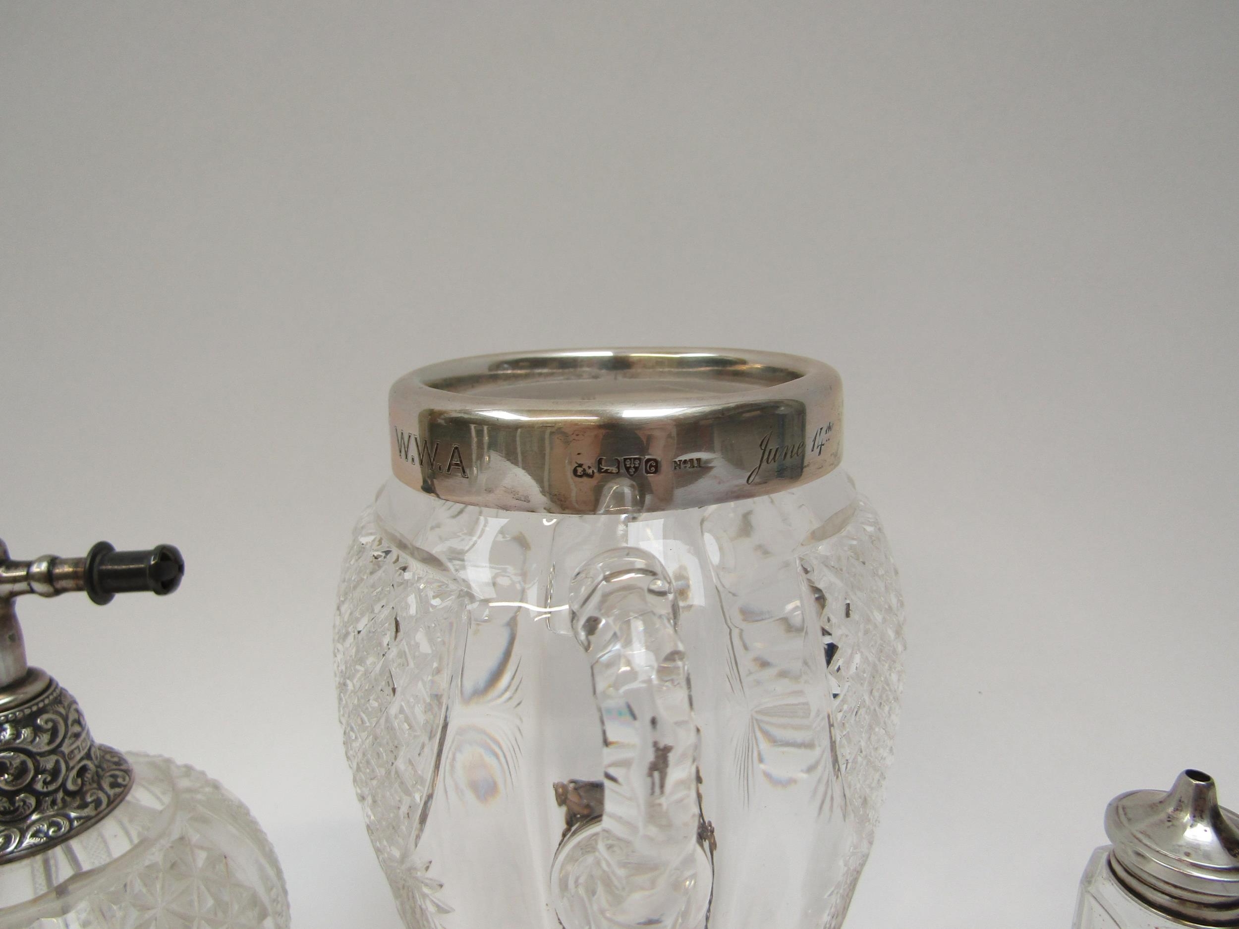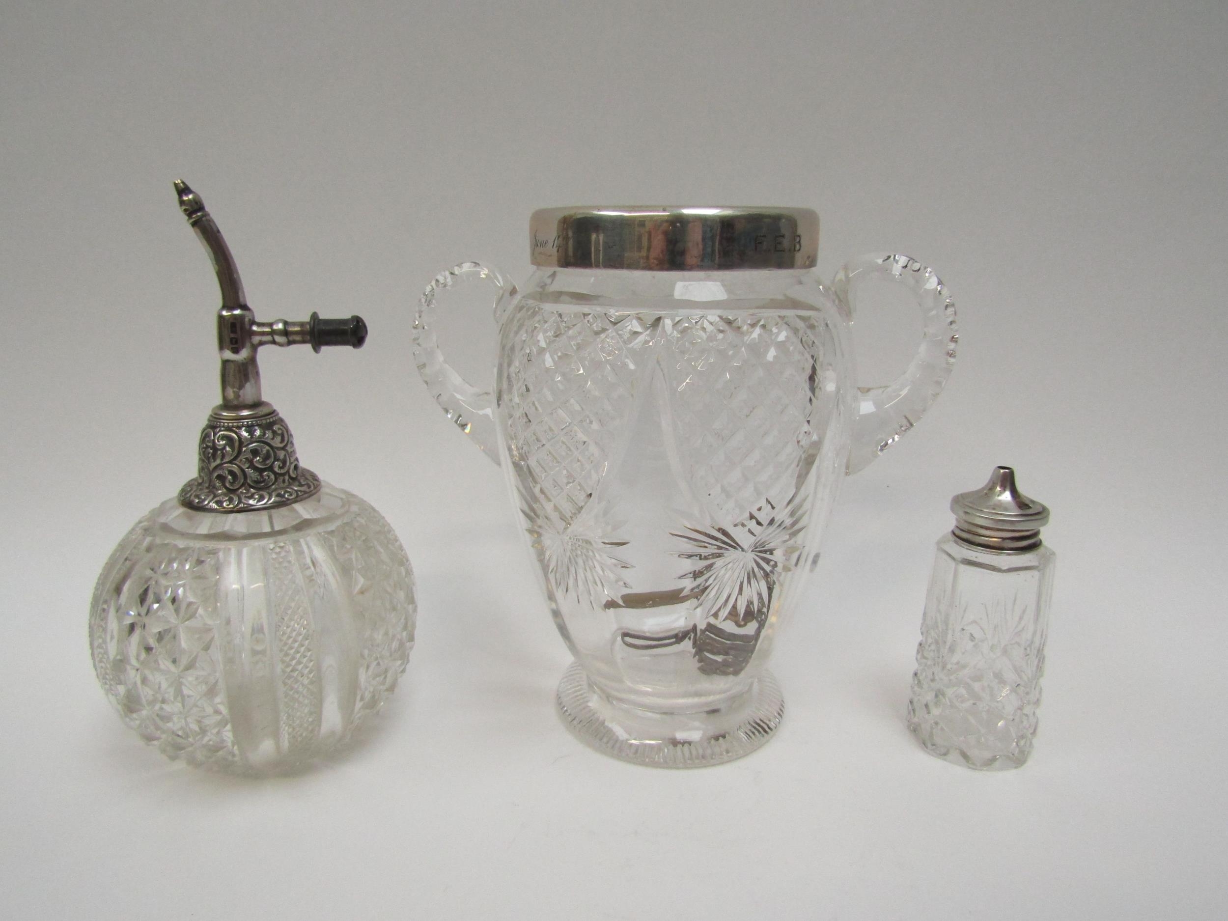 Silver topped vase, pepperette, atomiser and miniature sword (4) tallest 17cm