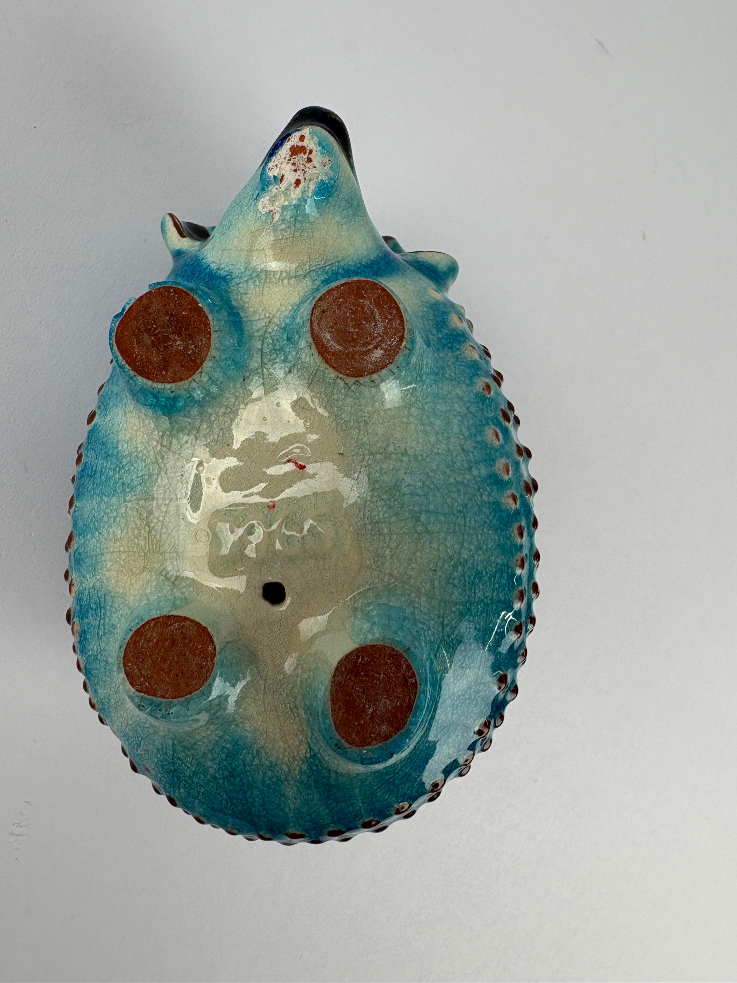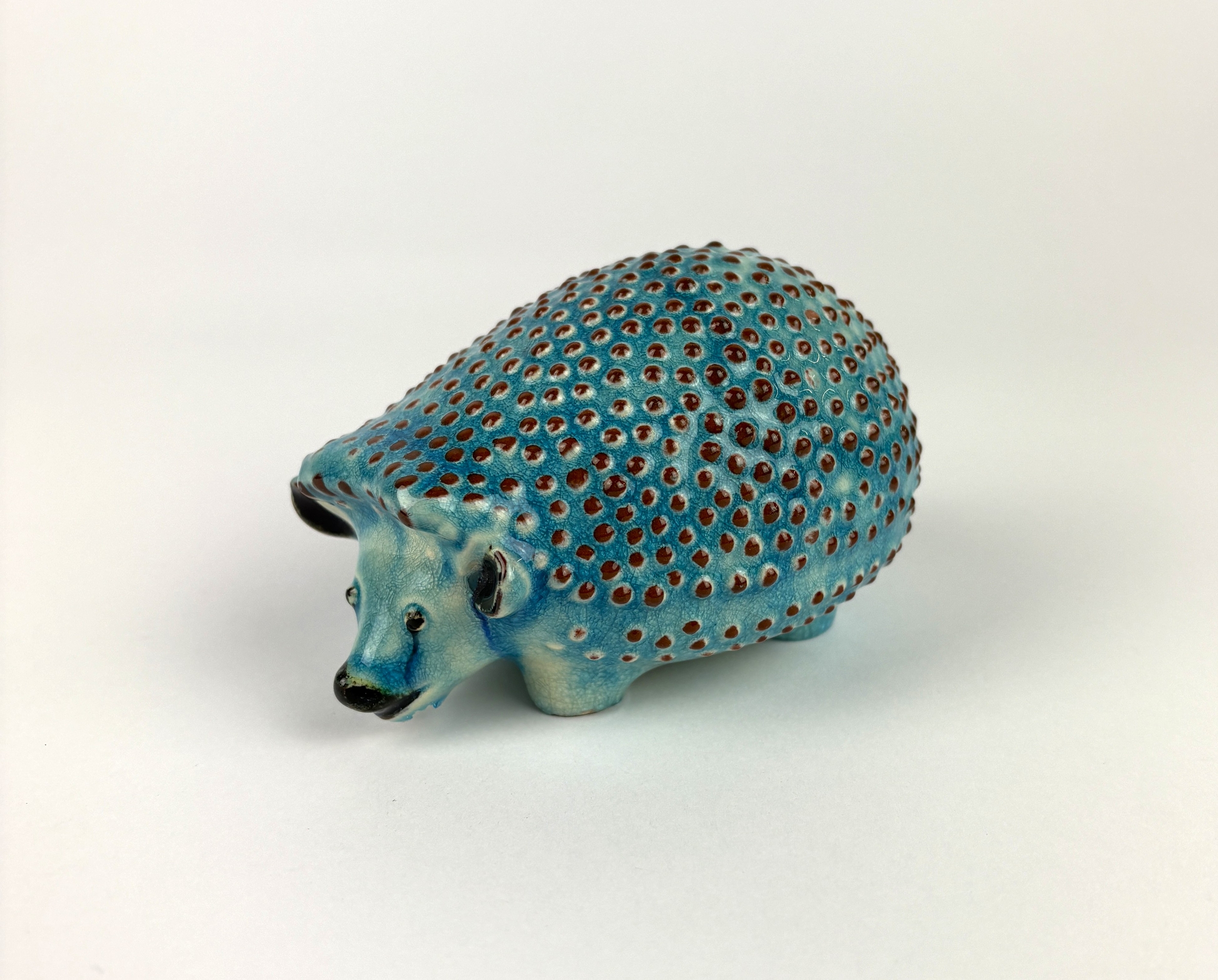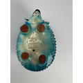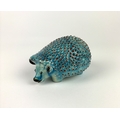 An Egyptian style glazed turquoise pottery model of a hedgehog, marked '3965' to base, 10.5cm long (a/f)