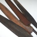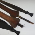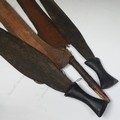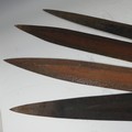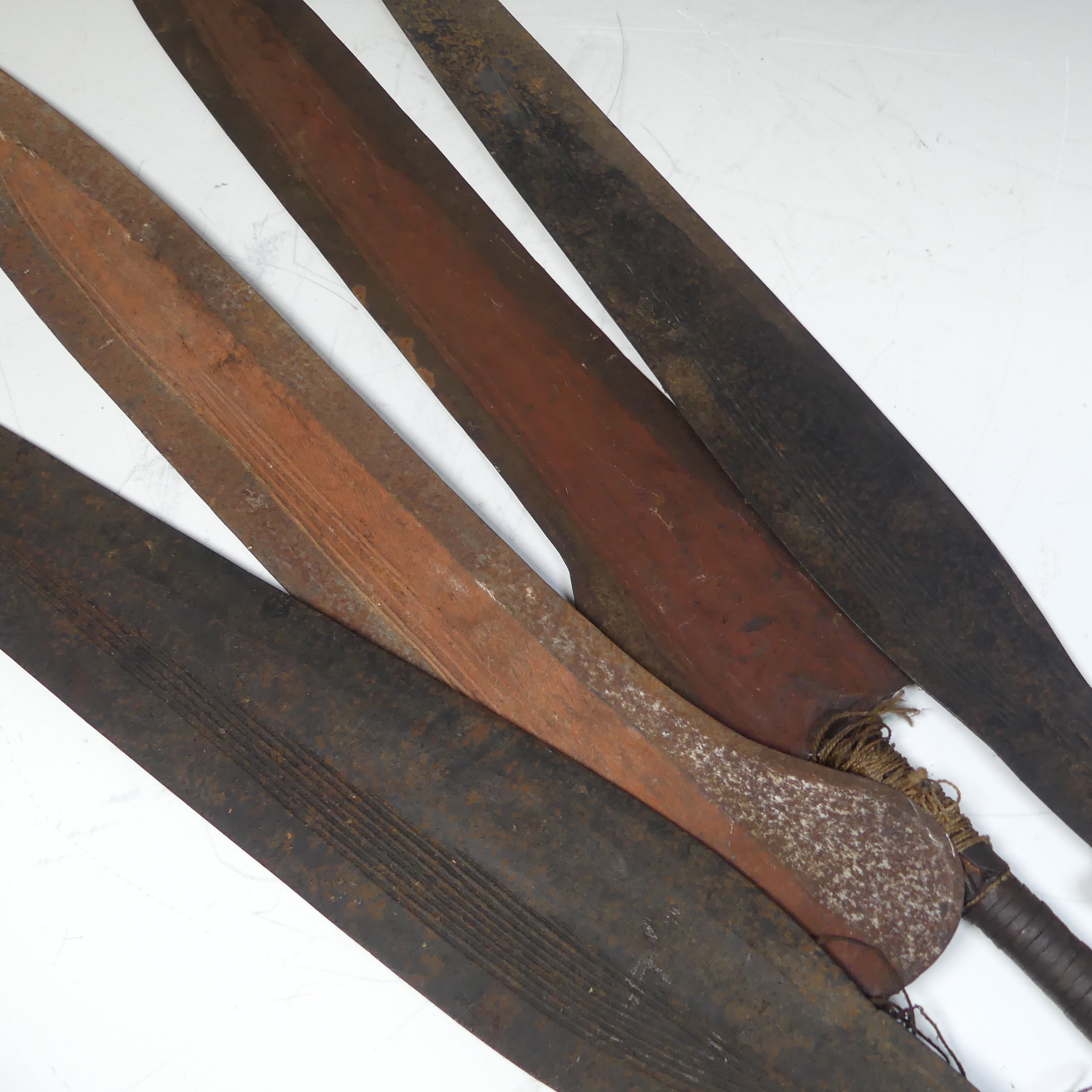 A pair of early 20th century Congolese iron currency spear Heads, with rounded bases, L 82.5 cm, together with another pair of Congolese tribal iron currency spear heads, mounted with handles. (4)