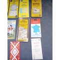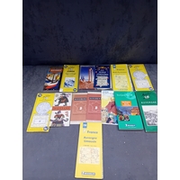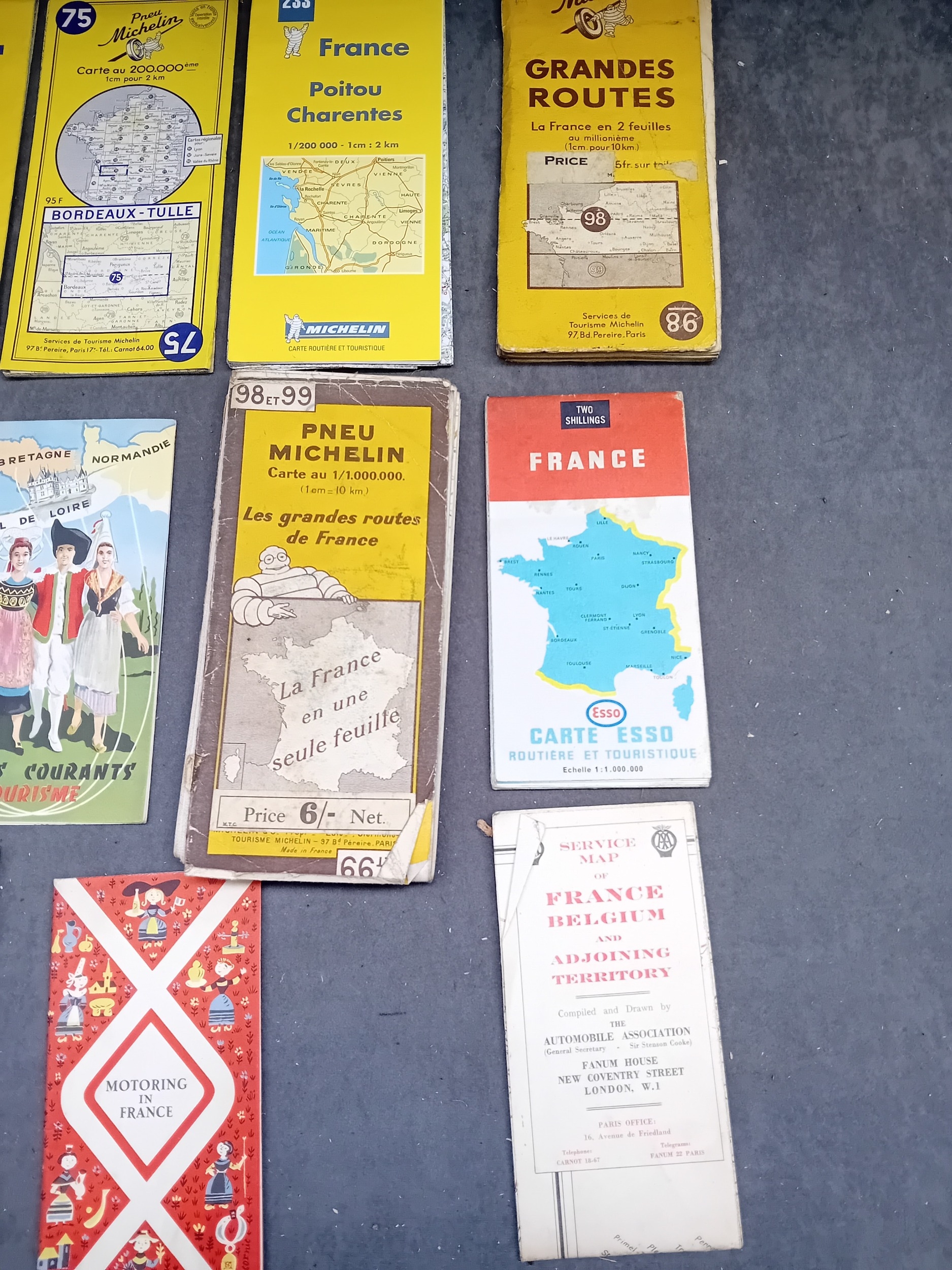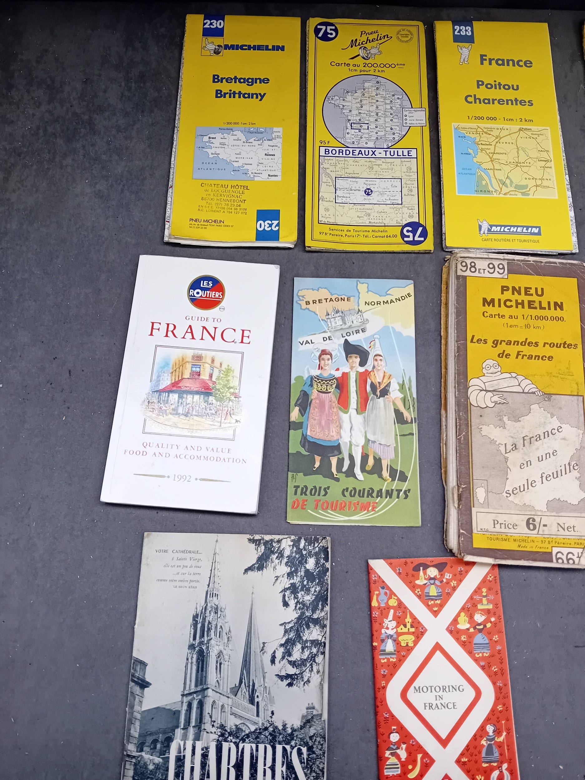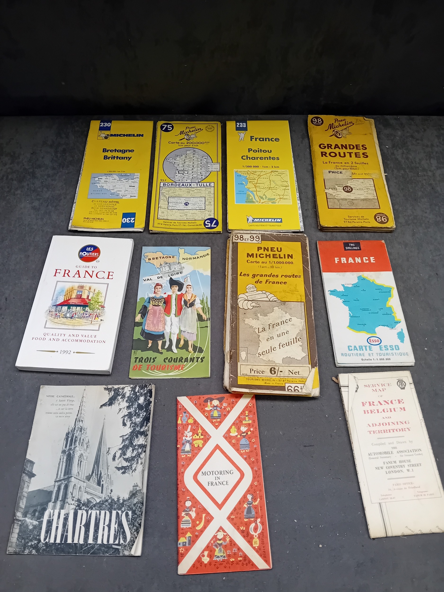 A collection of approximately twelve vintage and later 20th-century paper travel ephemera, primarily maps and guides focused on France. Key items include several vintage Michelin road maps, some featuring "Pneu Michelin" branding and specific regions such as "Bretagne Brittany" (No. 230), "Bordeaux-Tulle" (No. 75), "Poitou Charentes" (No. 233), and "Grandes Routes" (No. 98), with one larger map of "Les grandes routes de France" also marked "98 & 99" and priced at "6/- Net." Also present is an Esso "Carte Routière et Touristique" for France, priced at "Two Shillings, " and a "Service Map" from The Automobile Association covering "France Belgium and Adjoining Territory" priced at "2/6." Additional pieces include a "Les Routiers Guide to France" dated 1992, a "Motoring in France" booklet with stylized illustrations, a pamphlet on "Chartres" cathedral, and a decorative "Val de Loire Normandie" piece titled "Trois Courants de Tourisme" (Three Currents of Tourism). The materials are paper and cardstock.