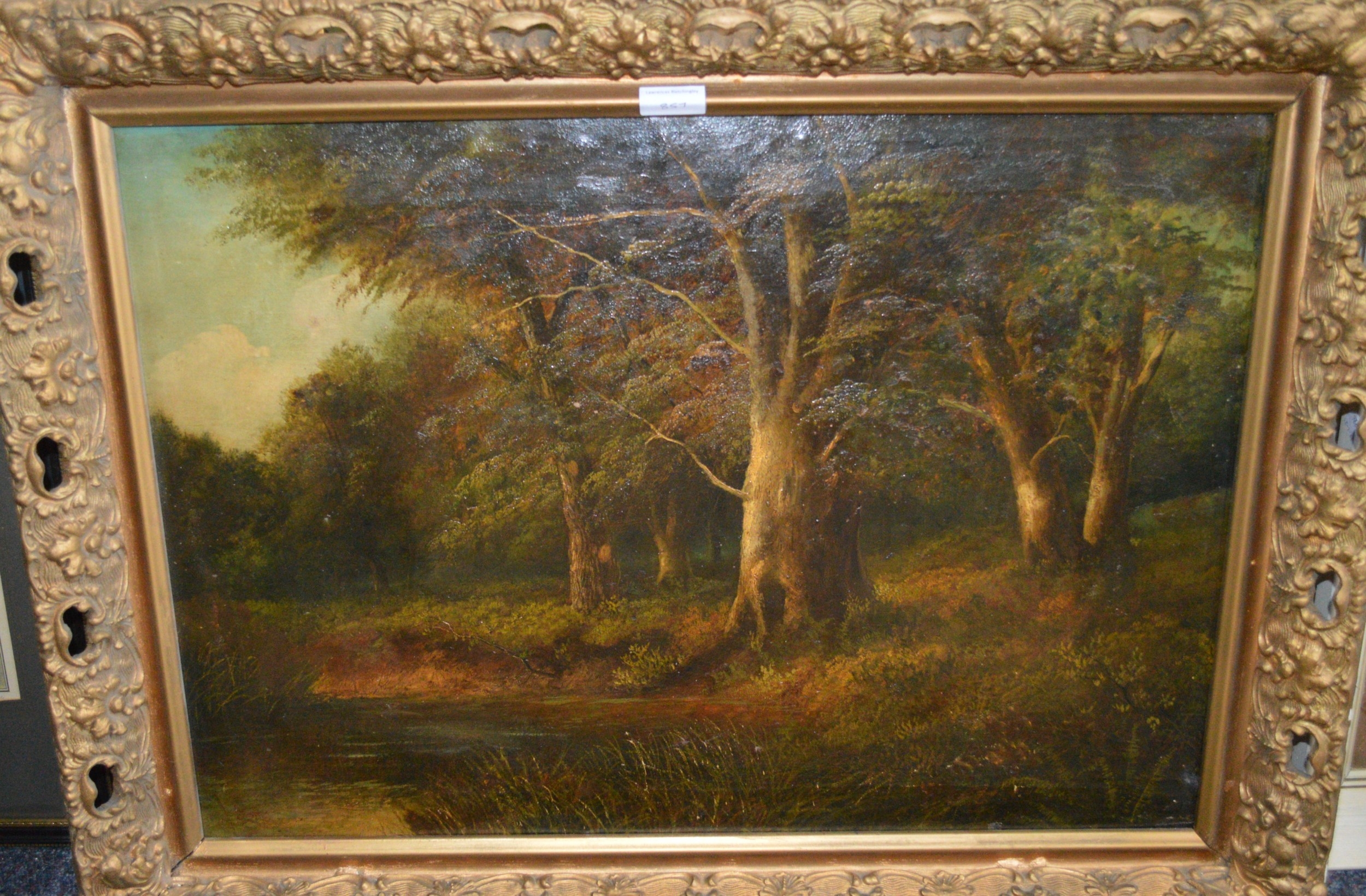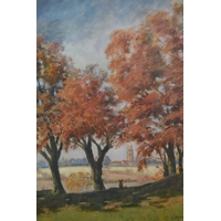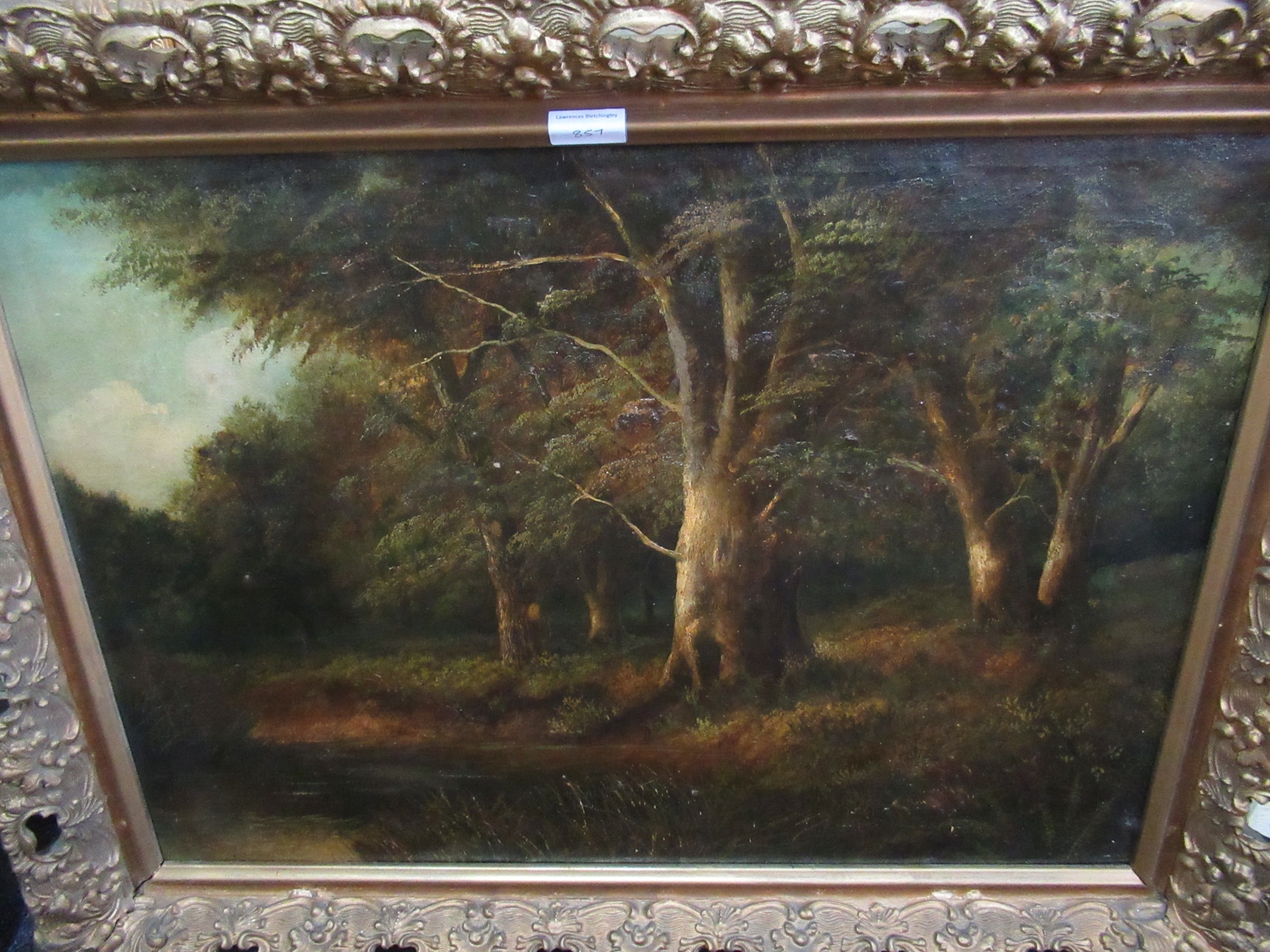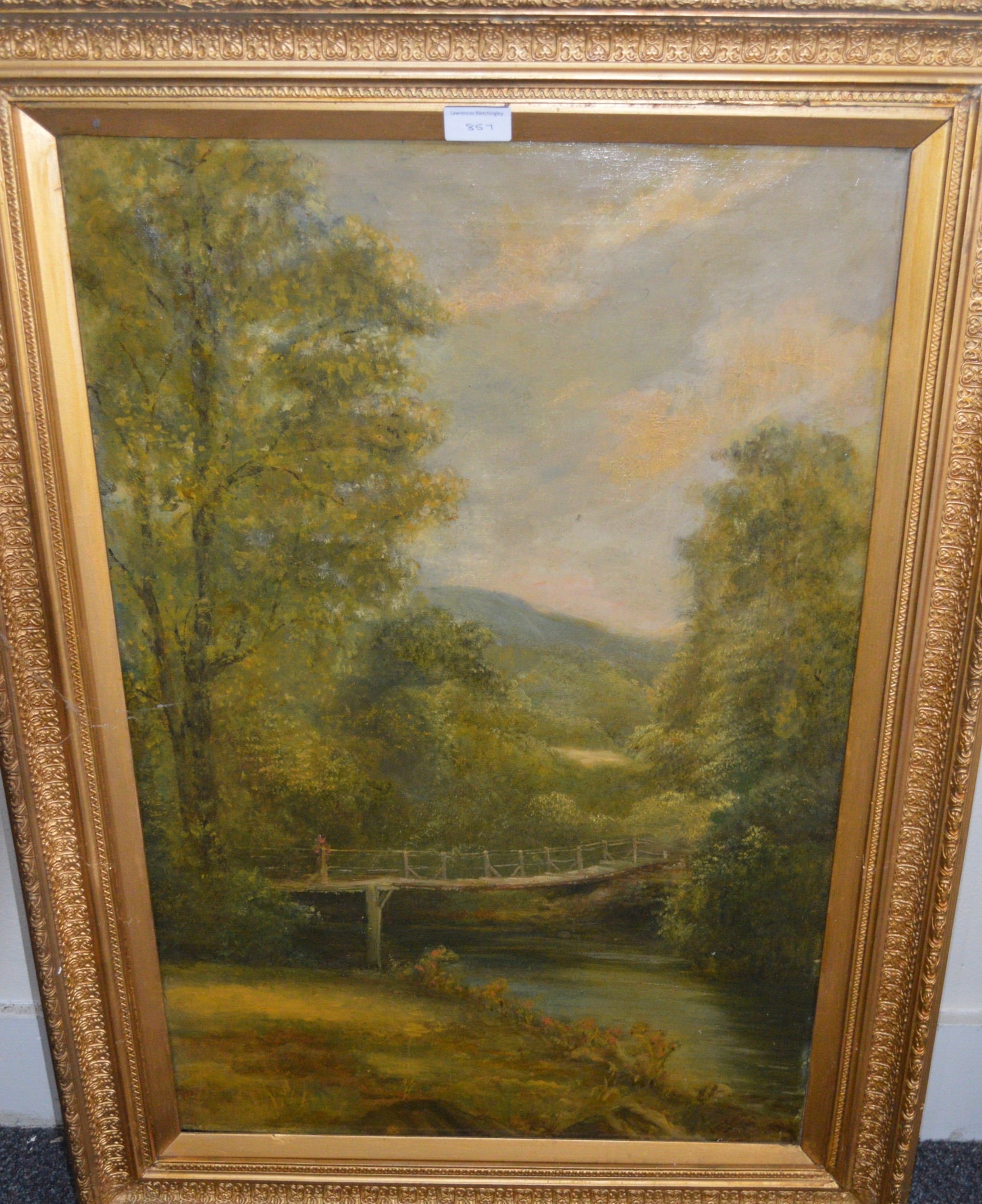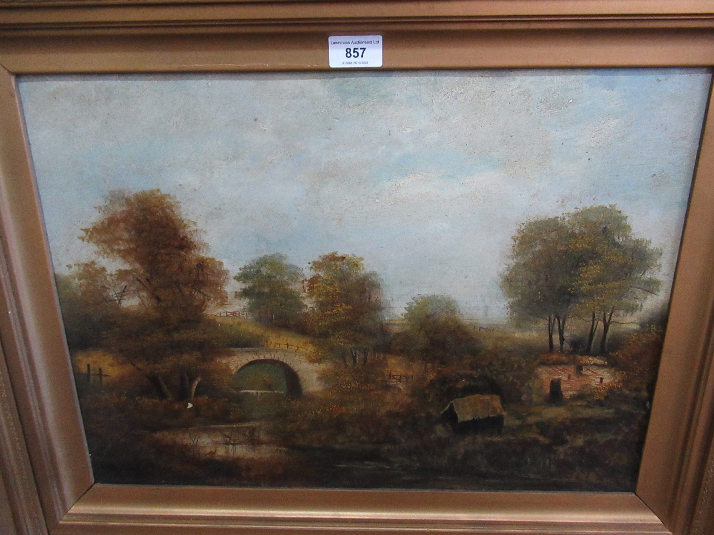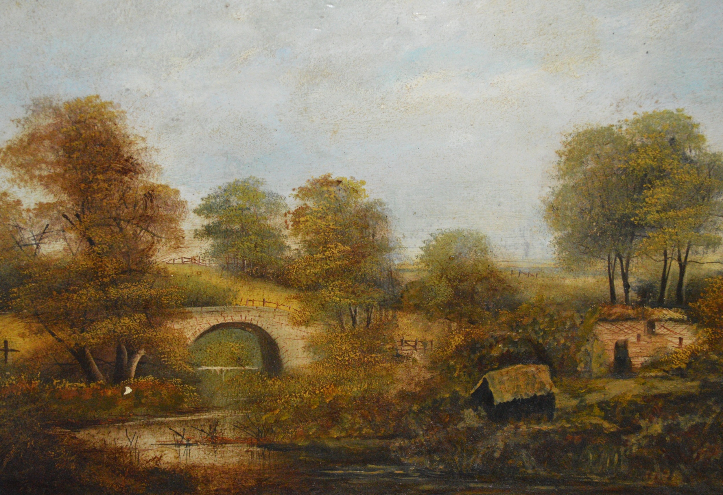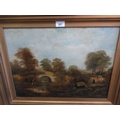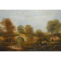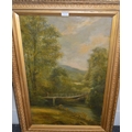 Oil on board, river scene with stone bridge, together with three other oil paintings of landscapes, the largest 76 x 51cm