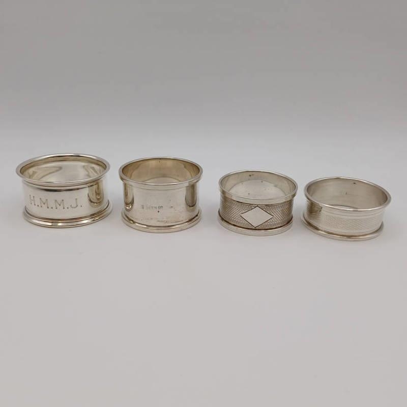 4 SILVER NAPKIN RINGS, BIRMINGHAM 1931, BIRMINGHAM 1936, SHEFFIELD 1944 & 1 MARK RUBBED, 67G