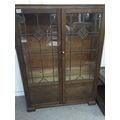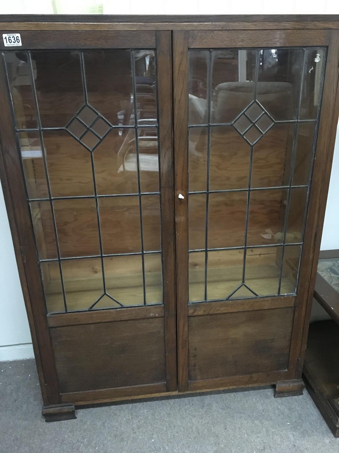 An oak Arts and crafts style lead light glazed bookcase no shelfs has a key. 90cm x 123cm- NO RESERVE
