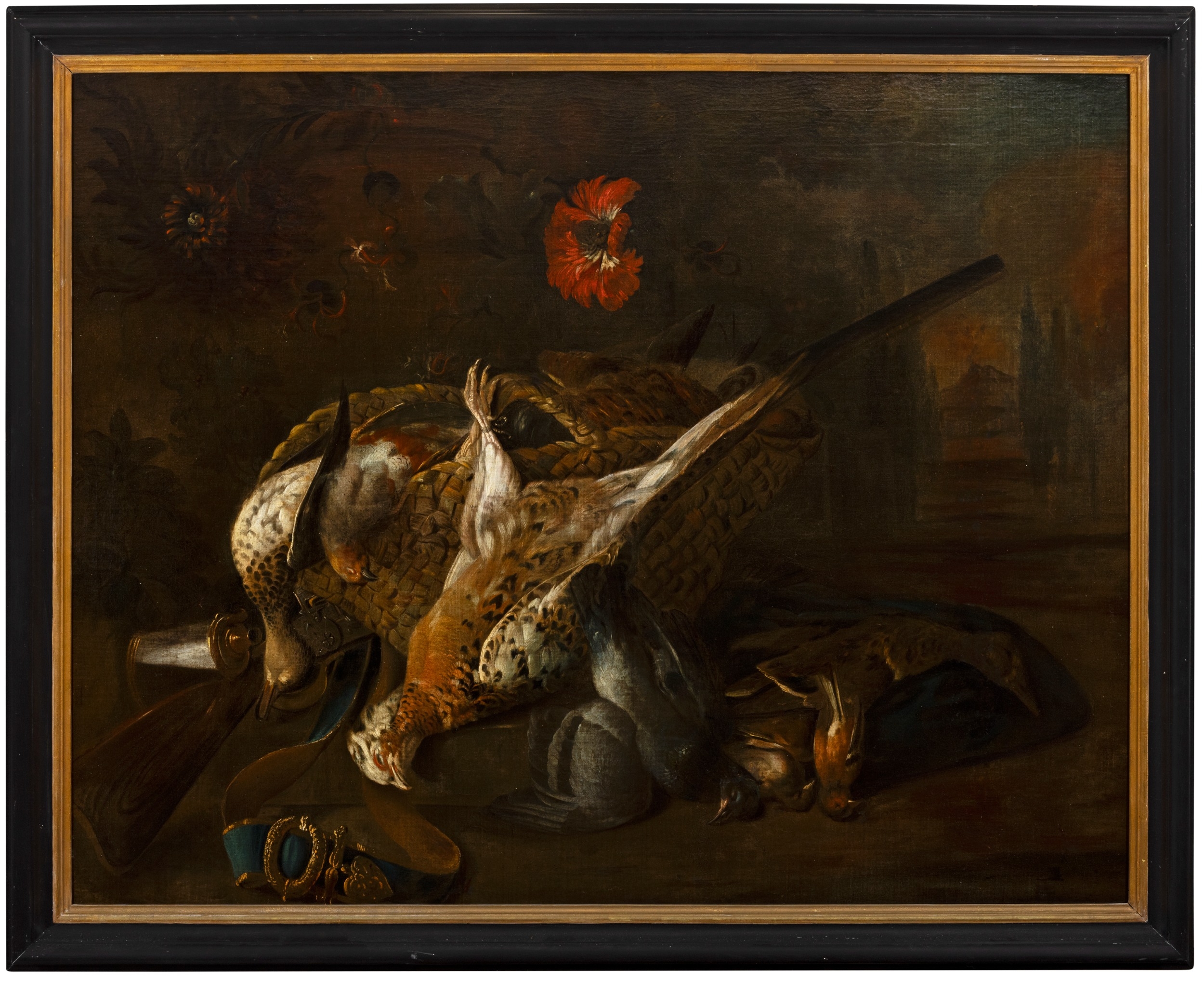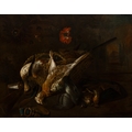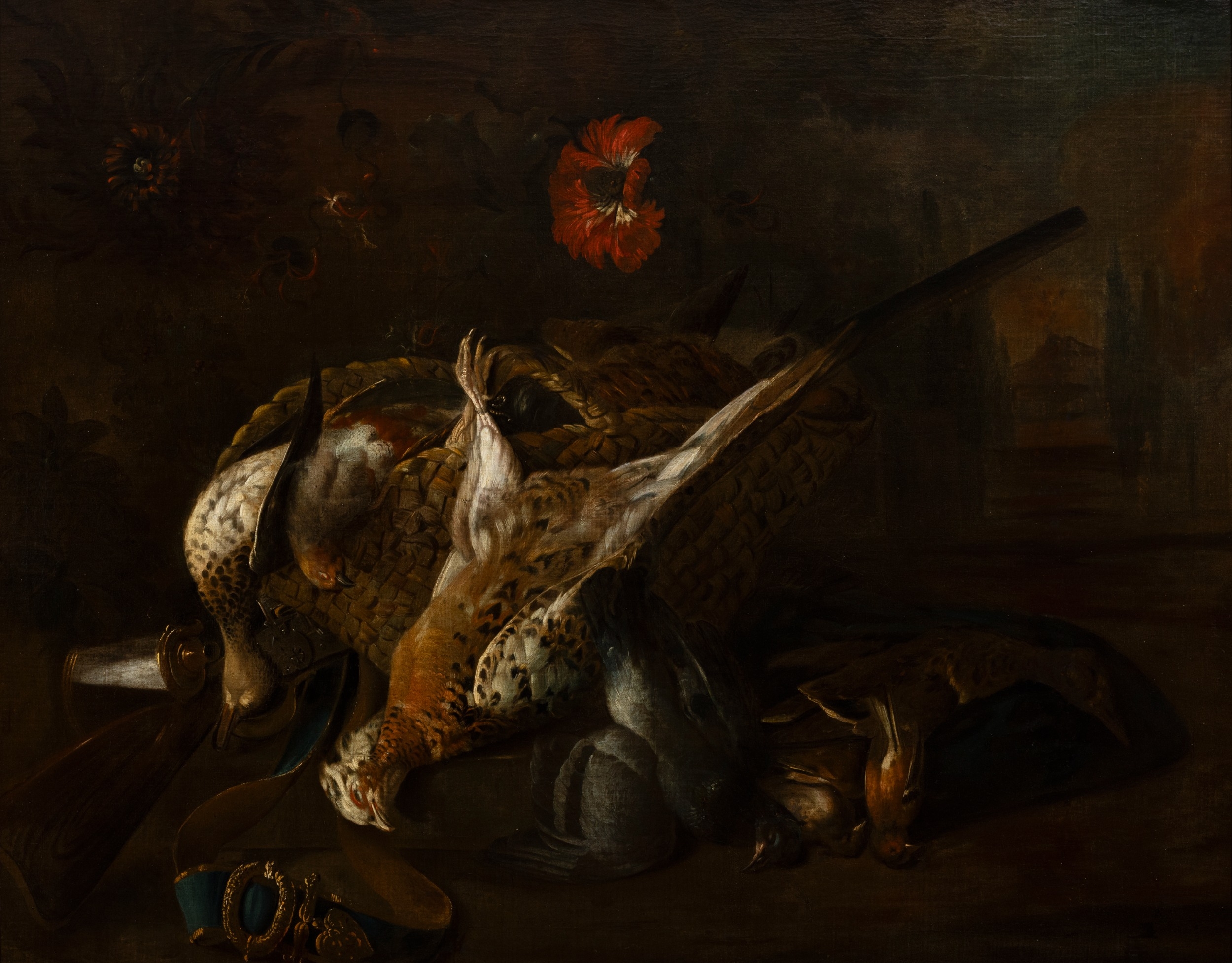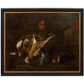 CHARLES COLLINS (c. 1694/1704-1744) Game Still Life with Dead Hare, Bittern, Flintlock and Powder Flask Oil on canvas, 85cm x 110cm Literature: Peter Murray, 'Charles Collins: Of Fruit and Fowl', Irish Arts Review (Winter, 2025) Among the most technically proficient of eighteenth-century Irish artists, Collins is one of the most significant Irish artist to have emerged since the publication of Crookshank and Glin's groundbreaking work The Painters of Ireland (1978). Although mentioned by Strickland as working in Ireland, he had fallen into obscurity and by 1981 when his striking Lobster on a Delft Dish was purchased by the Tate Gallery in London the little that was known about his life was confused. Collins has since been reclaimed for the Irish school, most recently in a article by Peter Murray ('Charles Collins: Of Fruit and Fowl', Irish Arts Review (Winter, 2025)) and he is acknowledged as one of the most accomplished artists to have worked here in the early and middle years of the eighteenth century. He is of further interest, as Dr Murray notes, as one of the only major figure of the period consistently to explore the genre of still-life in oil. George Vertue referred to him as a 'bird painter', although also noting a self-portrait, while Horace Walpole described him as a painter of 'all sorts of fowl and game'. Certainly game predominates in Collins's oeuvre, as is evident in the 1730 still-life in the National Gallery of Ireland, a work very much in the Dutch tradition of seventeenth-century artists such as Jan Weenix, Franz Snyders and Jan Fyt and it has been suggested by Nicola Figgis that Collins may have pursued a period of training in the Low Countries (A.A.I, 2, p. 212) Collins seems to have been born in Dublin. He is mentioned (and described as an 'Irish Master') in the Dublin Evening Post for 4 May 1786 in connection with the sale of the Merrion Square collection of the doctor, and property developer, Gustavus Hume, president of the Royal College of Surgeons in which a still-life of the same sort as the present work featured: 'there are also two pictures most admirably executed; one of live fowl, the other a dead hare, dead birds etc., which is allowed by the first judges in point of elegance and performance, to be inferior to none'(Dublin Evening Post, 4 May 1786). A further still-life was included in the collection of James Digges La Touche that was auctioned in Geminiani's rooms in Dublin in May 1764, while the Earls of Kildare of Carton also owned an example of his art. The present work relates closely to a comparable still life with which it shares many of the same elements (Adams, Irish Old Masters, 5 November 2024, lot 44). However, here there is greater emphasis on the gun and its paraphernalia including a power flask and a blue shoulder belt with an elaborate gilt buckle. The prominent red opium poppy 'toxic to humans and animals' (ibid.) features in many other of Collins's work and, as Peter Murray has recently noted, acts a signature motif, while also perhaps adding a hint of symbolic resonance.