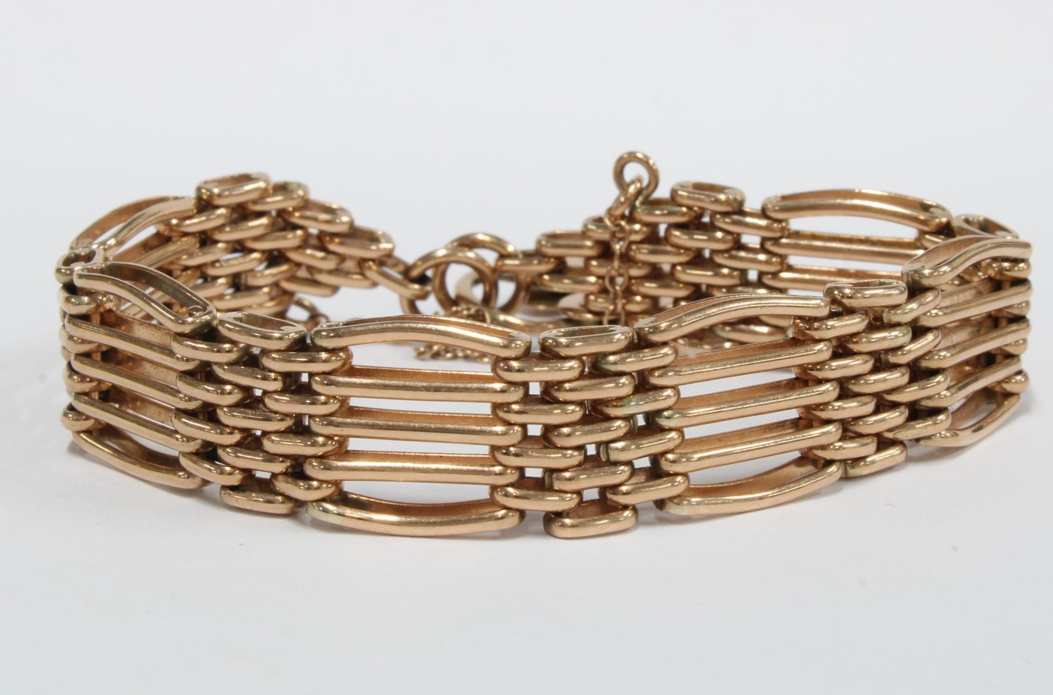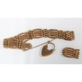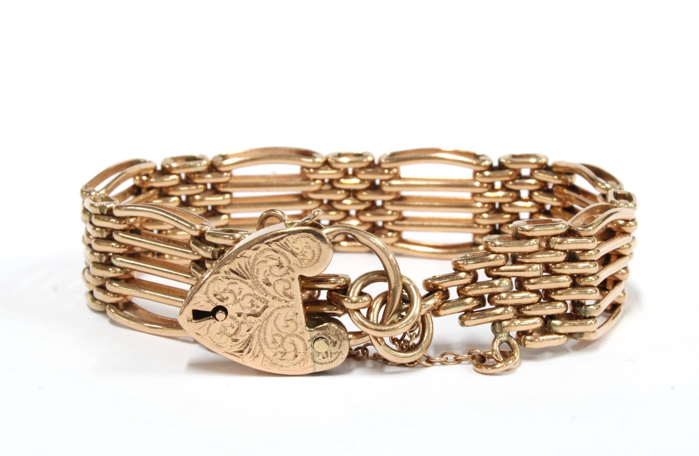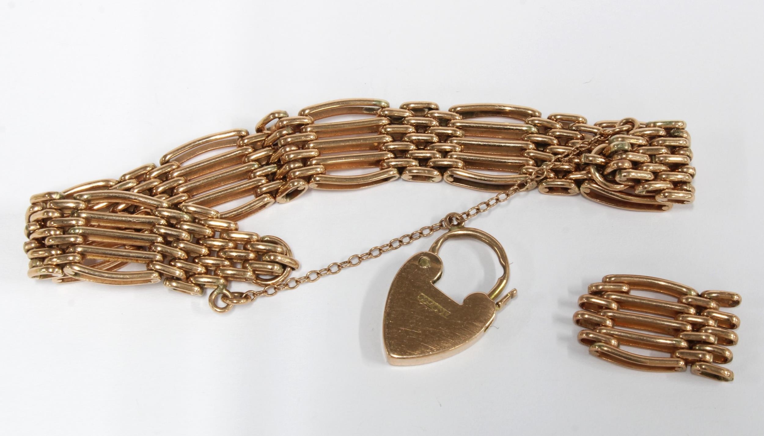 9ct rose gold gatelink bracelet with an engraved 9ct gold heart shaped padlock, hallmarks for Sheffield 2000, with one loose five row section,