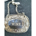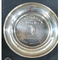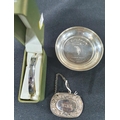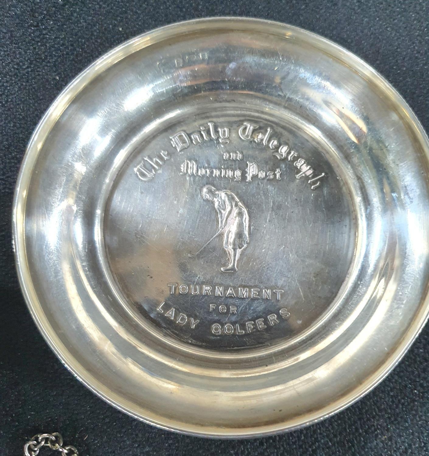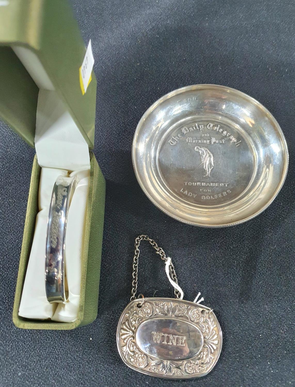 Silver golfing pin dish together with an engraved silver bangle in its own presentation box and a silver plate decanter label "Wine" (3)