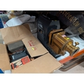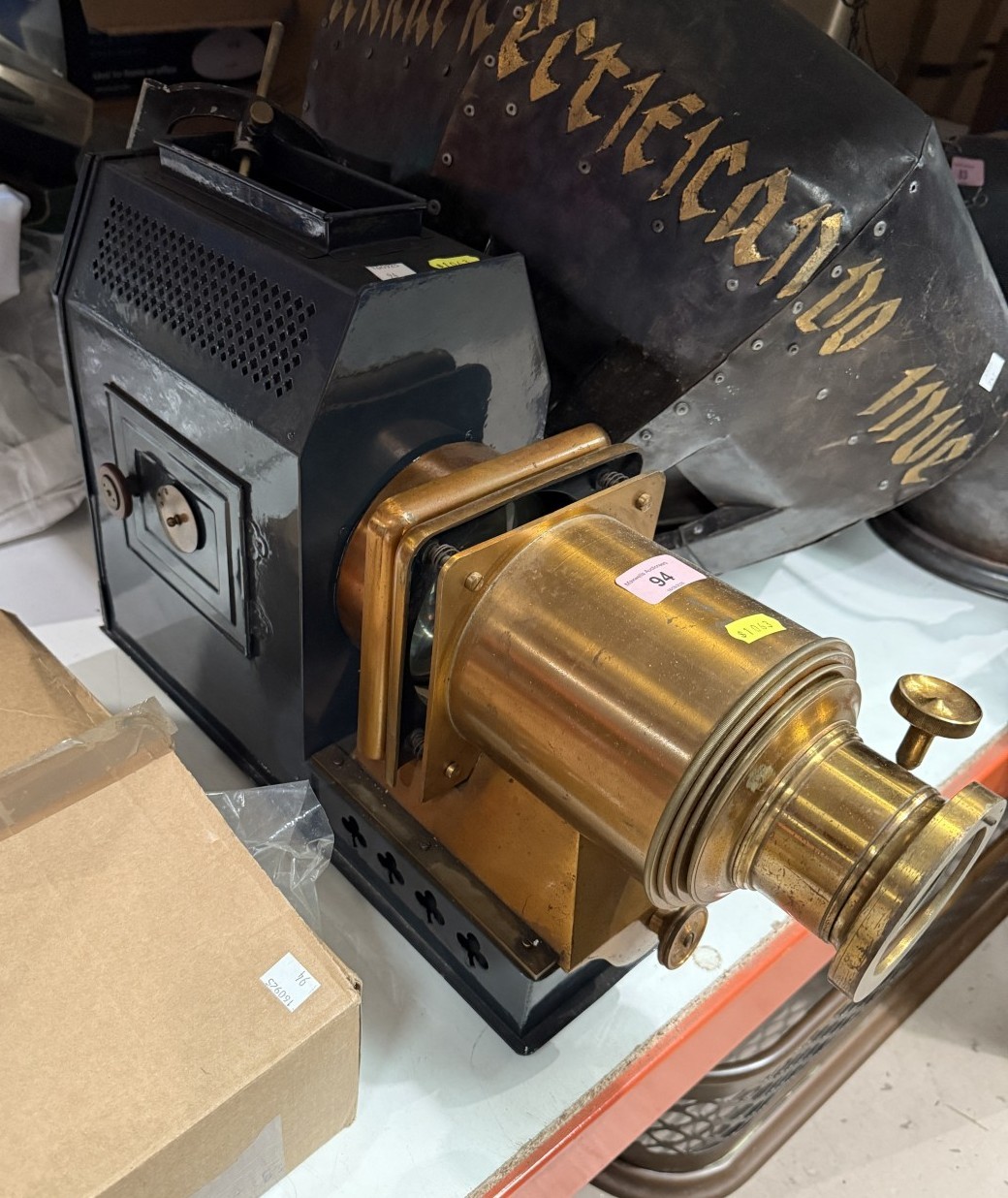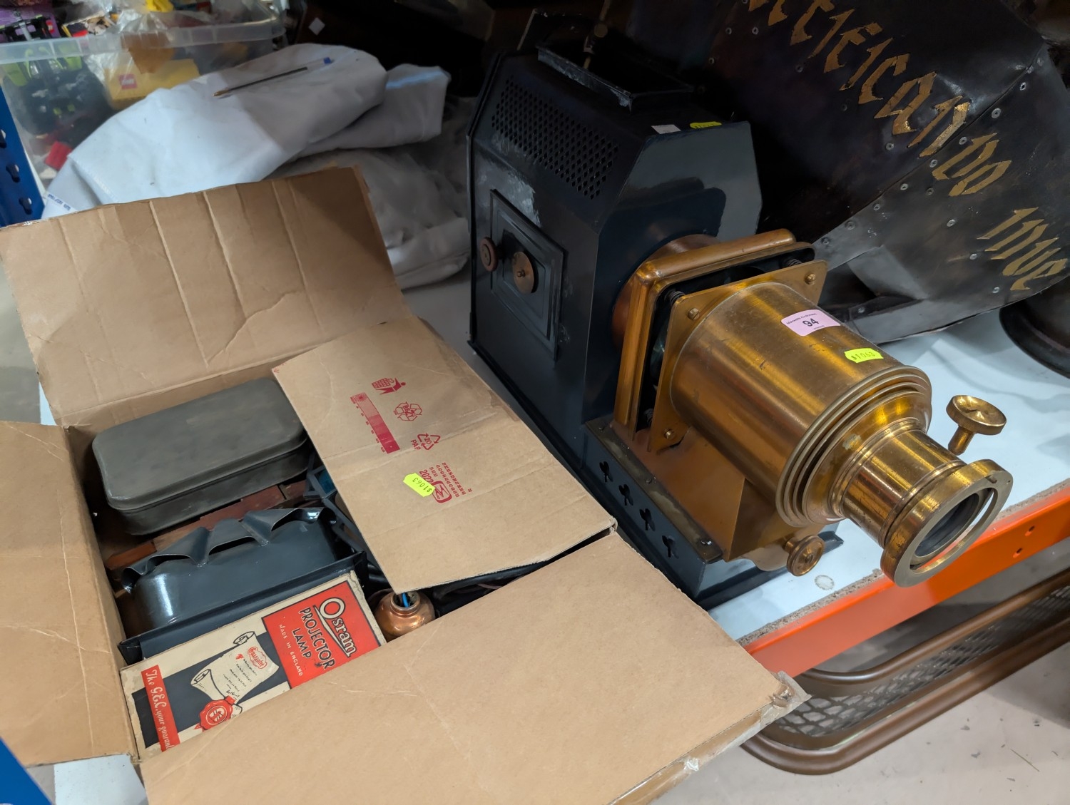 A Victorian metal magic lantern with accessories.