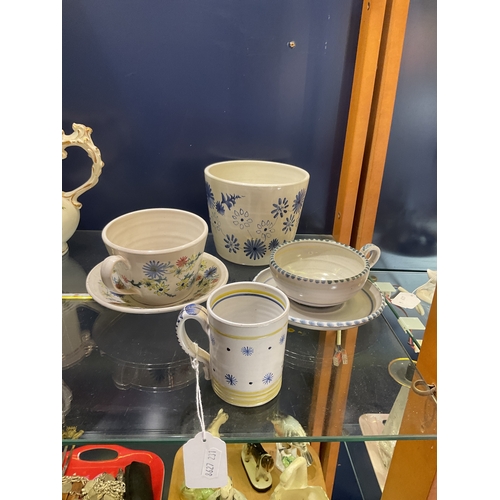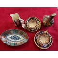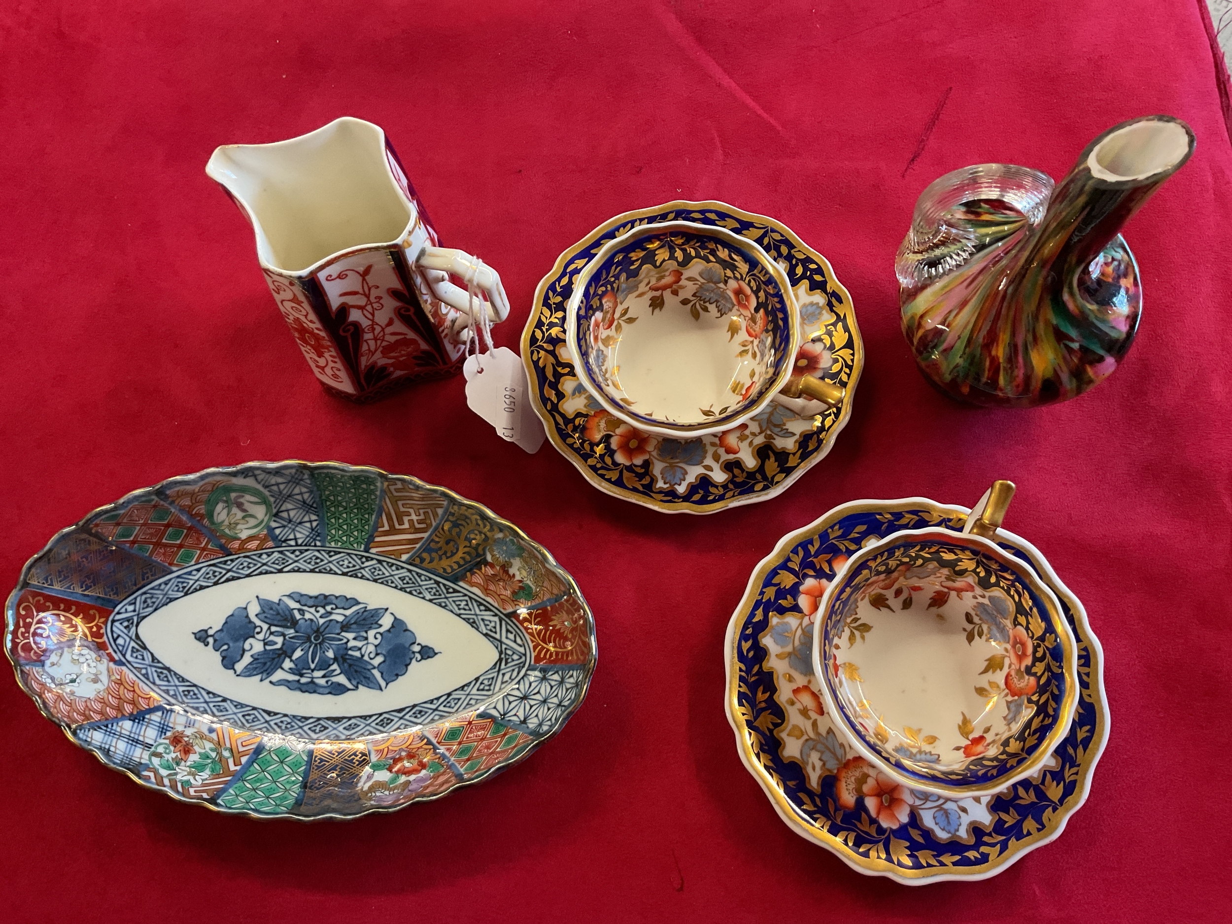 A selection of china to include two cups and saucers, milk jug, coloured glass vase, Japanese oval dish